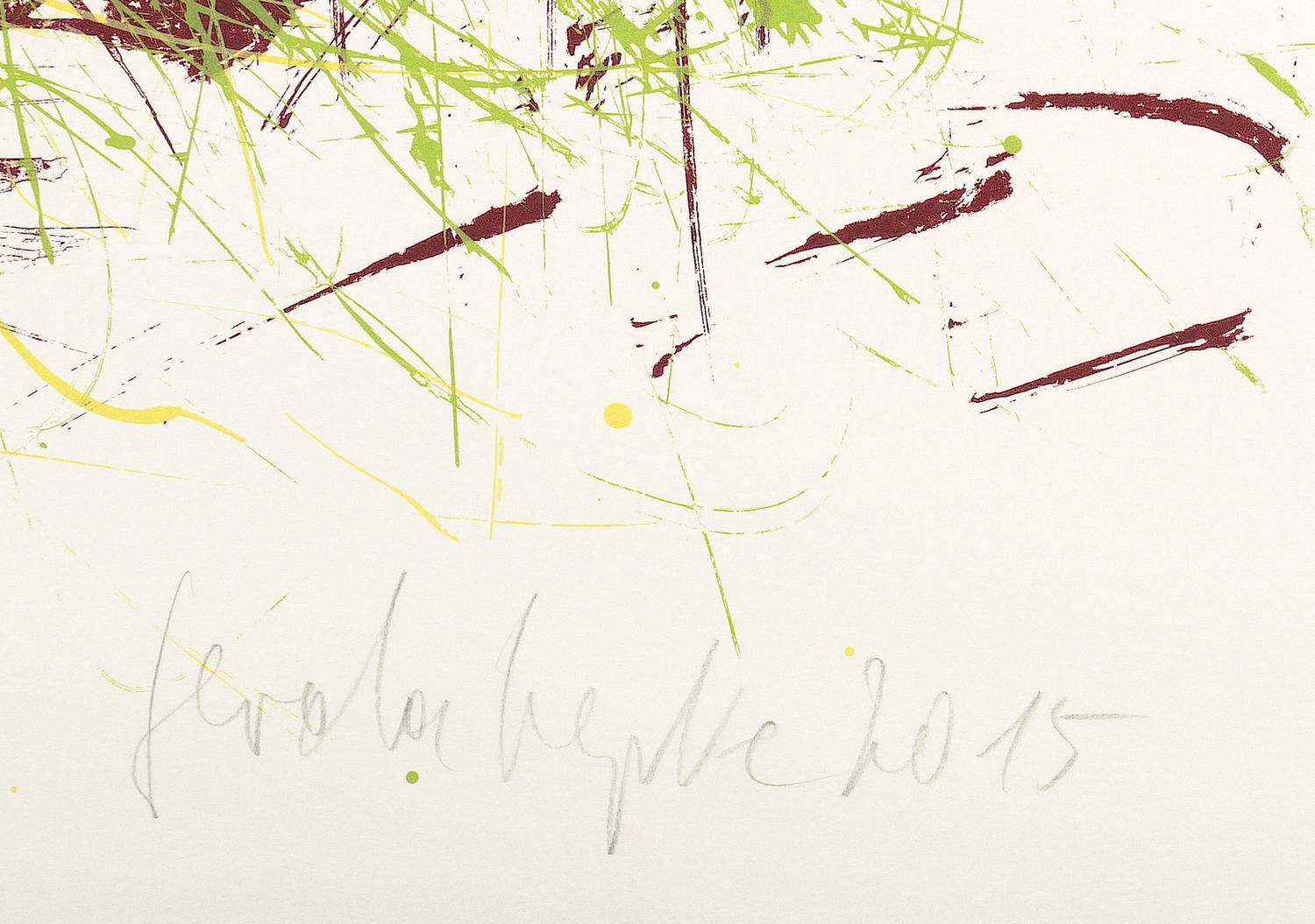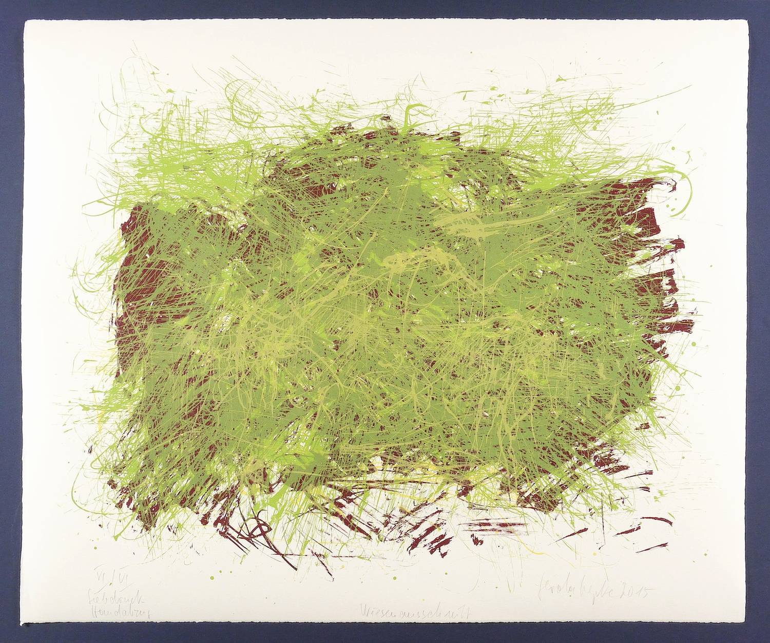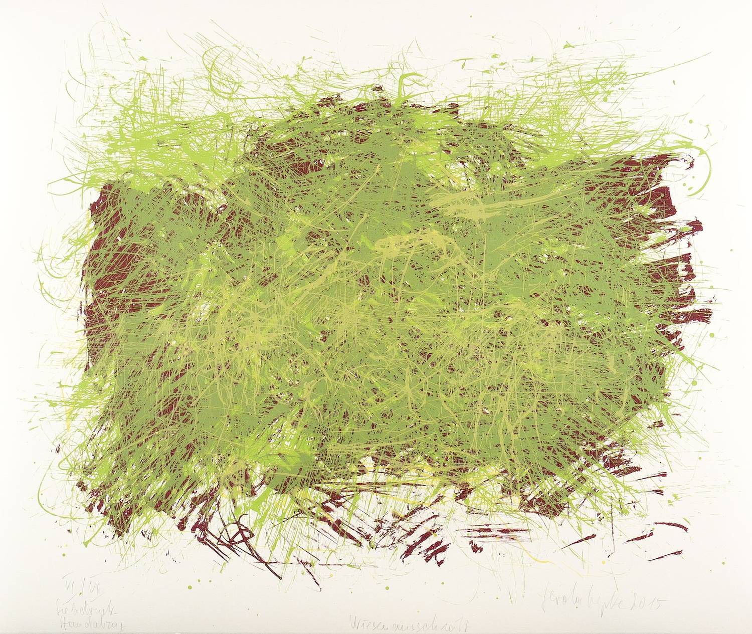 2015. Farbsiebdruck / Farbserigrafie, in Rotbraun, Grün & Gelb, auf weißem Büttenpapier. – Originale Künstlergrafik, von Gerda Lepke. – Auflage Exemplar Nr. VI/VI. – 58,5 x 70,5 cm (Darstellung / Druckbild), 64 x 76,5 cm (Blatt).