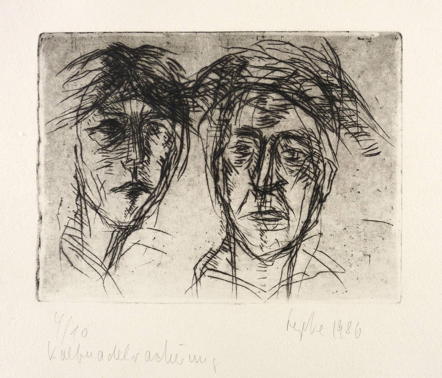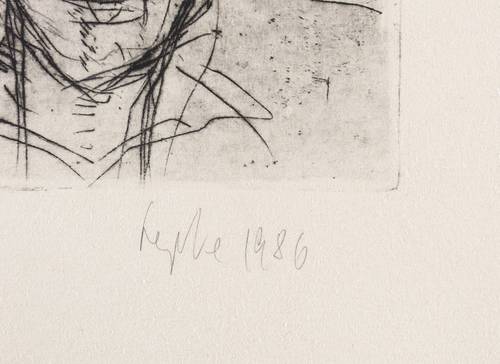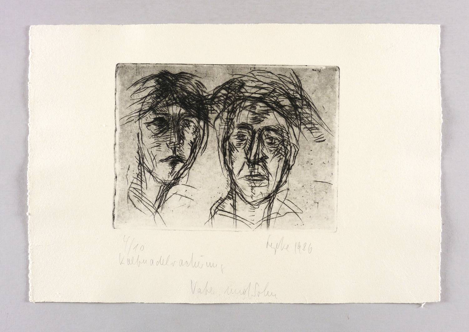 Rechts unten in Bleistift signiert und datiert: ″Lepke 1986″. Links Auflagenbezeichnung: ″4/10″. Darunter Technikbezeichnung: ″Kaltnadelradierung″. Im unteren Blattrand Titel: ″Vater und Sohn″. – Sehr guter Zustand.