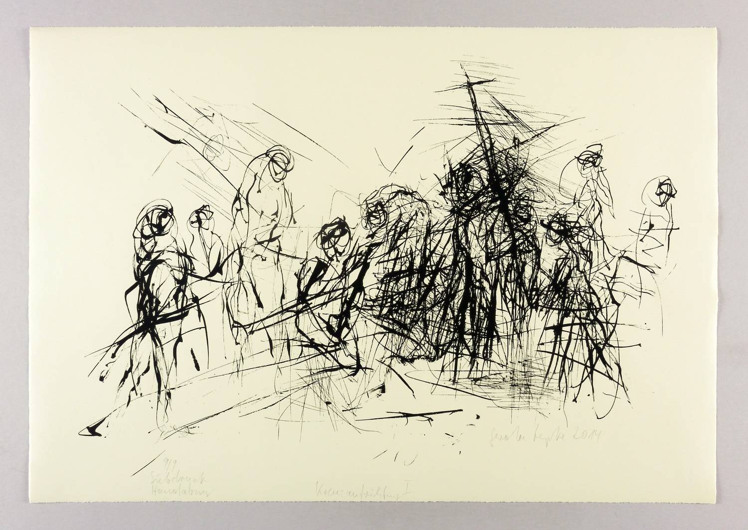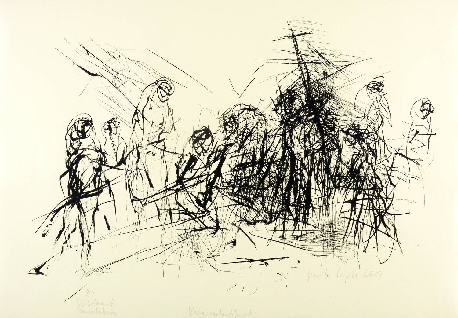 Rechts unten in Bleistift signiert und datiert: ″Gerda Lepke 2014″. Links Auflagenbezeichnung: ″9/9″. Dazu bezeichnet: ″Siebdruck / Handabzug″. Im unteren Blattrand Titel: ″Kreuzaufrichtung I″. – Tadellos. Sehr guter Zustand.