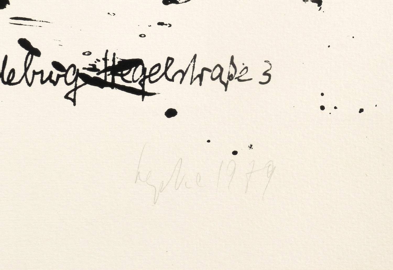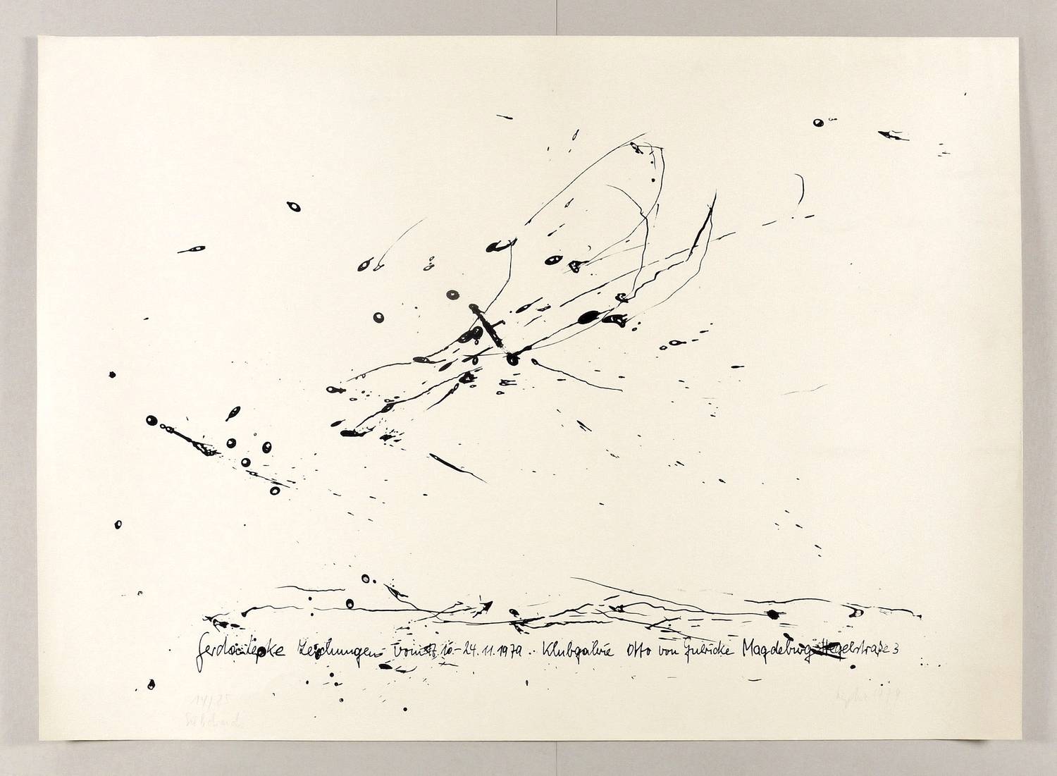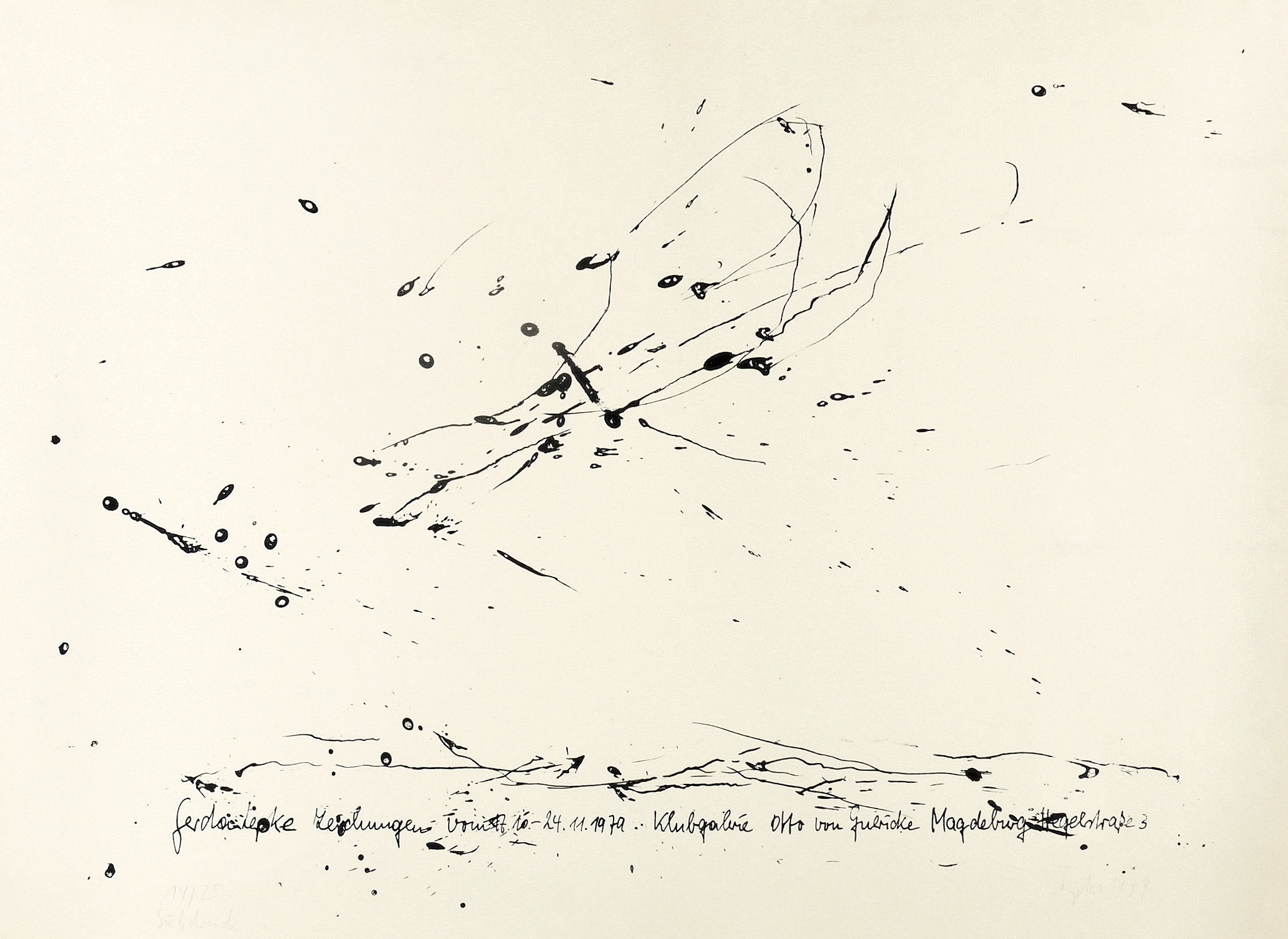 Rechts unten in Bleistift signiert und datiert: ″Lepke 1979″. Links Auflagenbezeichnung: ″14/25″. Dazu Technikbezeichnung: ″Siedruck″. – Originalgrafisches Plakat zur Ausstellung ″Gerda Lepke. Zeichnungen″ in der Klubgalerie Otto von Guericke in Magdeburg 10.-24.11.1979. – Guter Zustand.