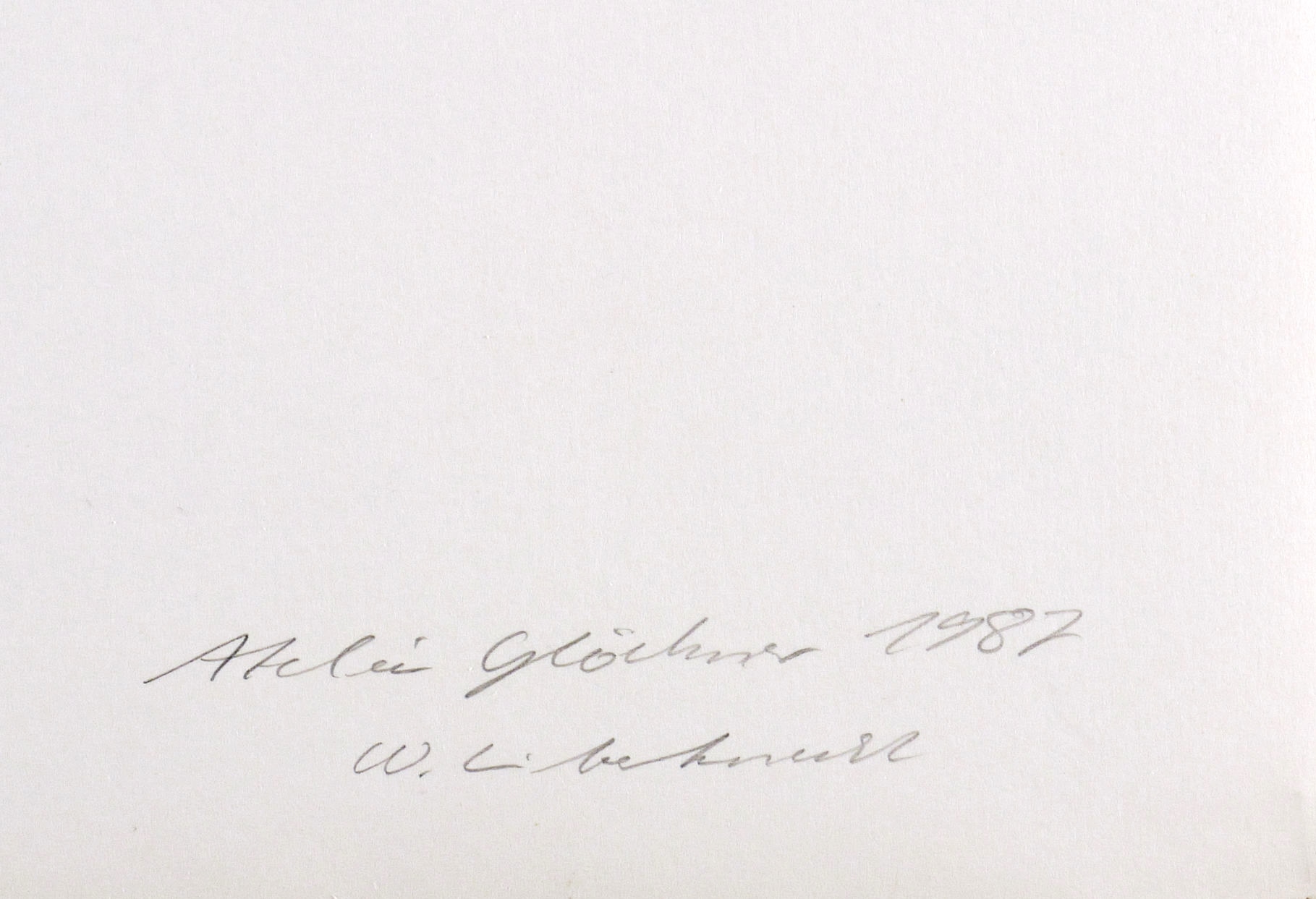 Verso in Bleistift signiert, bezeichnet und datiert: ″Atelier Glöckner 1987 / W. Lieberknecht″. Weiter bezeichnet. – Aus der 1987 entstandenen Serie zu Hermann Glöckners Atelier im Künstlerhaus Loschwitz (Dresden). – Ohne Mangel. Hervorragend erhalten.