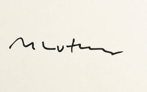 Verso in Faserstift signiert: ″M Luther″. Dazu ausführlich bezeichnet: ″Cogito, ergo sum. / Staub zu Staub. / 12/25 / M Luther / E = mc² | 2. Effekt / Einheitliche Feldtheorie″. – Ohne Mängel. Sehr guter Zustand.