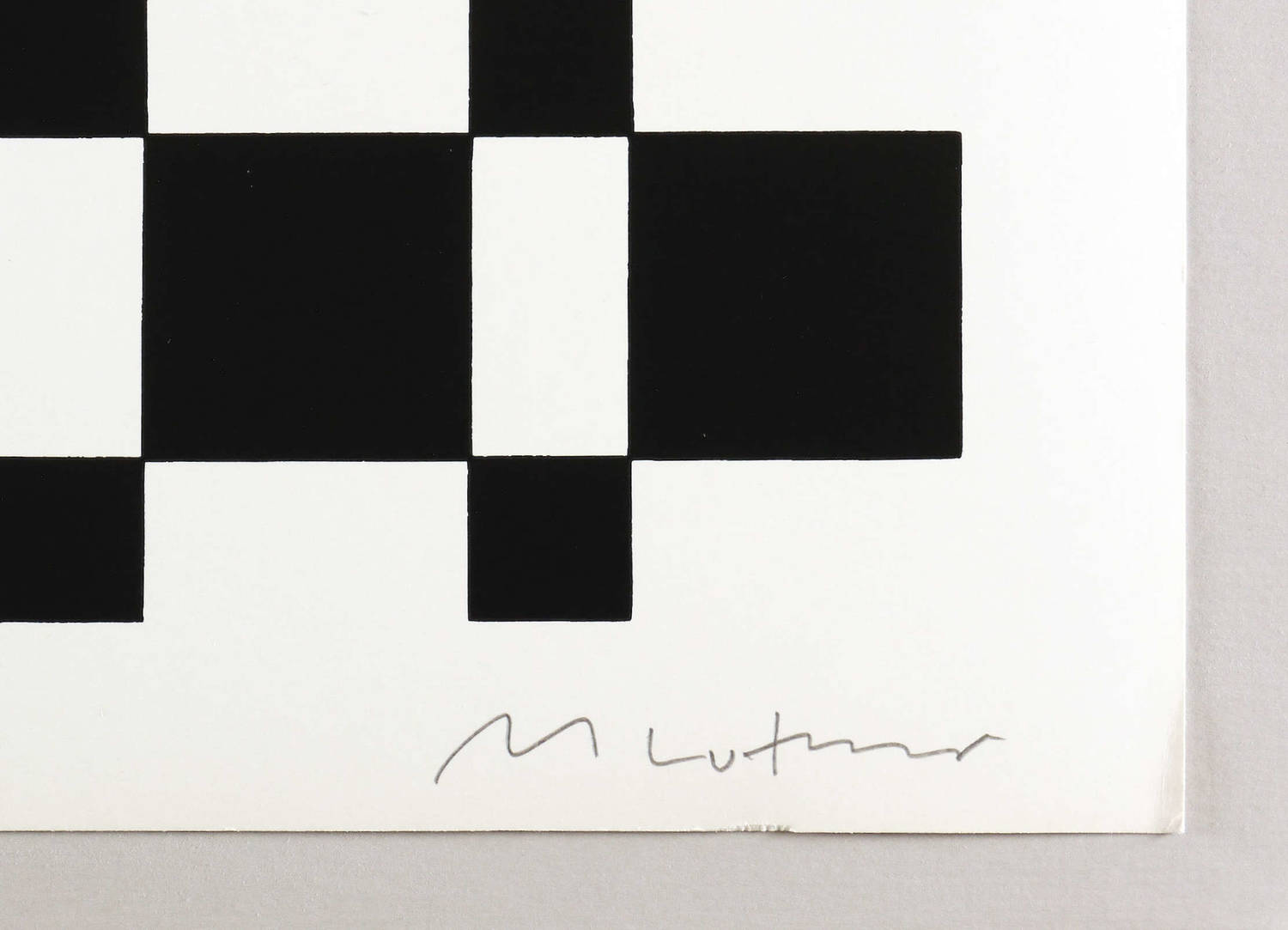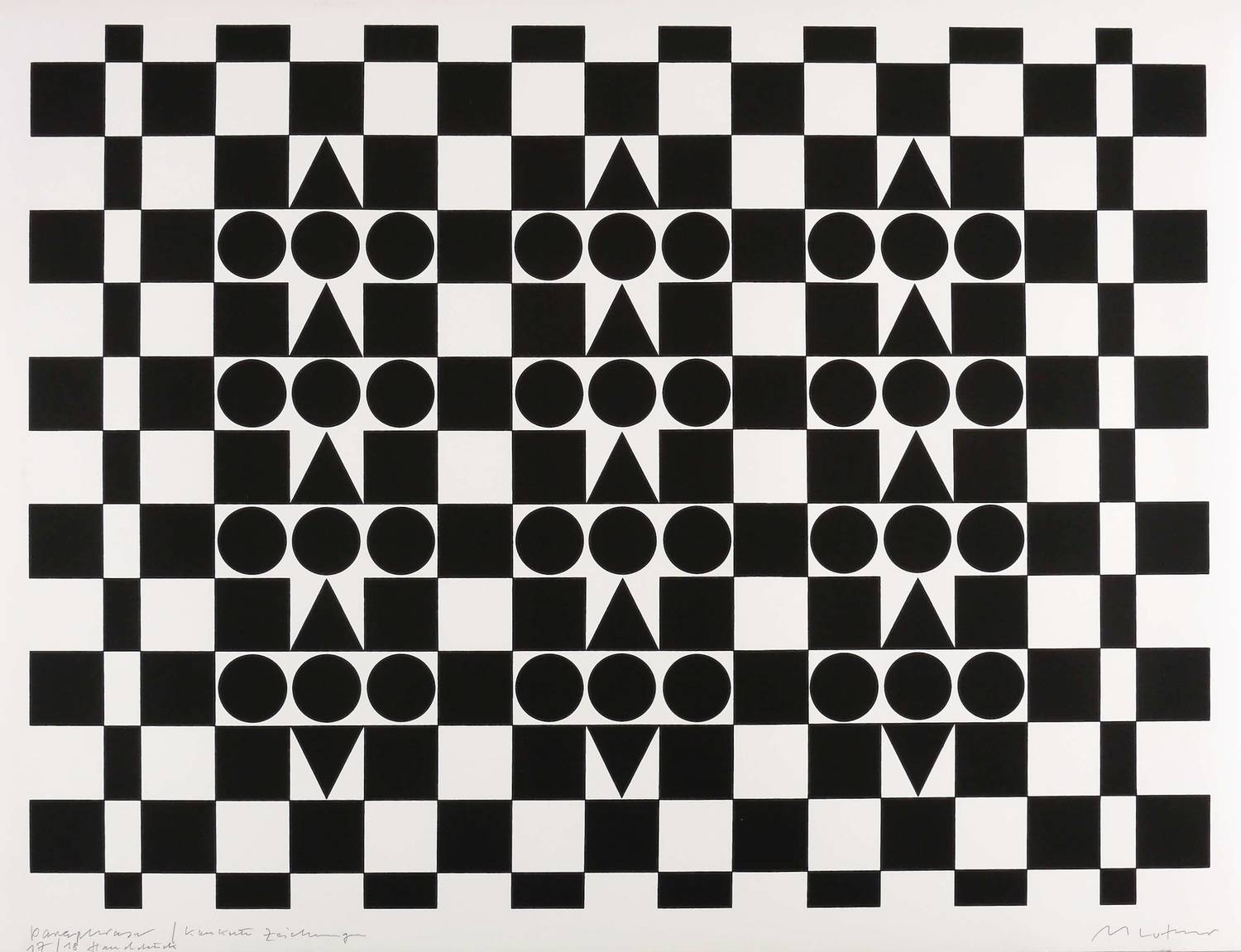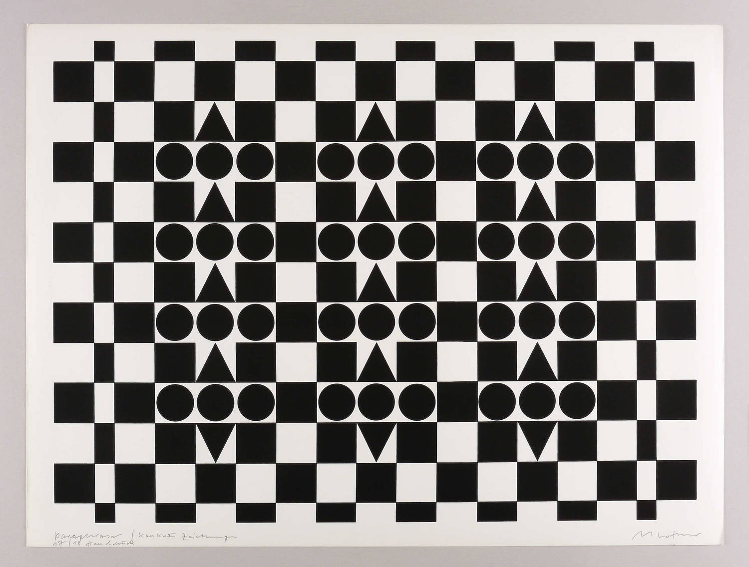 Rechts unten in Bleistift signiert: ″M Luther″. Links Titel und Auflagenbezeichnung. – Handdruck des Künstlers. – Die ″Paraphrasen″ ordnen als Teil der Werkgruppe ″Idee Konkrete Zeichnungen″ deren Formenvokabular neu, um dessen unausschöpfliches Kombinationspotential anzudeuten. – Sehr guter Zustand.