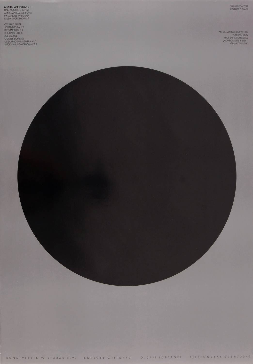 Nicht handsigniert. In der Darstellung Inschrift. – Grafisches Künstler-Plakat zum Musik- Workshop ″Musikimprovisation und konkrete Kunst″ des Kunstvereins Wiligrad e.V. am 21. Mai 1993 im Schloss Wiligrad, Lübstorf. – Minimale Knitterspuren. Insgesamt guter Zustand.