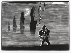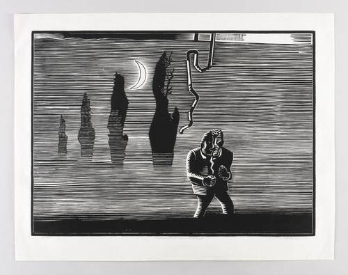 1977. Holzschnitt, in Schwarz, auf rauem weißlichem Japan. – Originale Künstlergrafik, von Wolfgang Mattheuer. – Auflage Exemplar Nr. 10/50. – 47,9 x 66,0 cm (Darstellung / Druckstock), 58 x 75 cm (Blatt).