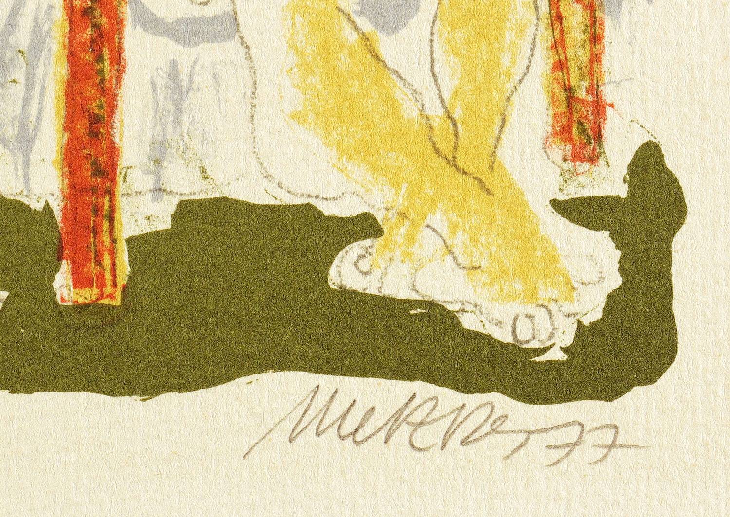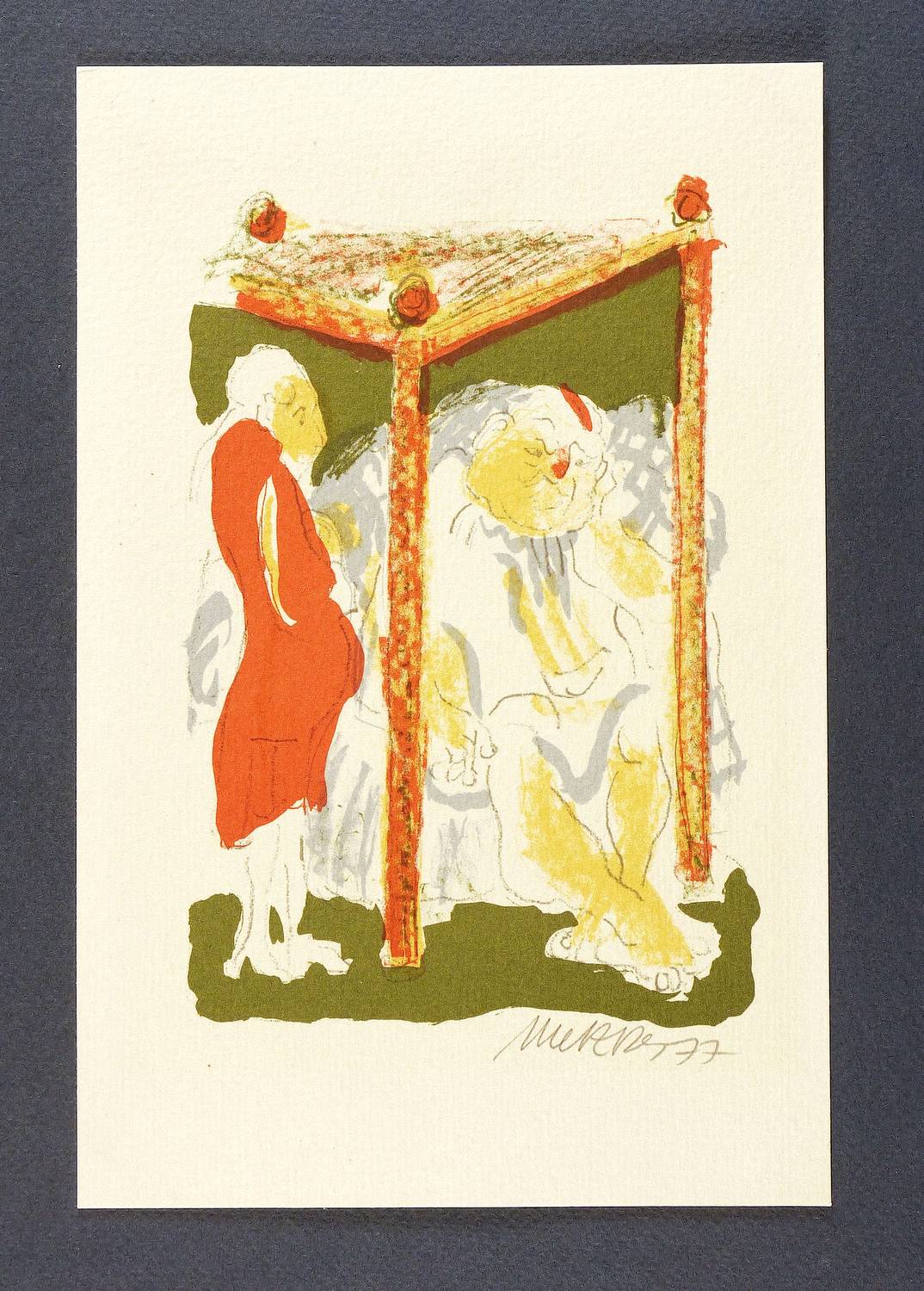 1977. Farblithografie / Kreidelithografie, in 4 Farben, auf hartem Maschinenbütten. – Originale Künstlergrafik, von Harald Metzkes. – 15,7 x 10,5 cm (Darstellung), 21 x 14 cm (Blatt).