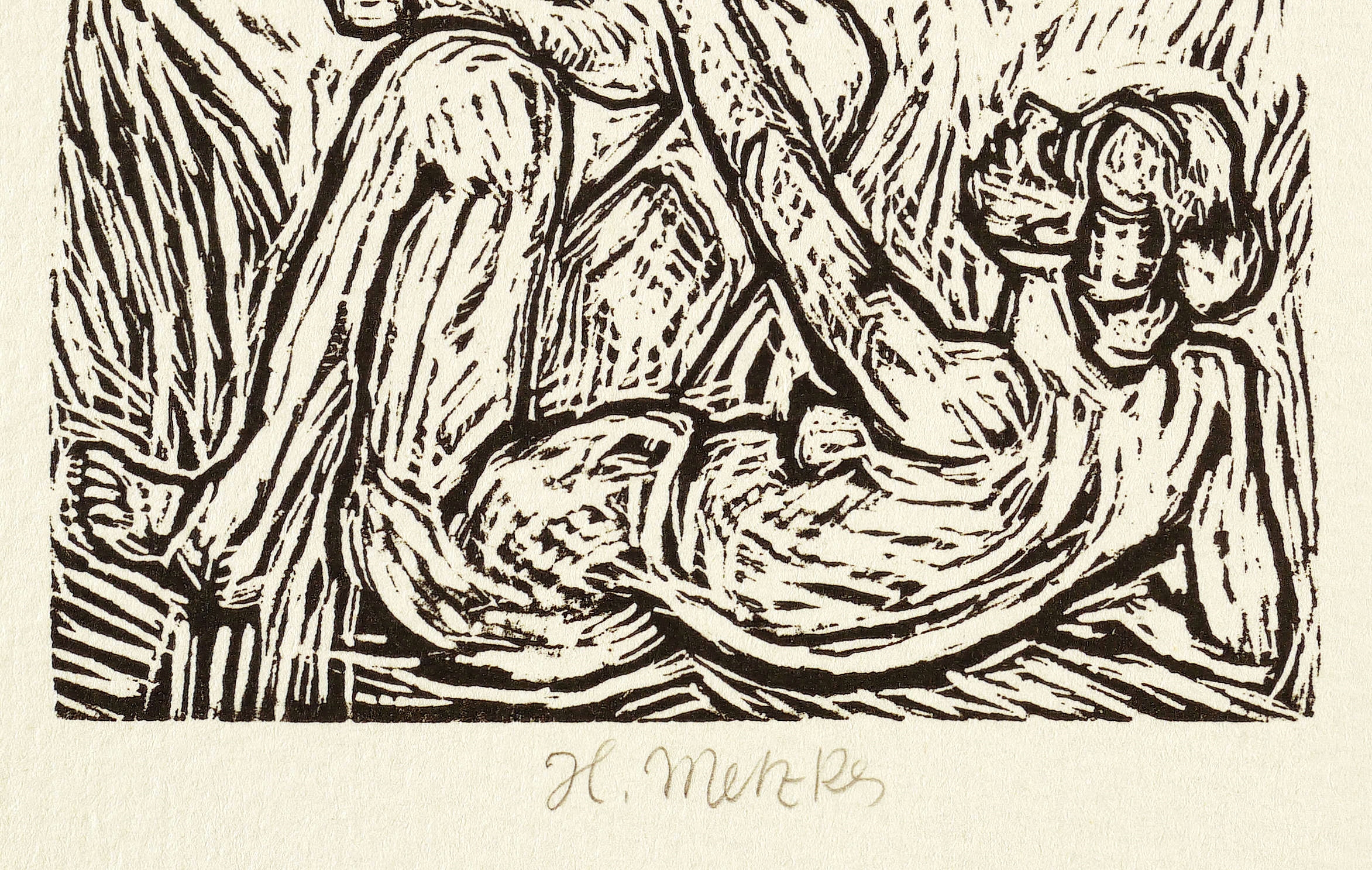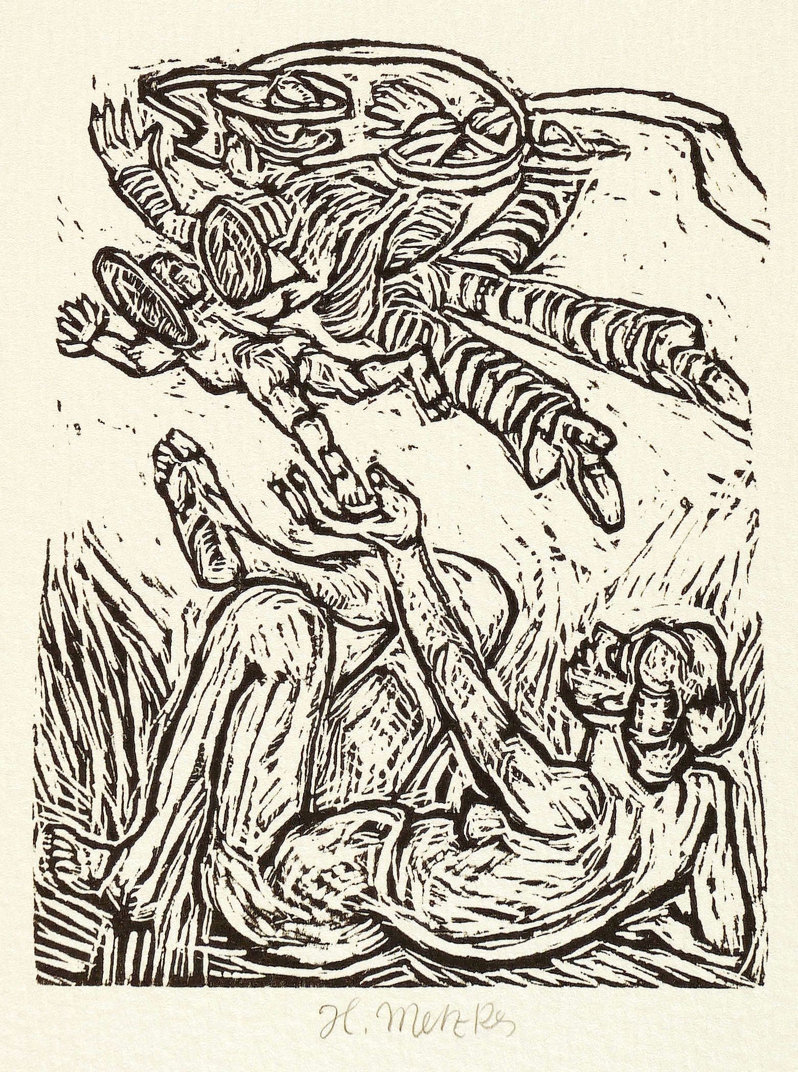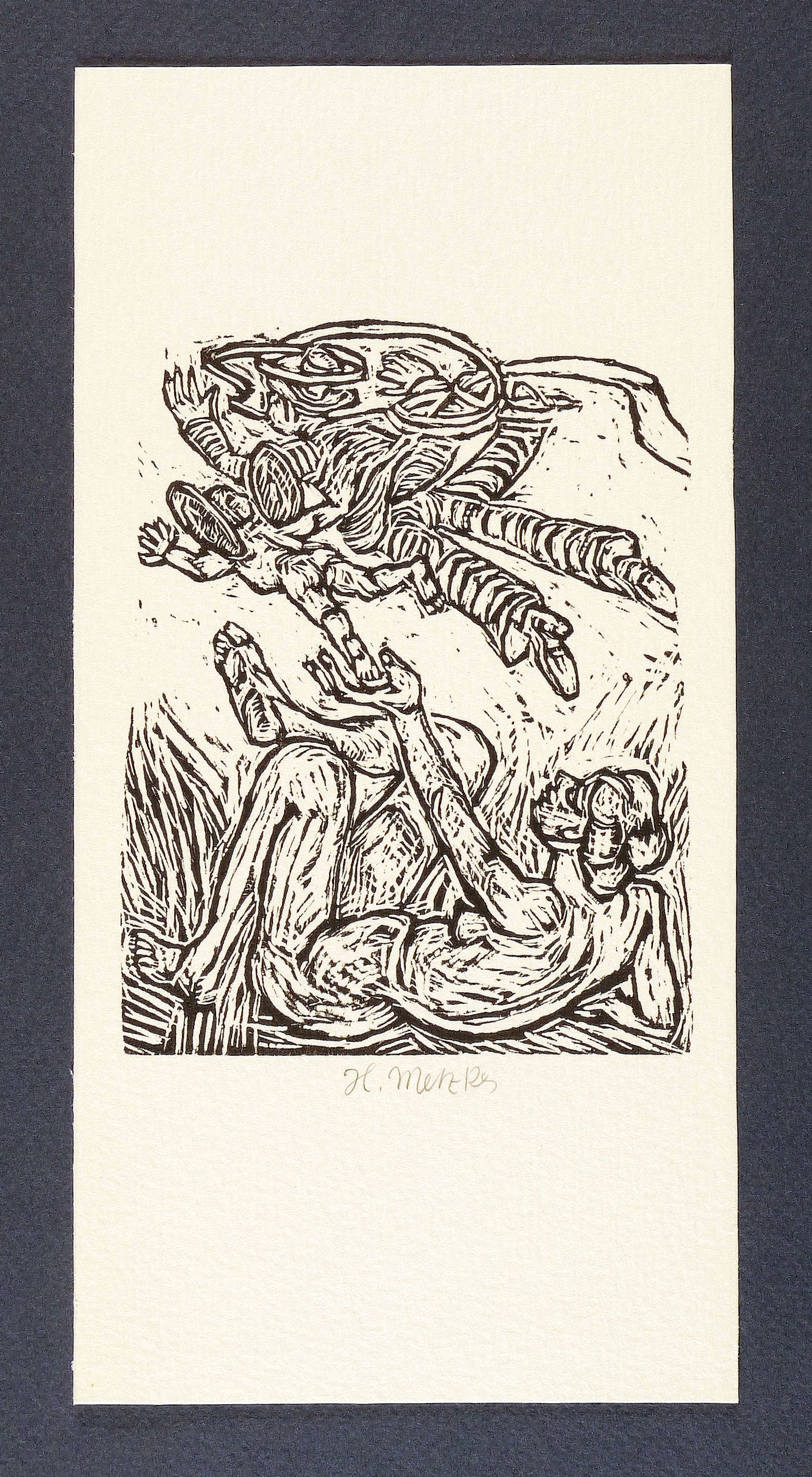 1982. Holzschnitt, in Schwarz, auf Maschinenbütten. – Originale Künstlergrafik, von Harald Metzkes. – 11,6 x 9,0 cm (Darstellung), 21 x 10,5 cm (Blatt).