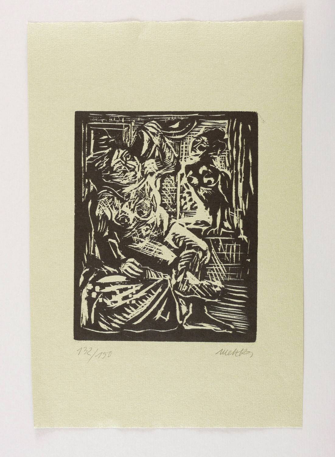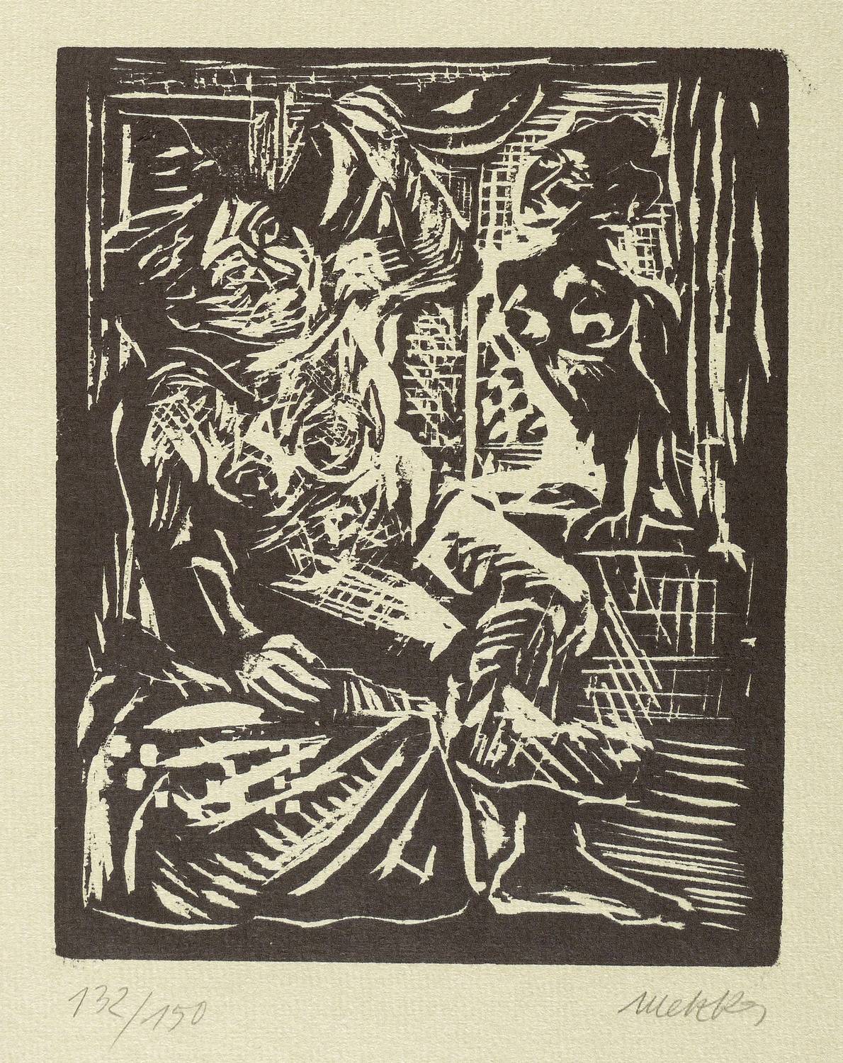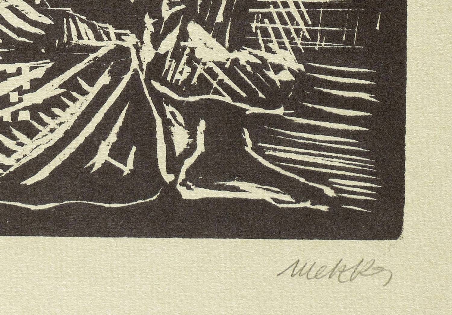 1968. Holzschnitt, in Schwarz, auf grau-grünem Maschinenbütten. – Originale Künstlergrafik, von Harald Metzkes. – Aufalge Exemplar Nr. 132/150. – 15,5 x 12,4 cm (Darstellung / Druckbild), 28 x 19 cm (Blatt).