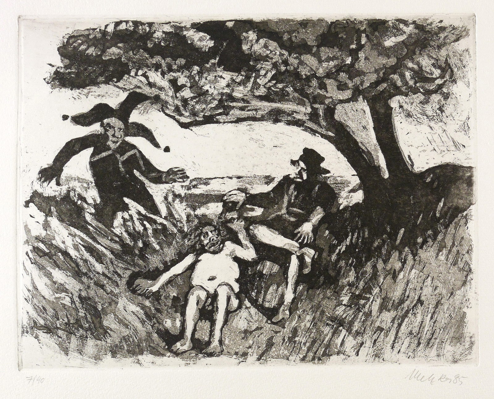 1985. Radierung / Aquatinta, in Schwarz, auf schwerem hellchamois Velin. – Originale Künstlergrafik, von Harald Metzkes. – Auflage Exemplar Nr. 7/40. – 24,5 x 32,0 cm (Darstellung / Platte), 40 x 54 cm (Blatt).
