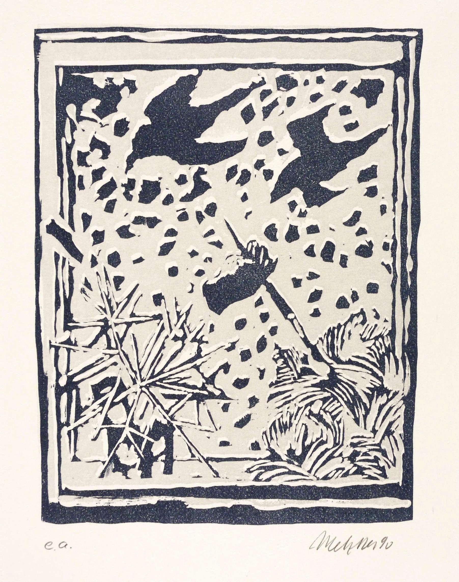 1990. Farblithografie / Pinsellithografie, in 2 Farben, auf festem hellchamois Velin. – Originale Künstlergrafik, von Harald Metzkes. – Künstlerexemplar (e.a.). – 19,9 x 15,5 cm (Darstellung / Druckbild), 36 x 30 cm (Blatt).