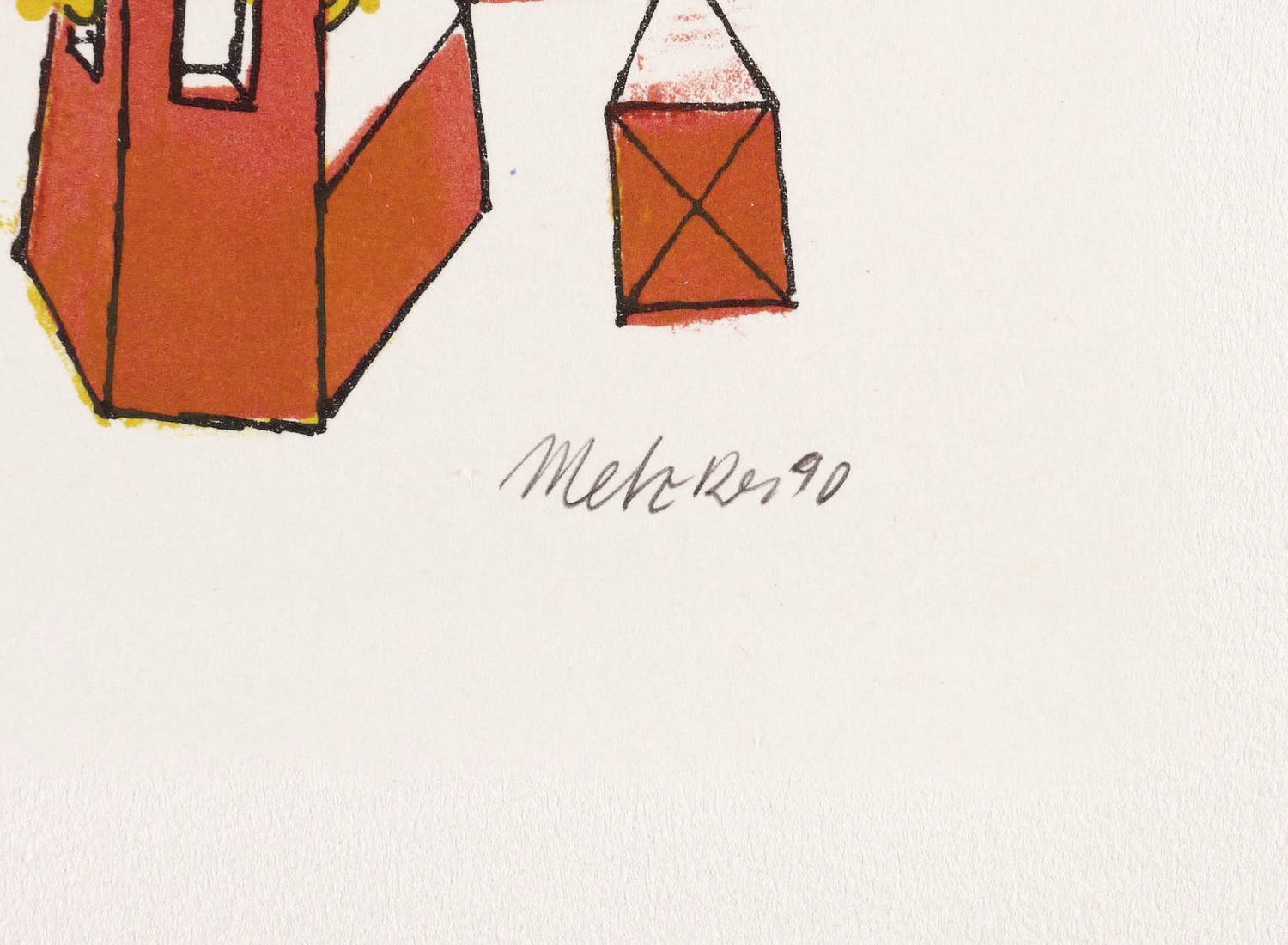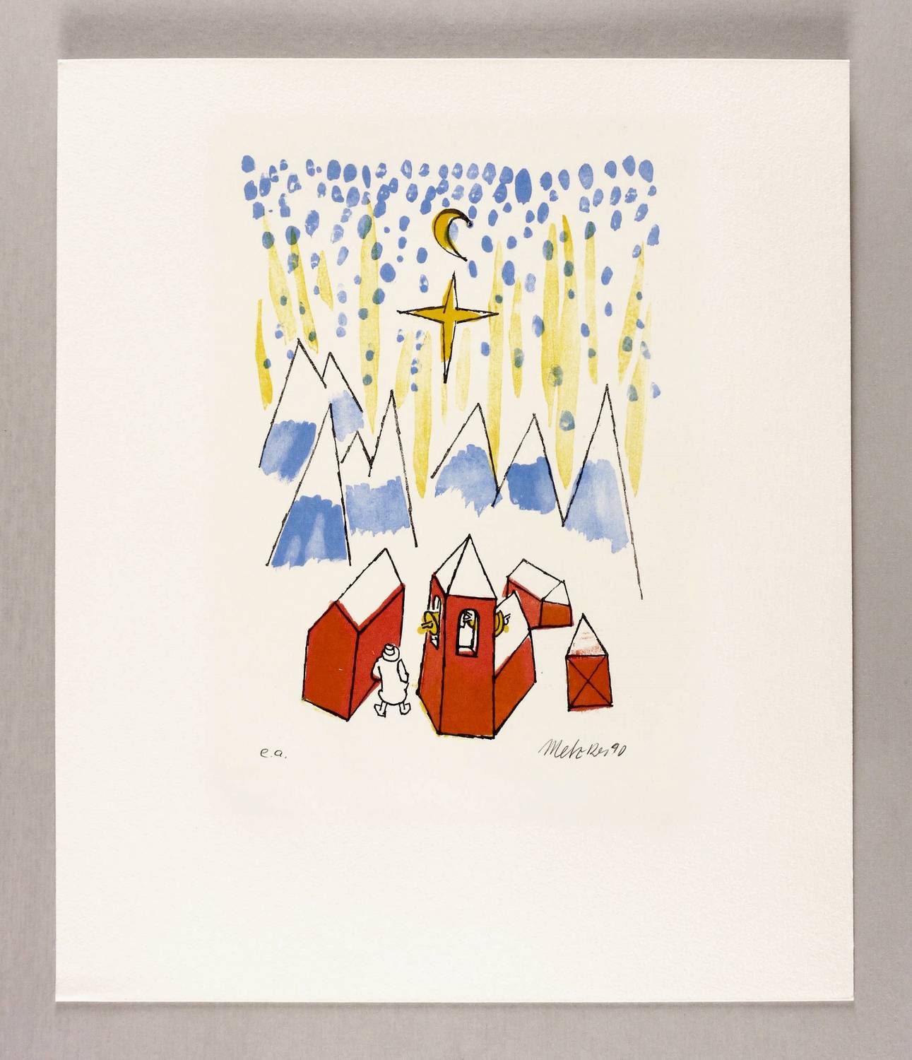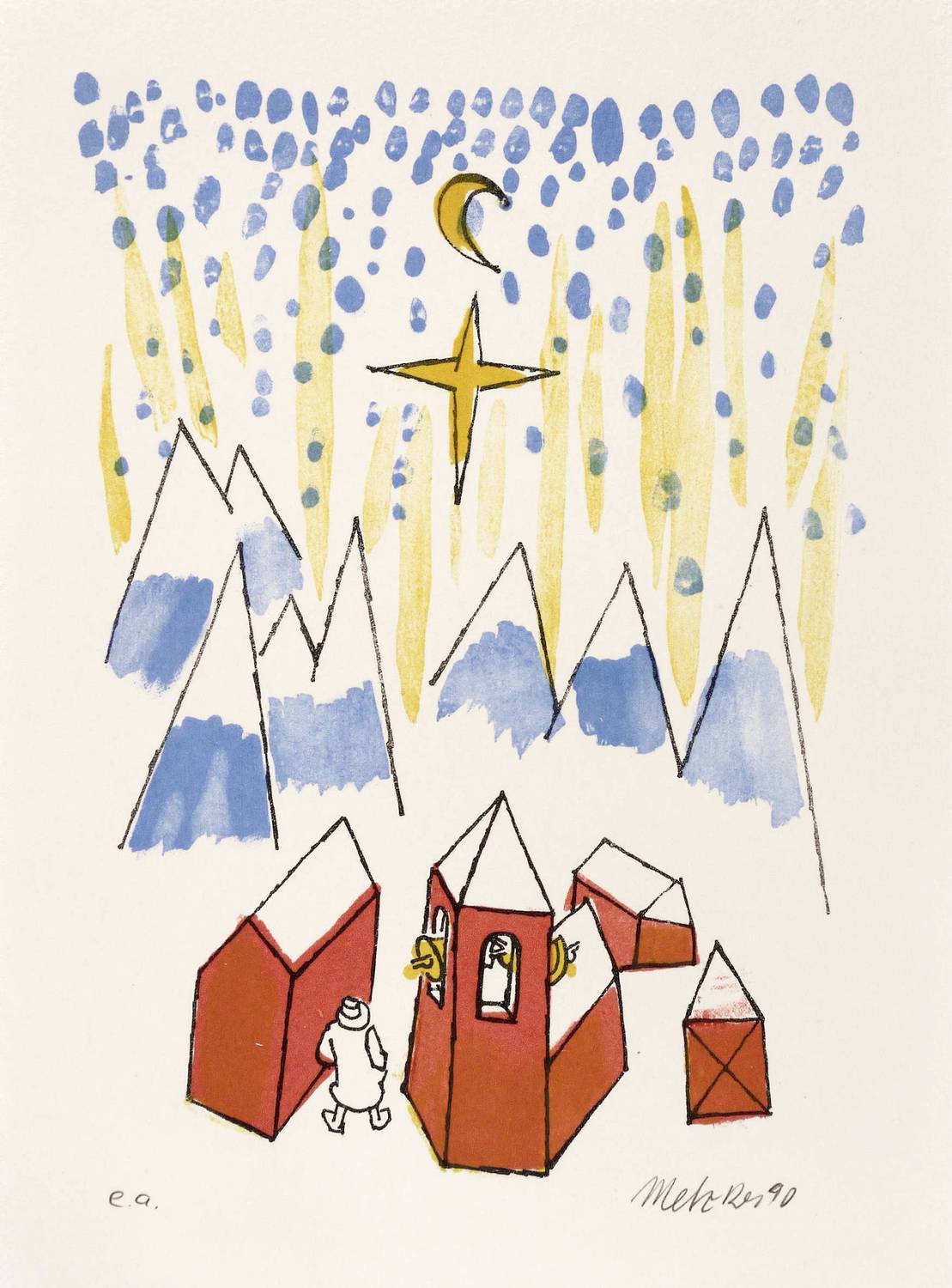 1990. Farblithografie / Pinsellithografie, in 4 Farben, auf festem hellchamois Velin. – Originale Künstlergrafik, von Harald Metzkes. – Künstlerexemplar (e.a.). – 22,1 x 15,9 cm (Darstellung / Druckbild), 36 x 31 cm (Blatt), 26,5 x 19,0 cm (Stein).