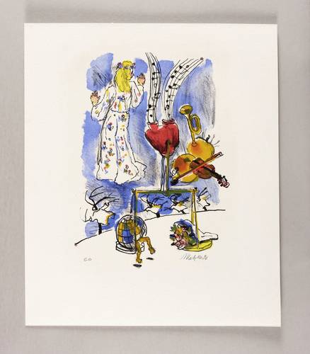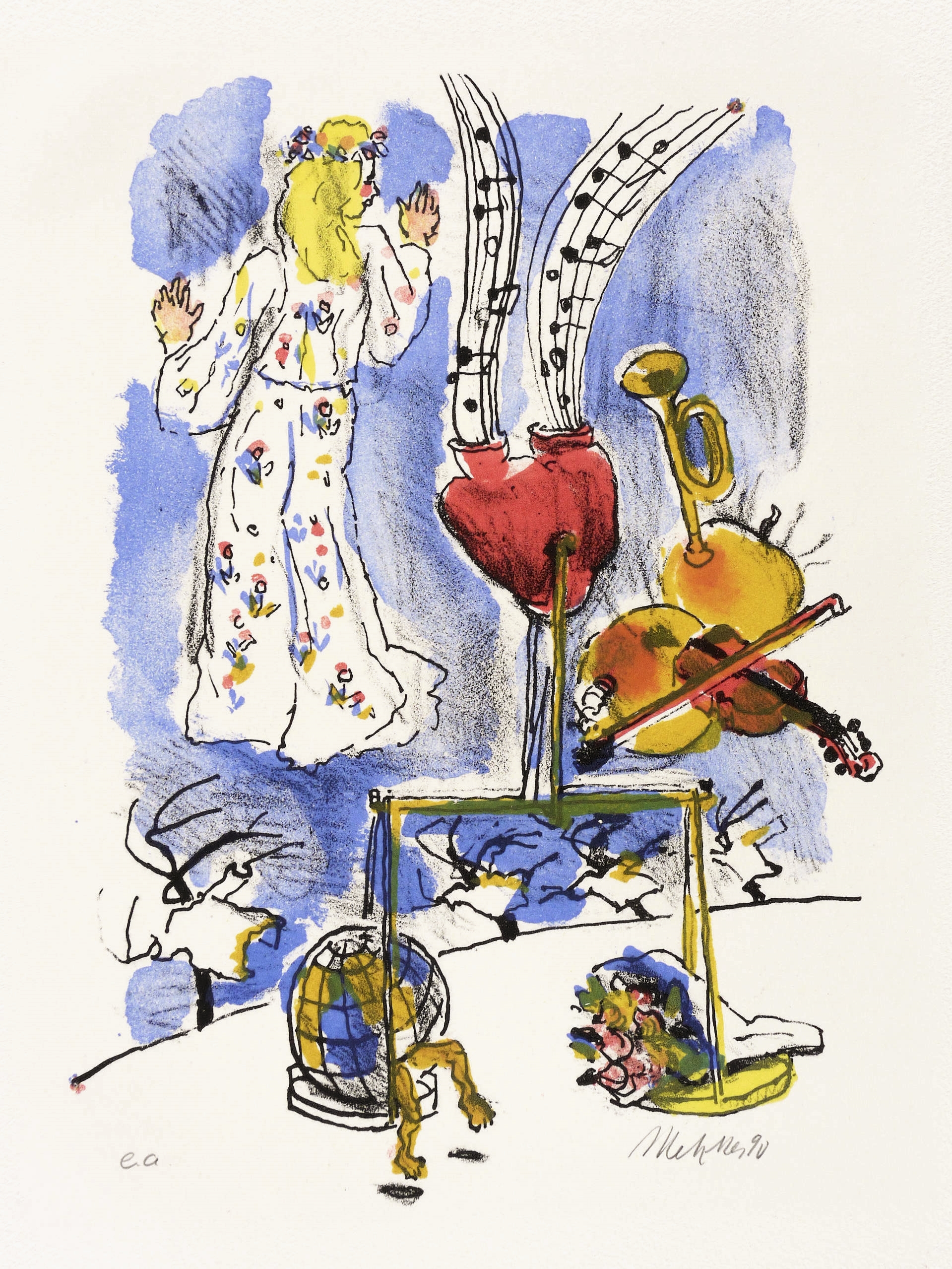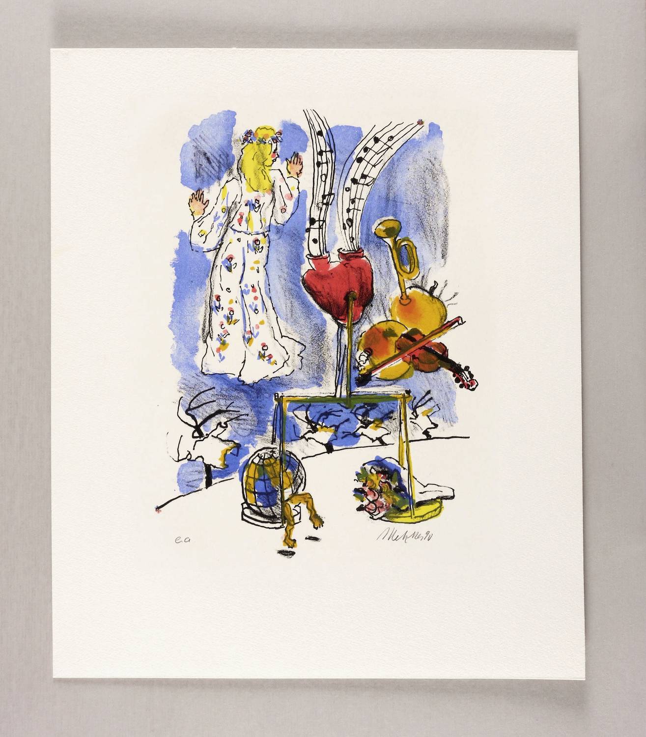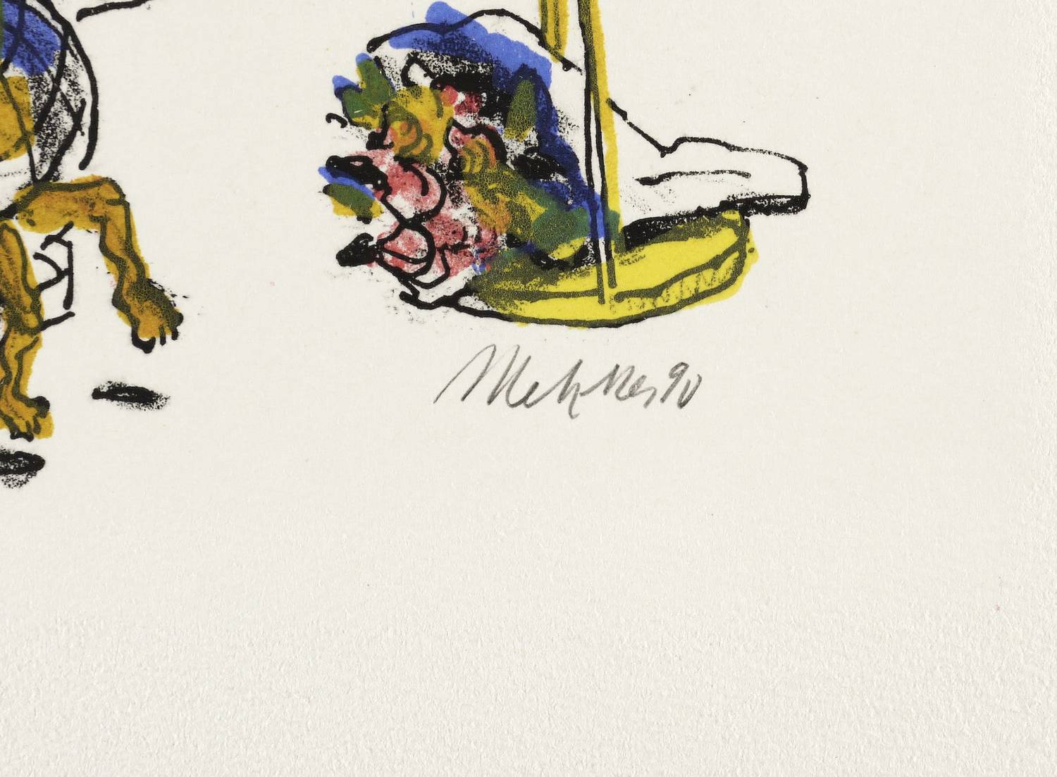 1990. Farblithografie / Pinsellithografie, in 5 Farben, auf festem hellchamois Velin. – Originale Künstlergrafik, von Harald Metzkes. – Künstlerexemplar (e.a.). – 25,5 x 18,4 cm (Darstellung / Druckbild), 36 x 31 cm (Blatt), 26,5 x 20,5 cm (Stein).