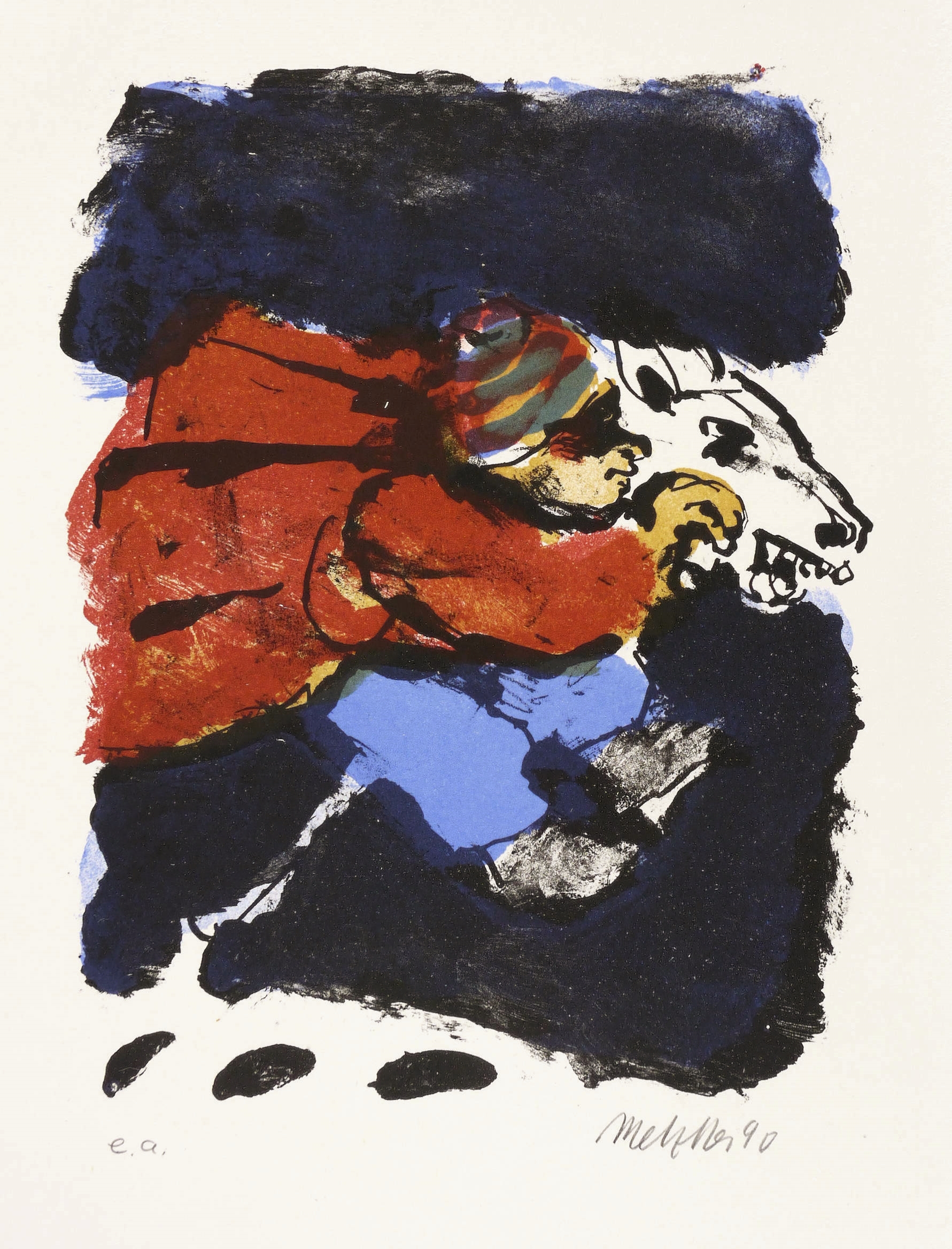 1990. Farblithografie / Pinsellithografie, in 4 Farben, auf festem hellchamois Velin. – Originale Künstlergrafik, von Harald Metzkes. – Künstlerexemplar (e.a.). – 19,7 x 15,6 cm (Darstellung / Druckbild), 36 x 31 cm (Blatt), 25,5 x 18,5 cm (Stein).