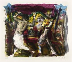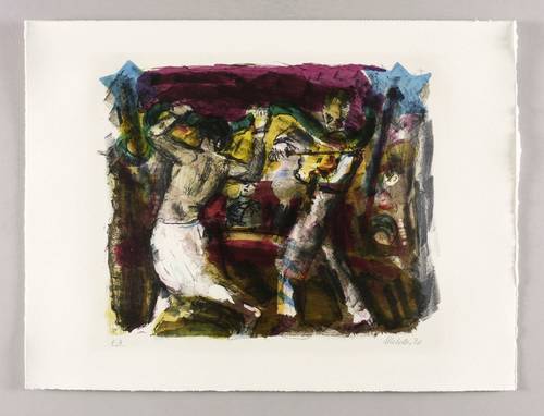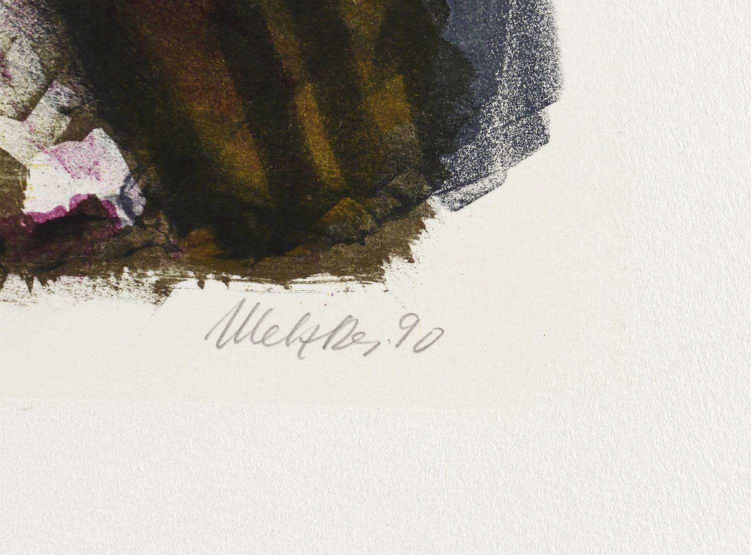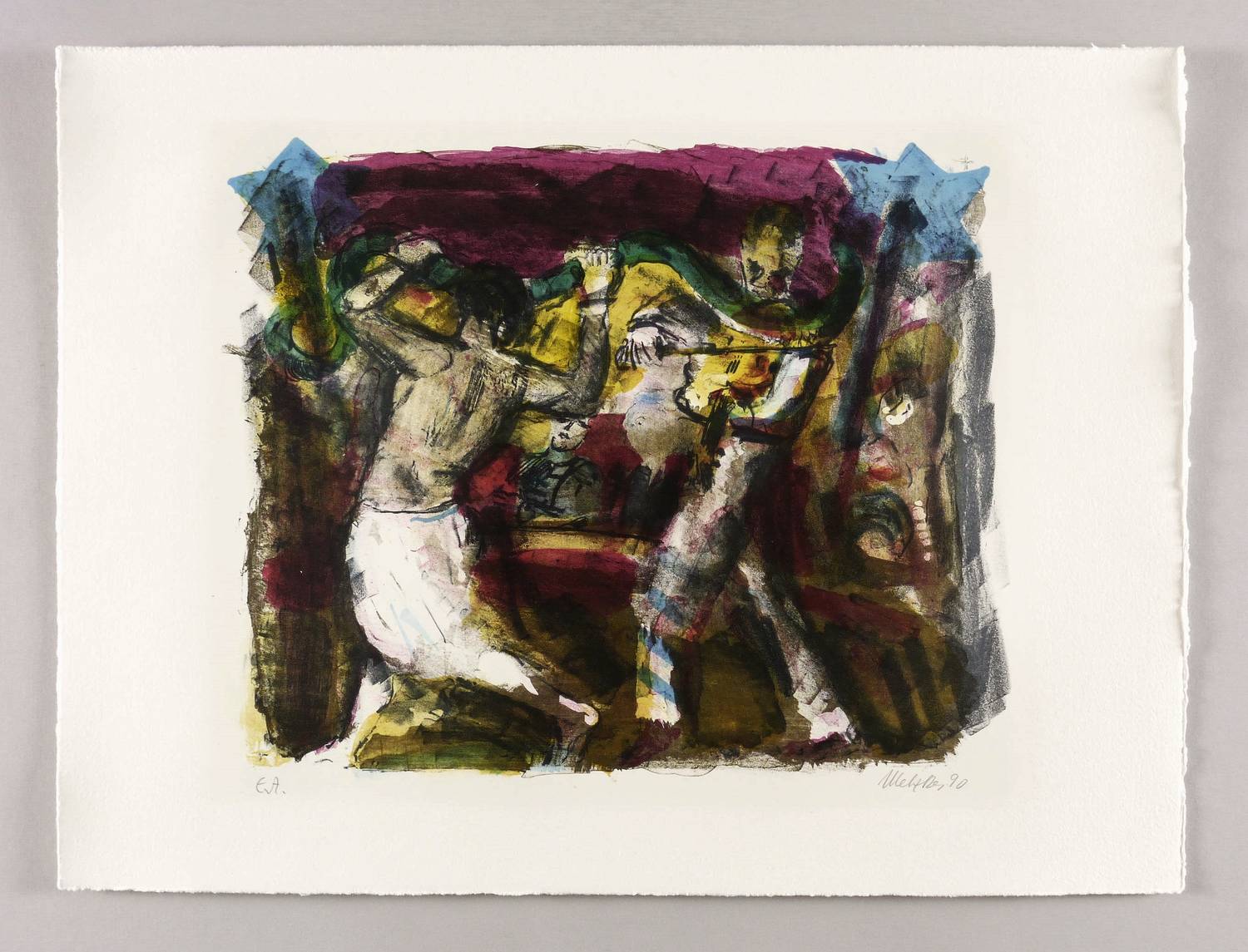 1990. Farblithografie / Pinsellithografie, in 7 Farben, auf schwerem hellchamois Hahnemühle. – Originale Künstlergrafik, von Harald Metzkes. – Künstlerexemplar (e.a.). – 30,0 x 36,8 cm (Darstellung / Druckbild), 40 x 53 cm (Blatt).