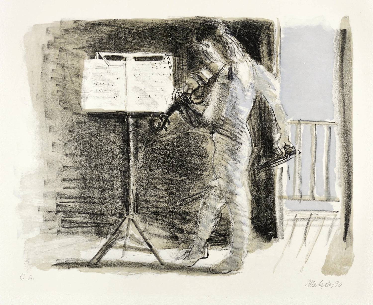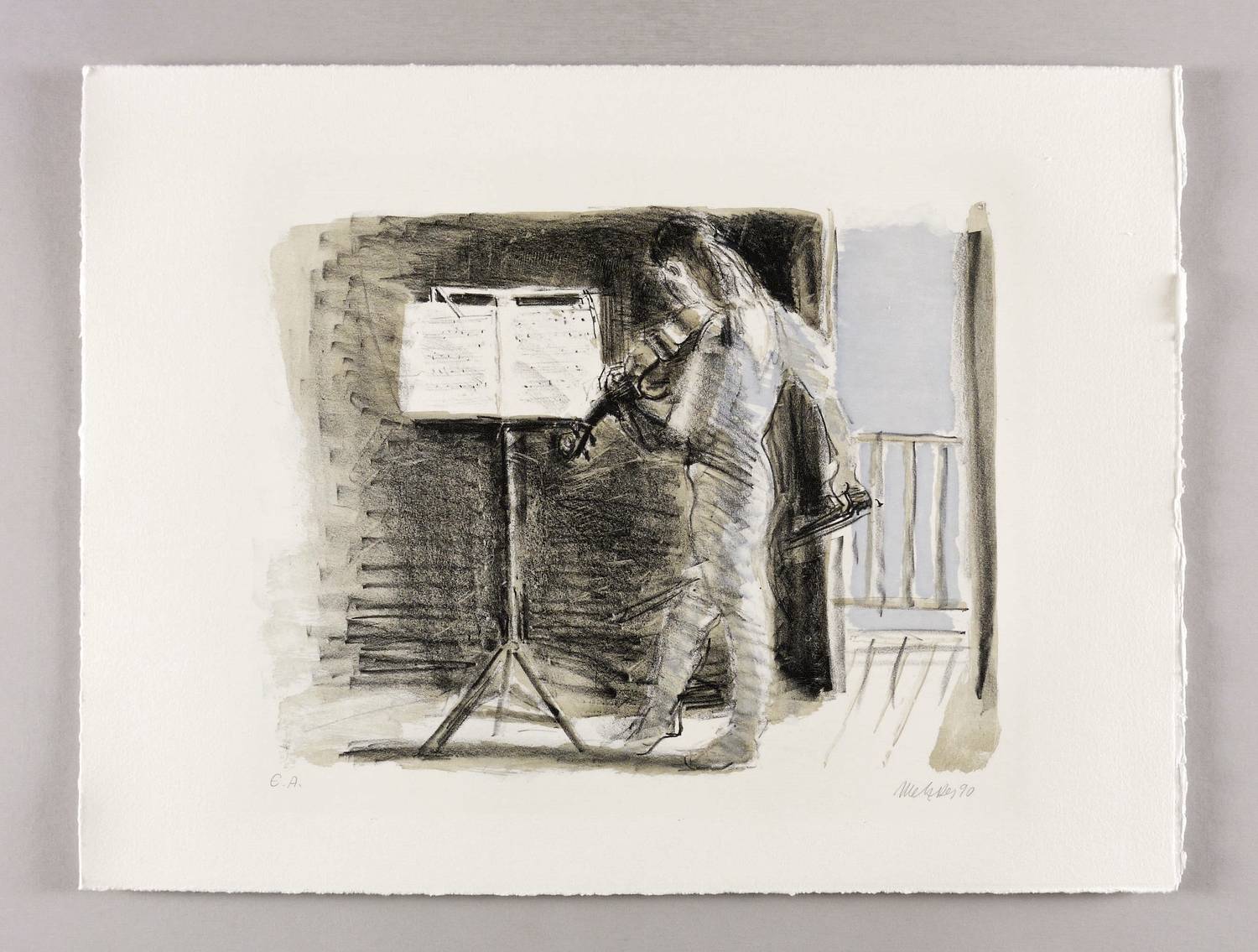 1990. Farblithografie / Pinsellithografie, in 3 Farben, auf schwerem hellchamois Hahnemühle. – Originale Künstlergrafik, von Harald Metzkes. – Künstlerexemplar (e.a.). – 27,6 x 35,5 cm (Darstellung / Druckbild), 40 x 53 cm (Blatt).