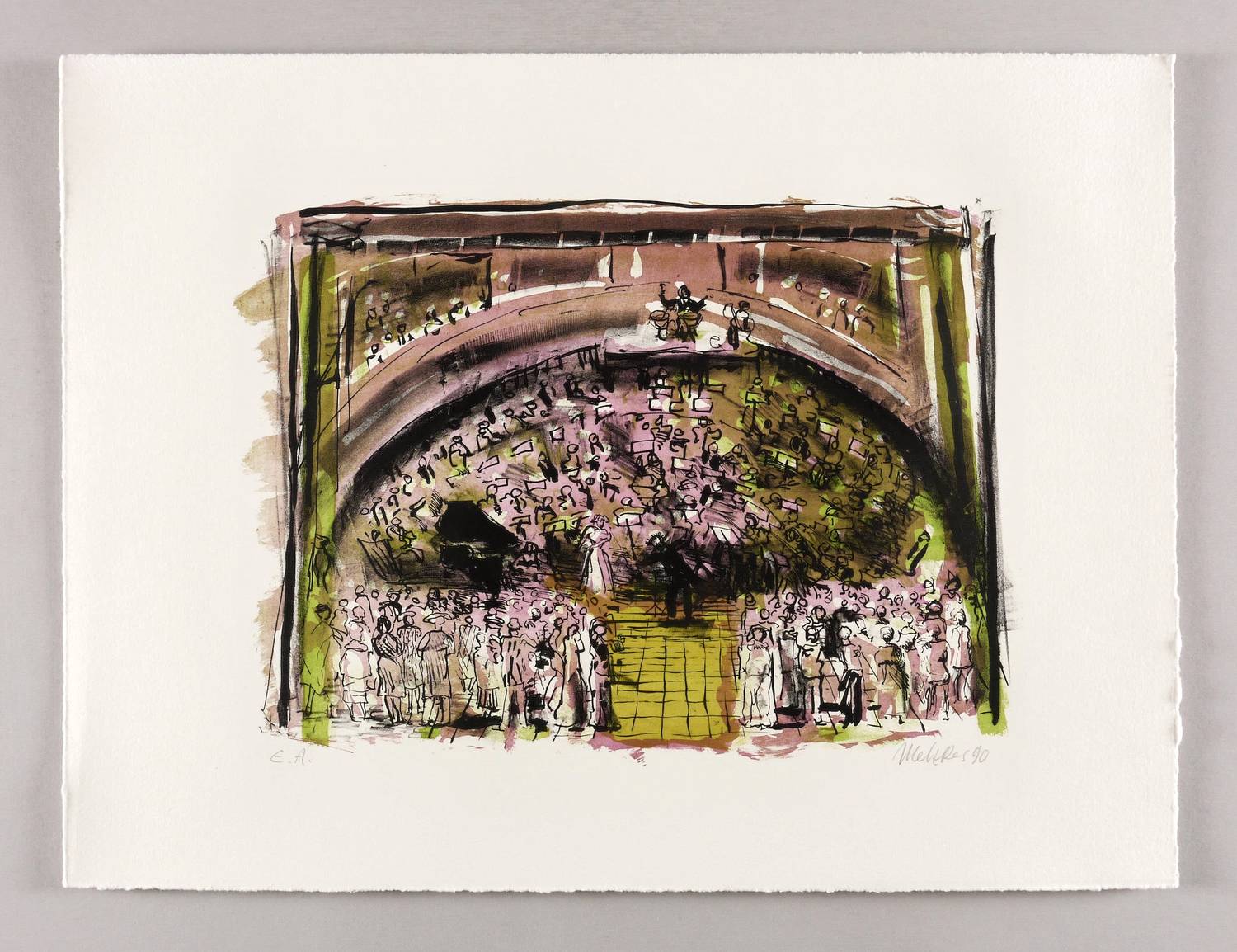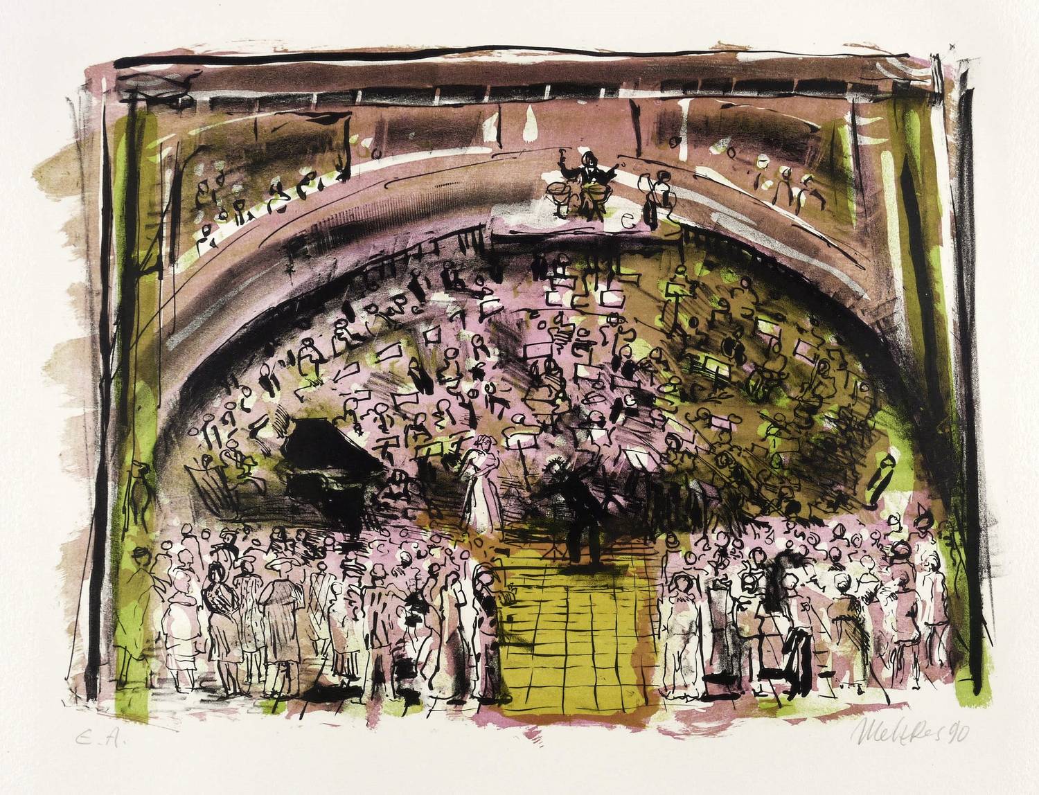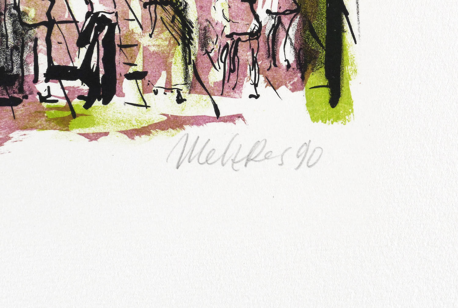 1990. Farblithografie / Pinsellithografie, in 5 Farben, auf schwerem hellchamois Hahnemühle. – Originale Künstlergrafik, von Harald Metzkes. – Künstlerexemplar (e.a.). – 27,2 x 37,2 cm (Darstellung / Druckbild), 40 x 53 cm (Blatt).