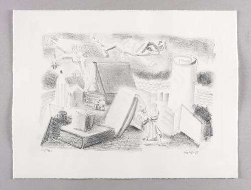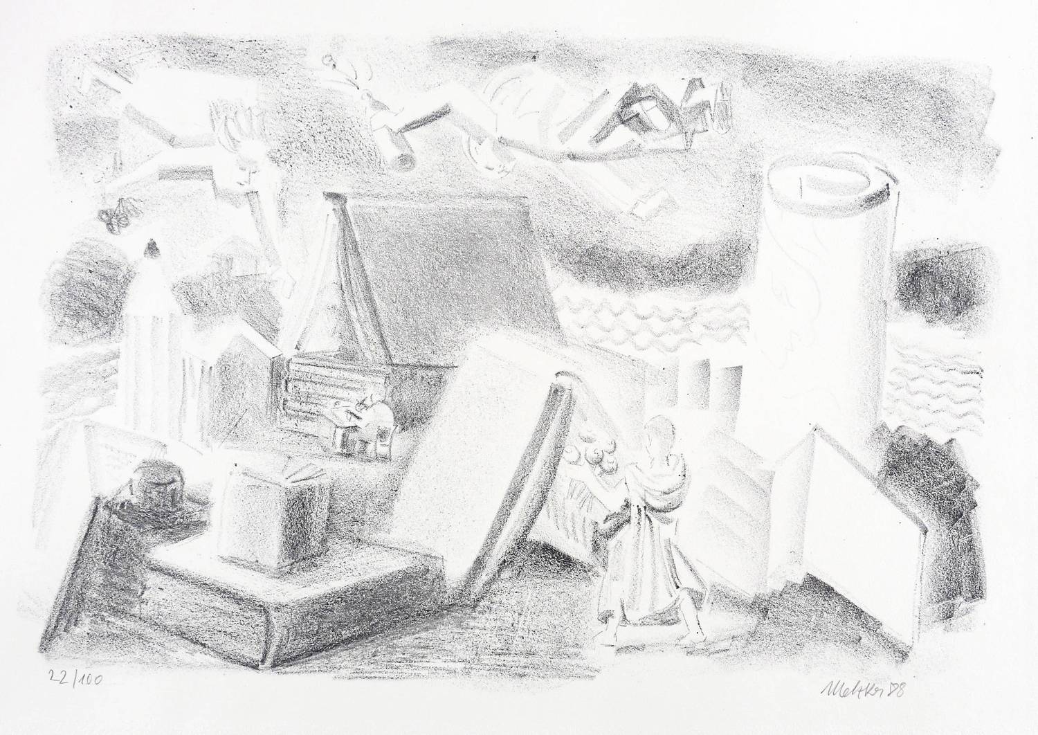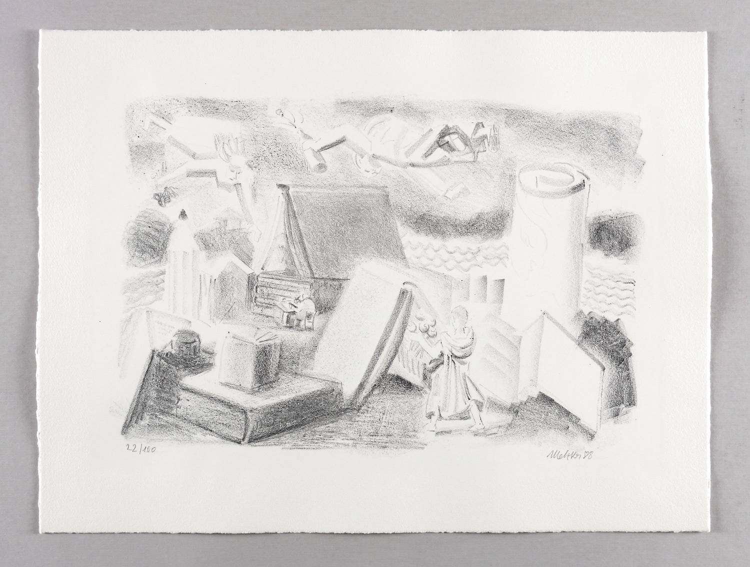 1988. Lithografie / Kreidelithografie, in Schwarz, auf hellchamois Bütten. – Originale Künstlergrafik, von Harald Metzkes. – Auflage Exemplar Nr. 22/100. – 25,5 x 37,5 cm (Darstellung / Druckbild), 36 x 48 cm (Blatt).
