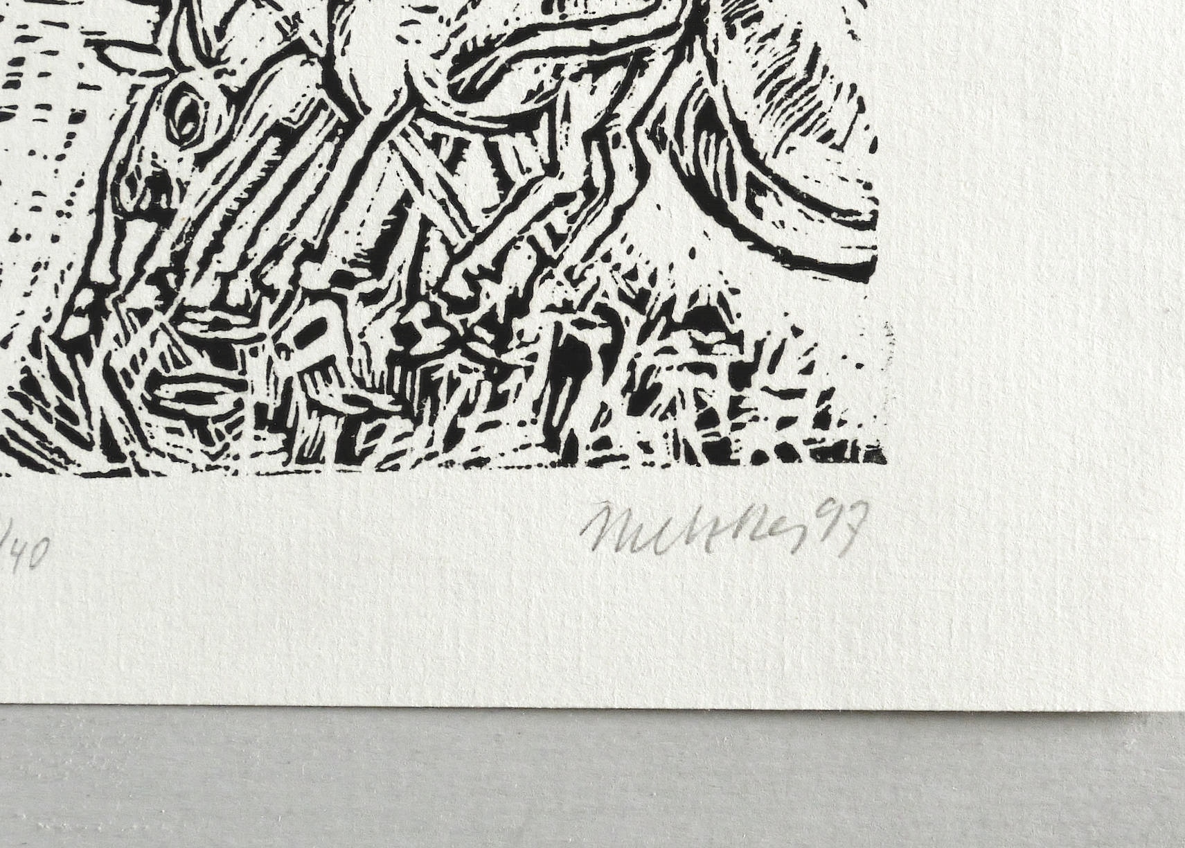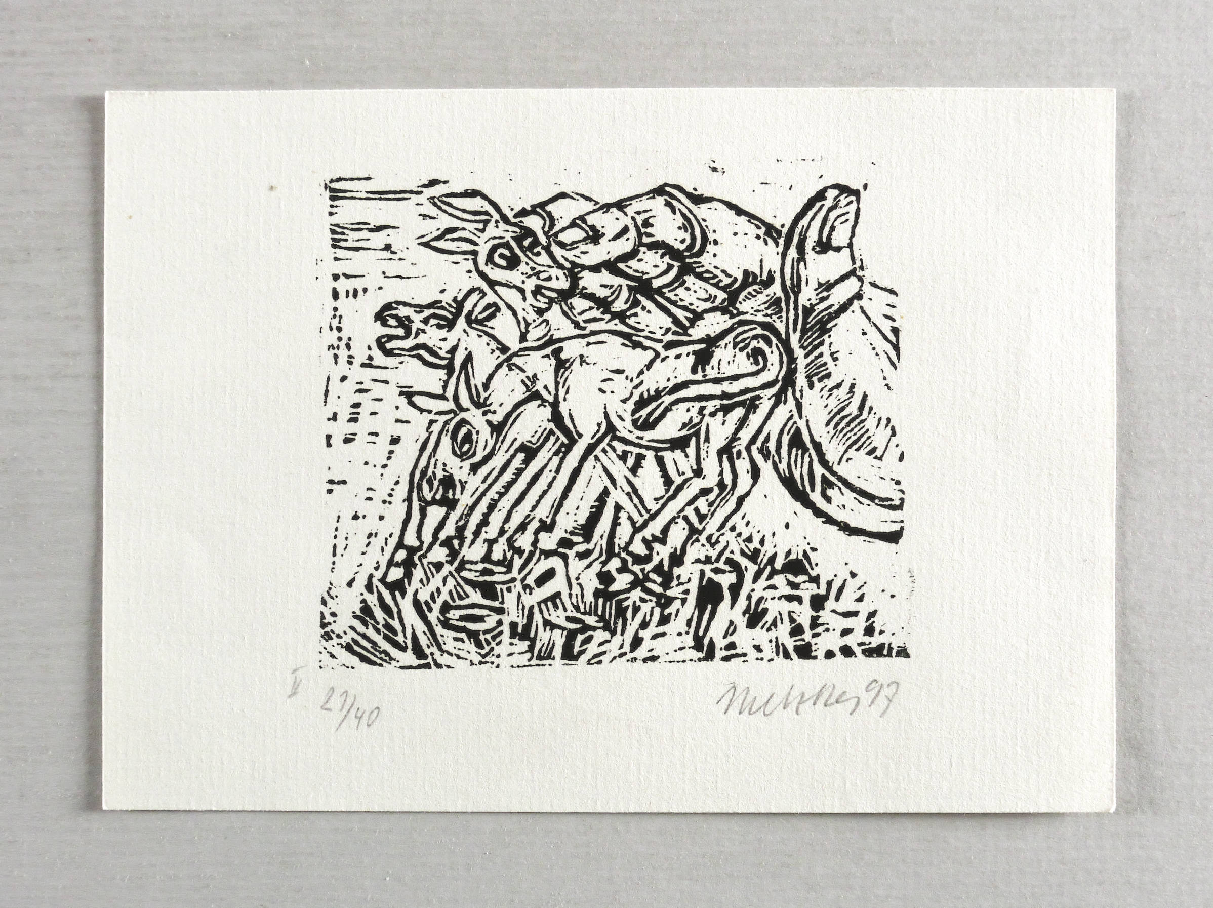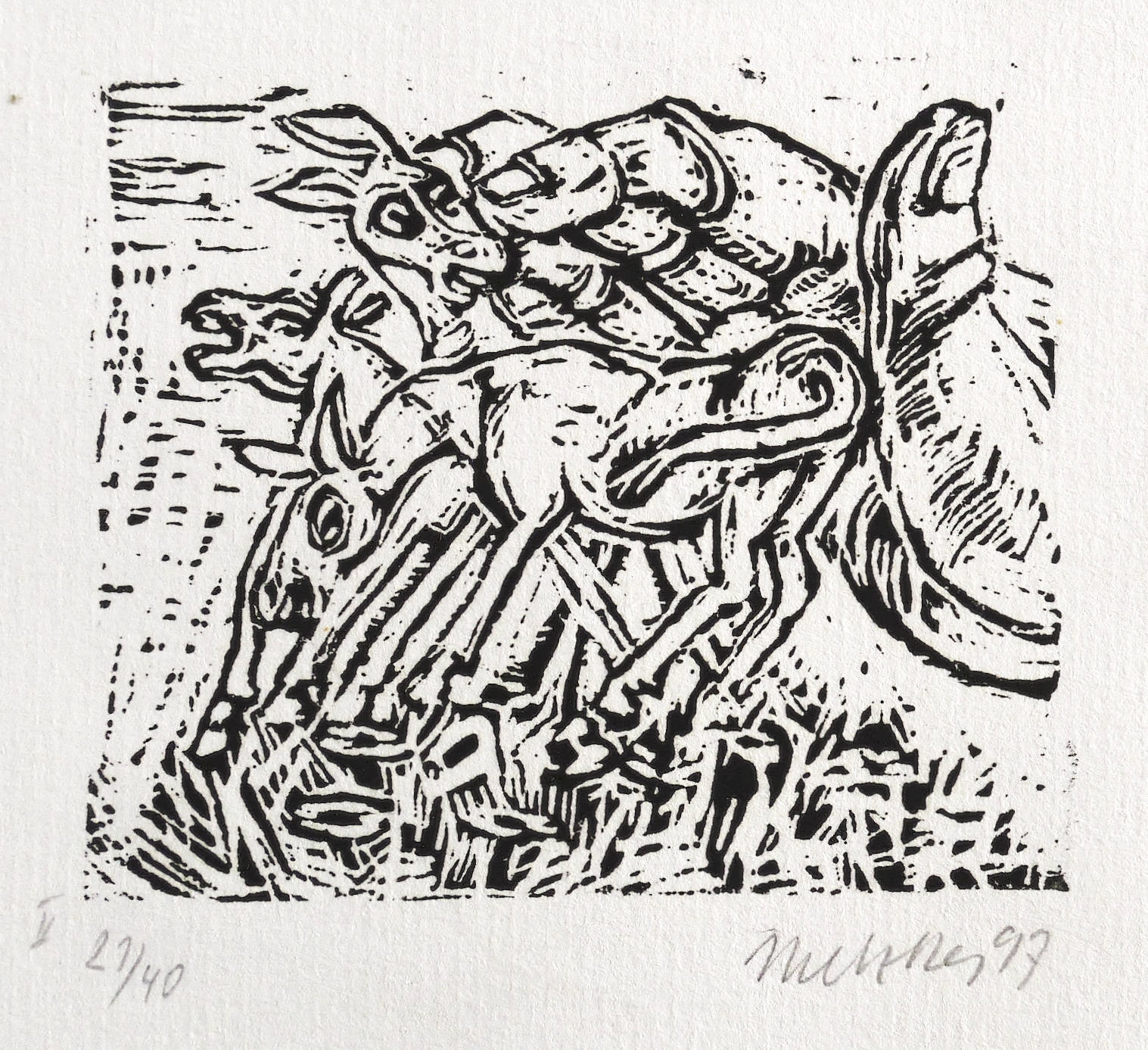1982/1997. Holzschnitt, in Schwarz, auf Maschinenbütten. – Originale Künstlergrafik, von Harald Metzkes. – Auflage Exemplar Nr. 21/40. – 7,3 x 8,5 cm (Darstellung / Druckbild), 11 x 15 cm (Blatt).