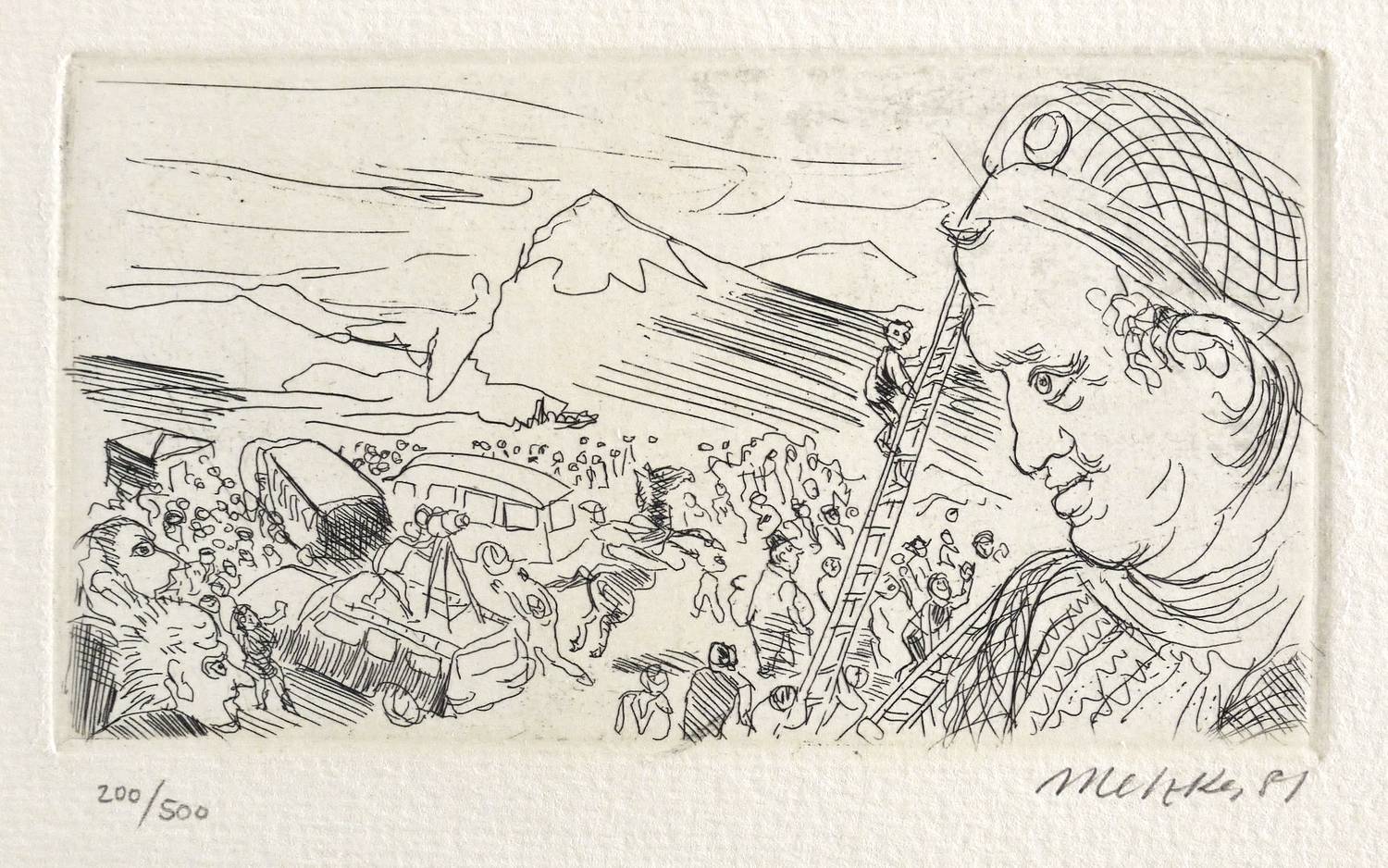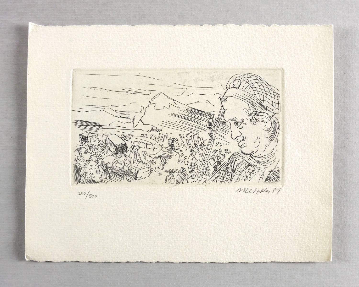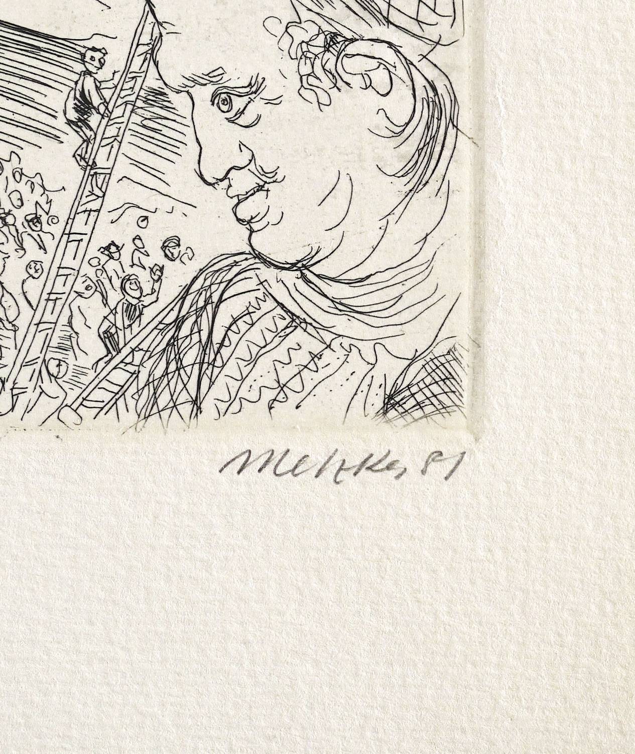 1981. Radierung / Strichätzung, in Schwarz, auf hellchamois Velinkarton. – Originale Künstlergrafik, von Harald Metzkes. – Auflage Exemplar Nr. 200/500. – 7,7 x 13,8 cm (Darstellung / Platte), 16 x 20 cm (Blatt).