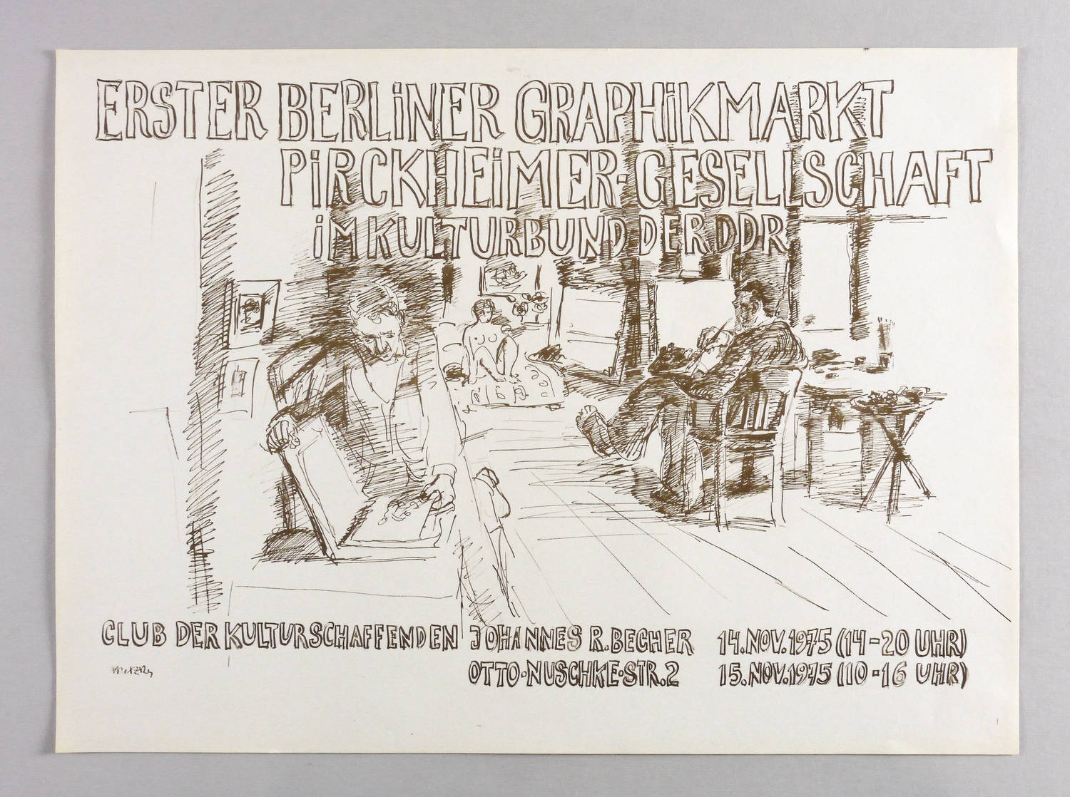 Nicht handsigniert. In der Druckform links unten signiert: ″Metzkes″. Ohne Auflagenbezeichnung. Diverse Inschriften. – Originalgrafisches Künstlerplakat zum 1. Berliner Graphikmarkt der Pirckheimer- Gesellschaft im Kulturbund der DDR am 14./15.11.1975 im Club der Kulturschaffenden Johannes R. Becher Berlin. – Nahezu tadellos erhalten. Sehr guter Zustand.