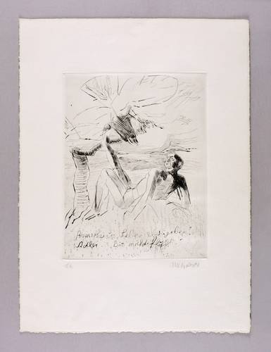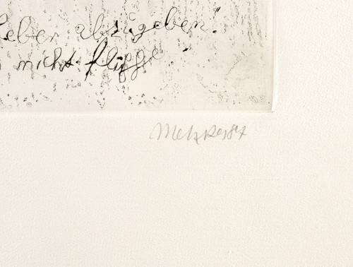 Rechts unten in Bleistift signiert und datiert: ″Metzkes 87″. Links Auflagenbezeichnung: ″18/40″. In der Platte unten Inschrift: ″Prometheus: Leber abzugeben! Adler: Bin nicht flügge.″ Wasserzeichen der Hahnemühle. – Sehr guter Zustand.