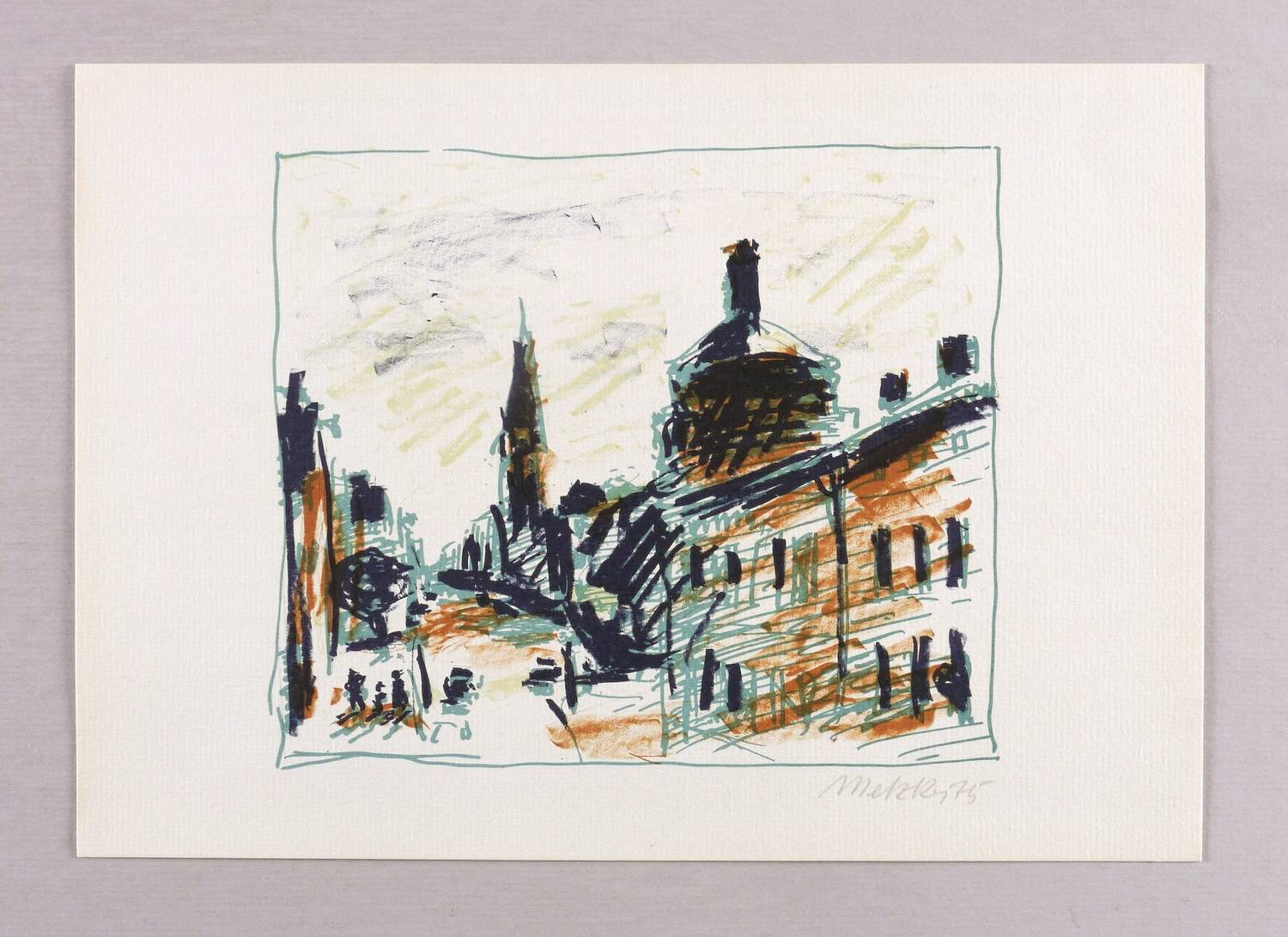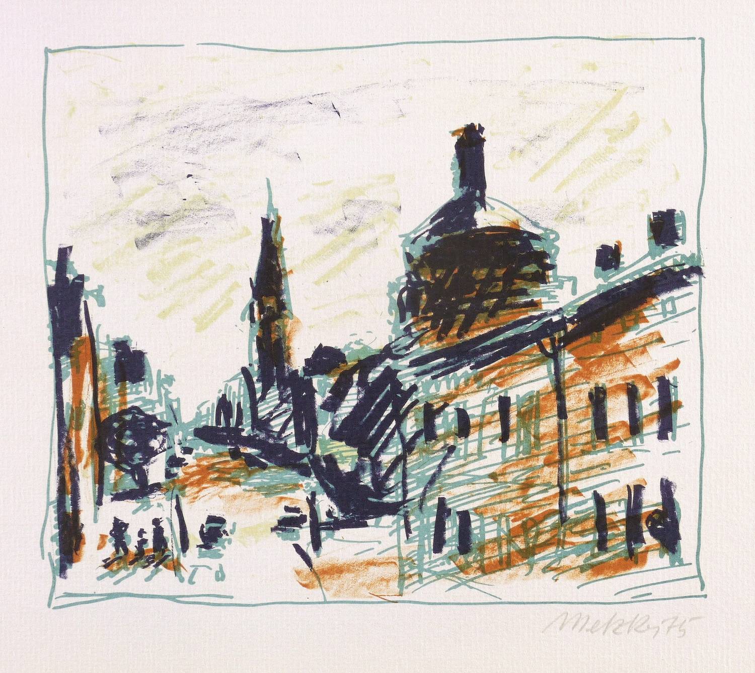 1975. Farblithografie / Kreidelithografie, in 3 Farben, auf hartem chamois Maschinenbütten. – Originale Künstlergrafik, von Harald Metzkes. – 16,3 x 19,1 cm (Darstellung / Druckbild), 21 x 30 cm (Blatt).