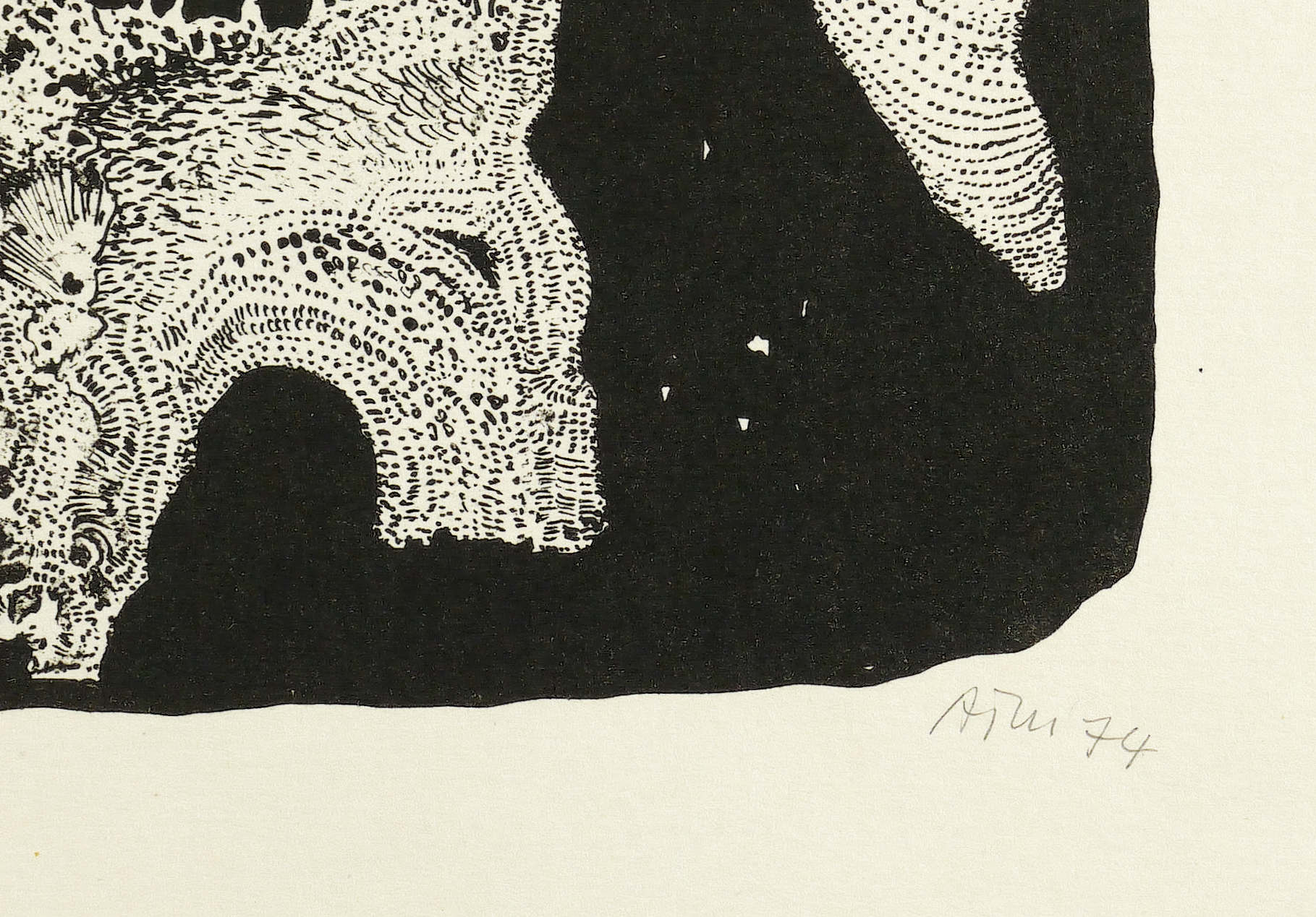1974. Lithografie / Feder- & Pinsellithografie, partiell geschabt, in Schwarz, auf Weißenborn-Bütten. – Originale Künstlergrafik, von Alfred Traugott Mörstedt. – Auflage Exemplar Nr. 9/40. – 23,3 x 32,2 cm (Darstellung), 36 x 48 cm (Blatt).