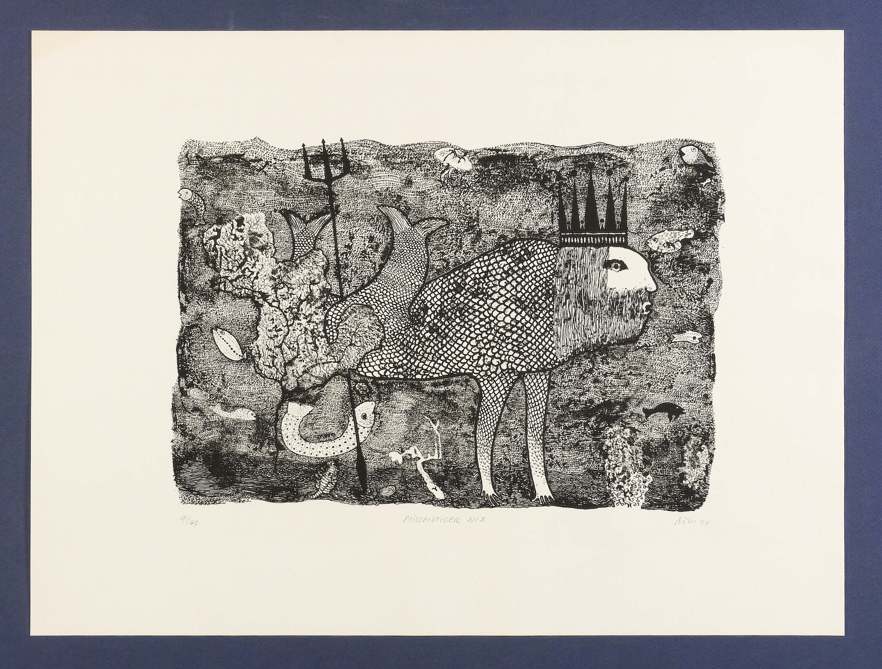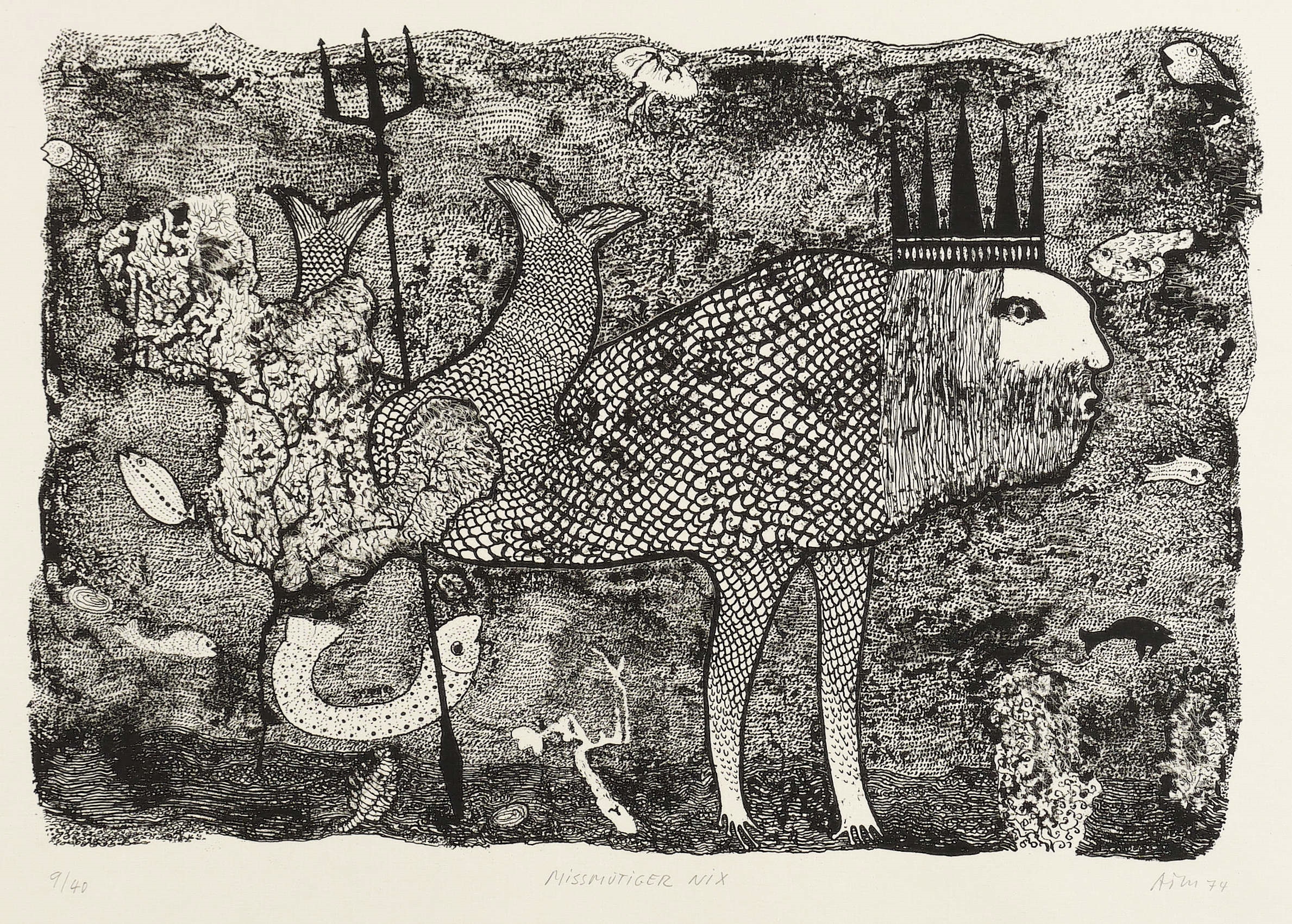 Mörstedt G 65. – Aus: Alfred Traugott Mörstedt, Mitgeschöpfe. 8 Lithographien um das Getier (Erfurt: Eigenverlag 1974). – Rechts unten in Bleistift mit Monogramm signiert und datiert. Links Auflagenbezeichnung. – Sehr gut erhalten.