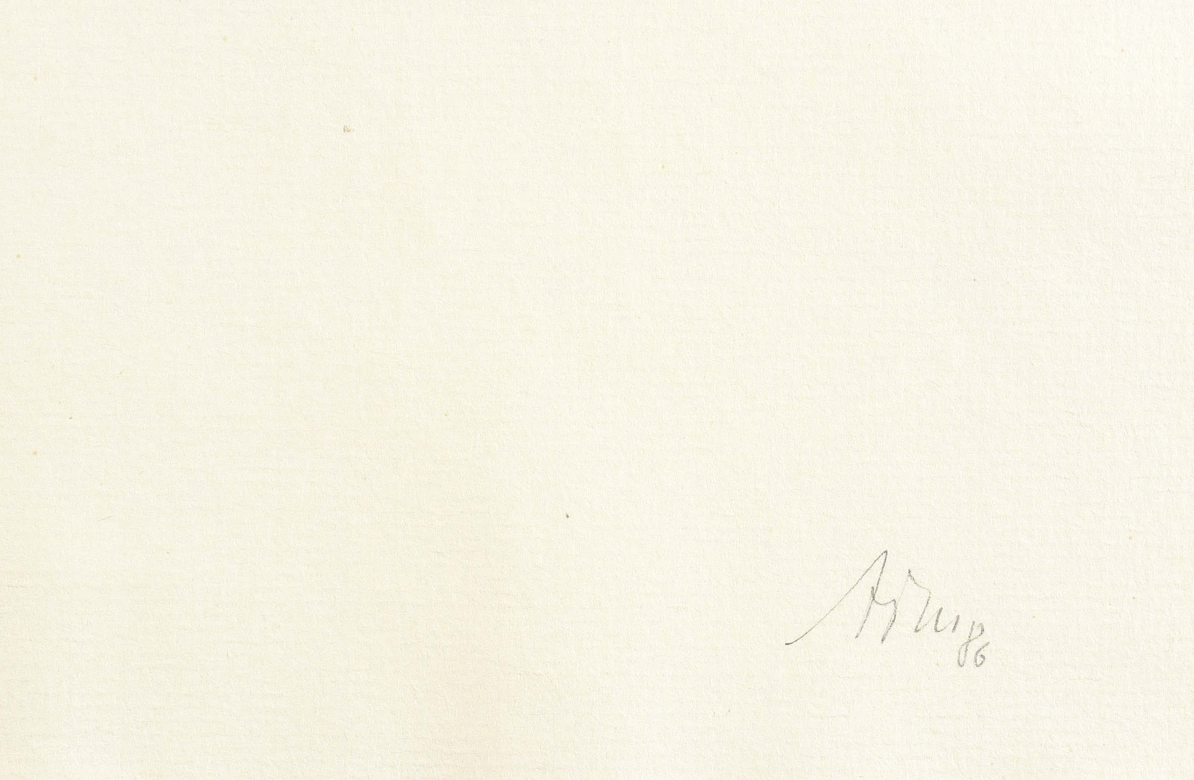 1986. Lithografie / Kreidelithografie, in Schwarz, aquarelliert, auf hartem hellem Velin. – Originale Künstlergrafik, von Alfred Traugott Mörstedt. – Auflage Exemplar Nr. 3/50. – 27,6 x 20,5 cm (Darstellung), 50 x 38 cm (Blatt).
