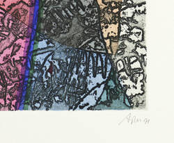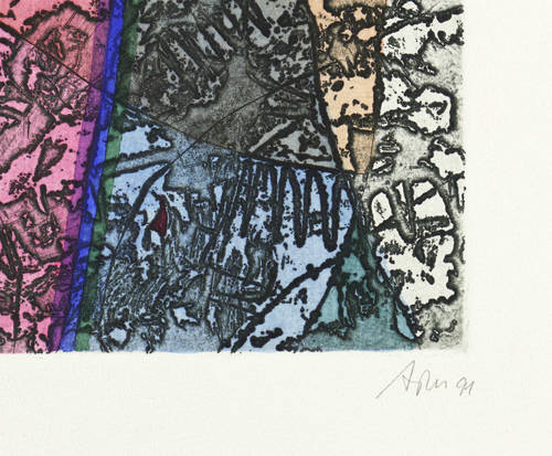 Mörstedt G 259. – Aus: Harald Gerlach & Alfred Traugott Mörstedt, Einschlüsse, Aufbrüche. Blätter zu sechs Monaten deutscher Geschichte (Rudolstadt: Burgart-Presse 1991). – Rechts unten in Bleistift signiert und datiert: ″ATM 91″. Links eigenhändige Auflagenbezeichnung. – Tadellos. Sehr gut erhalten.