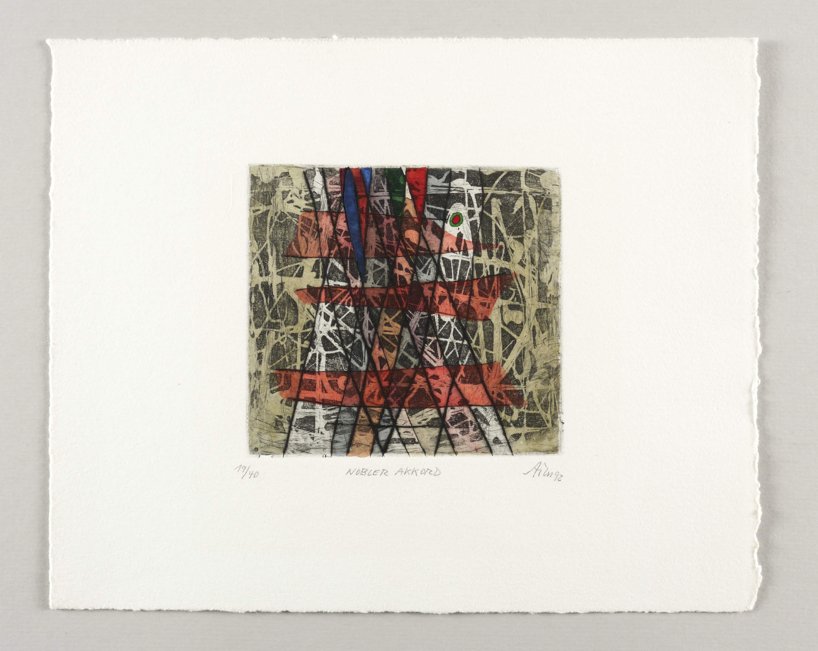 Mörstedt G 270. – Rechts unten in Bleistift signiert und datiert: ″ATM 92″. Links Auflagenbezeichnung: ″19/40″. Mittig Titel: ″NOBLER AKKORD″. – Unikat, da die 40 Exemplare der Auflage jeweils verschieden ausgeführt wurden, weshalb sie als unikate Drucke anzusehen sind (vgl. WVZ Mörstedt, S. 62, Abb. 270). – Unbeschnittenes Exemplar. Sehr guter Zustand.