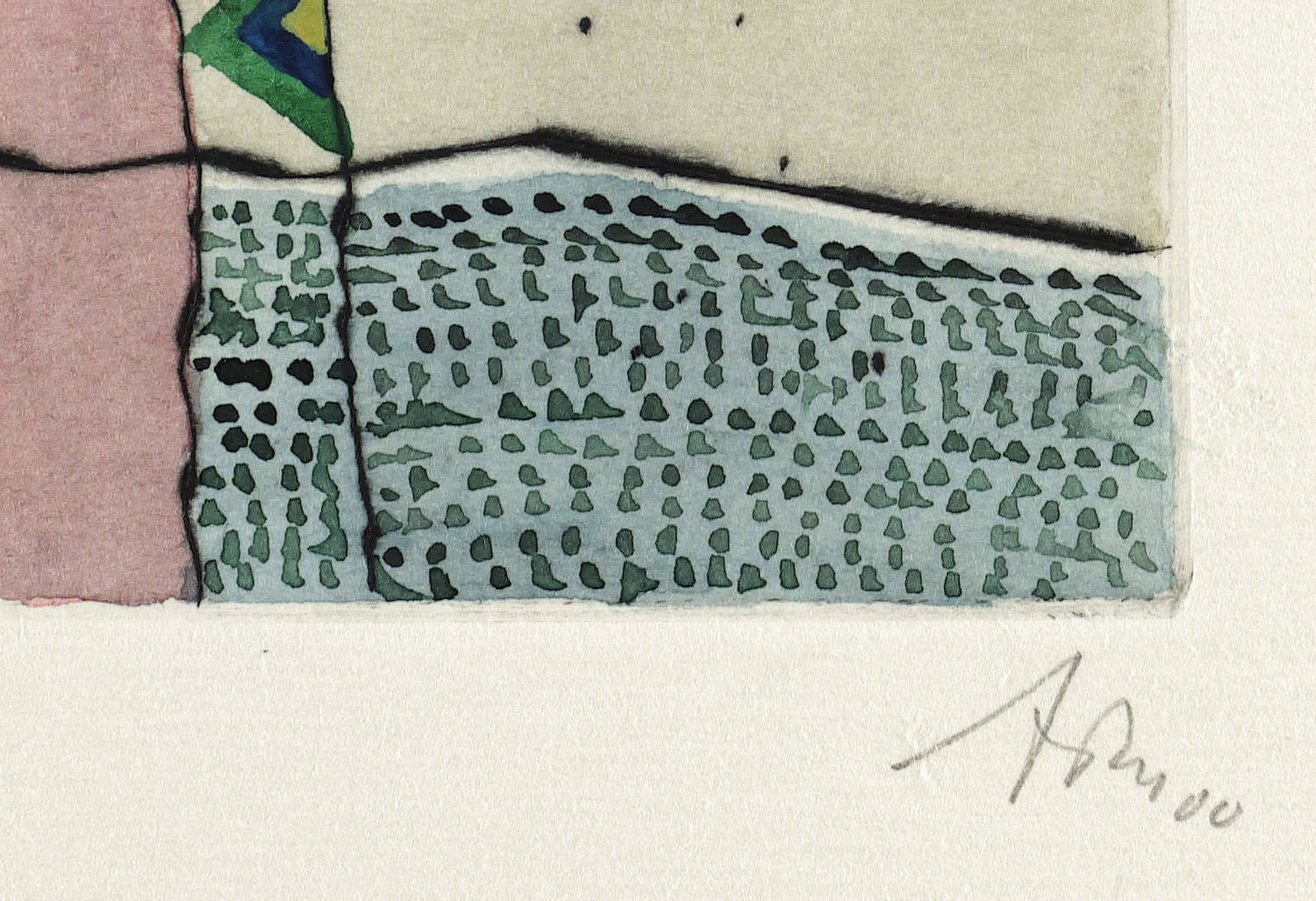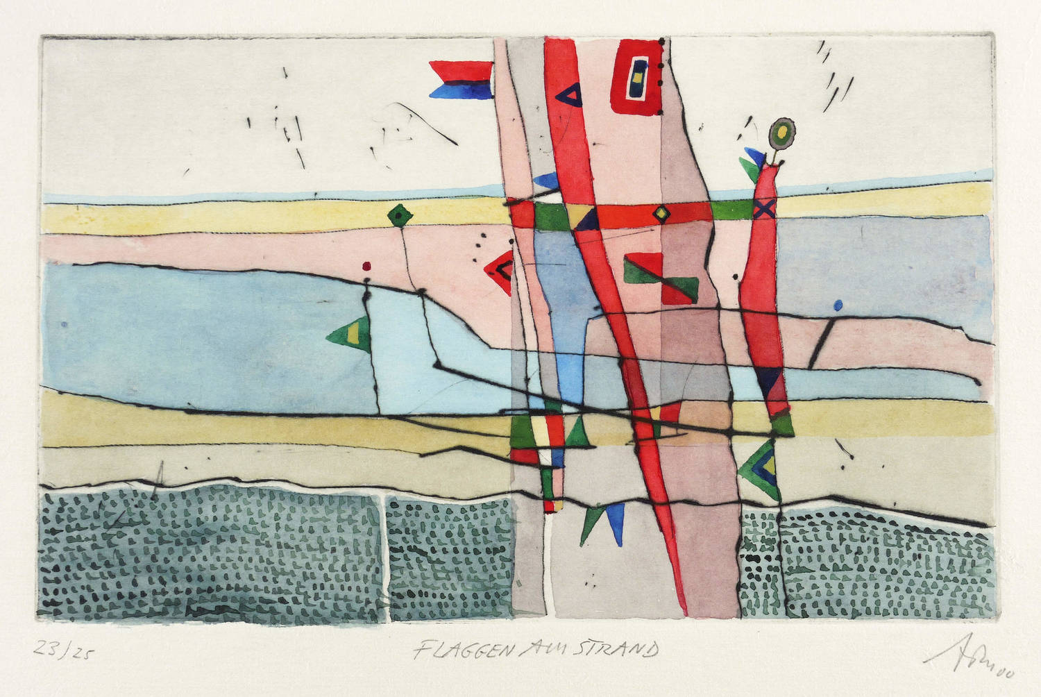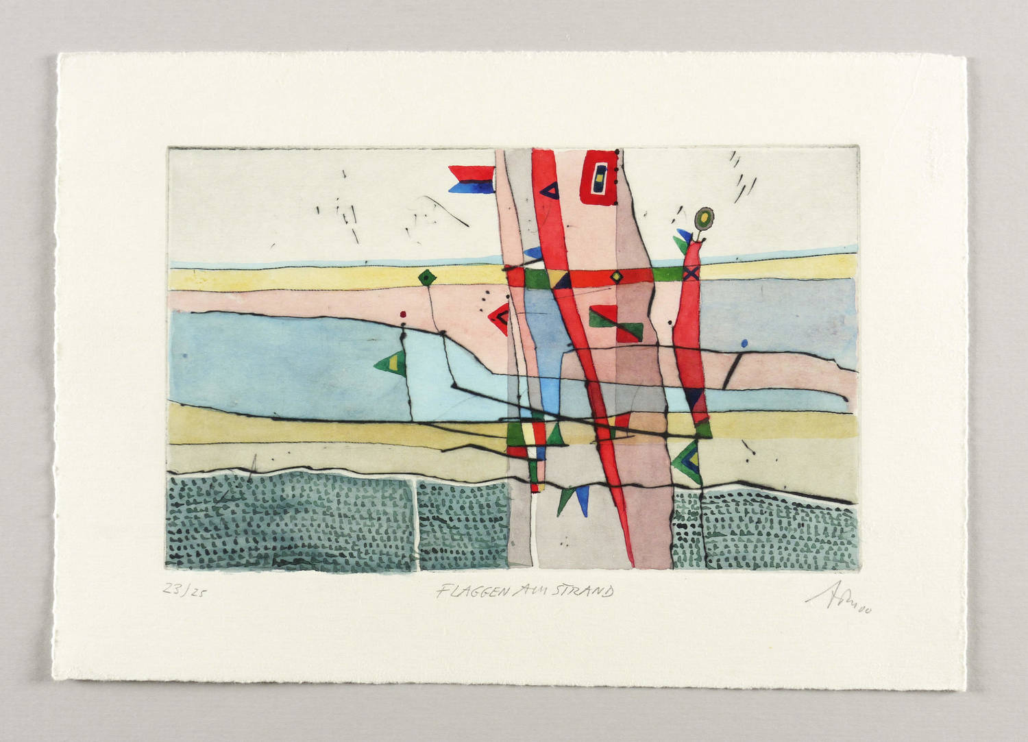 Mörstedt G 344. – Rechts unten in Bleistift signiert und datiert: ″ATM 00″. Links Auflagenbezeichnung: ″23/25″. Mittig Titel: ″FLAGGEN AM STRAND″. – Schönes Exemplar. Farbfrisch und von allerbester Erhaltung. Sehr guter Zustand.
