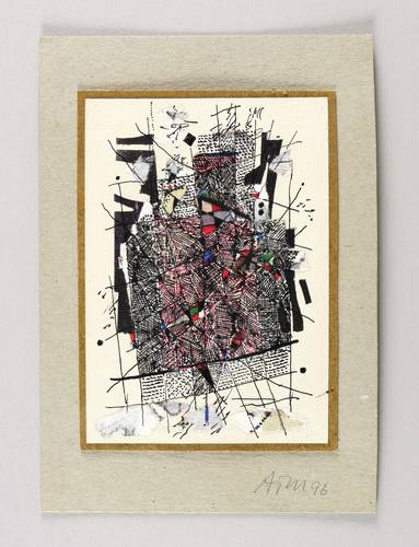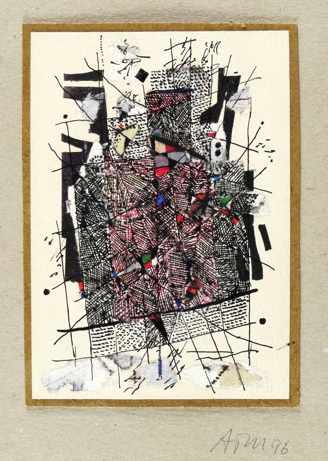 1996. Mischtechnik / Tusche, Papiercollage & Aquarell, auf gelblichem Karton. – Von Alfred Traugott Mörstedt. – 15,2 x 10,5 cm (Darstellung / Blatt), 21 x 15 cm (Trägerkarton).