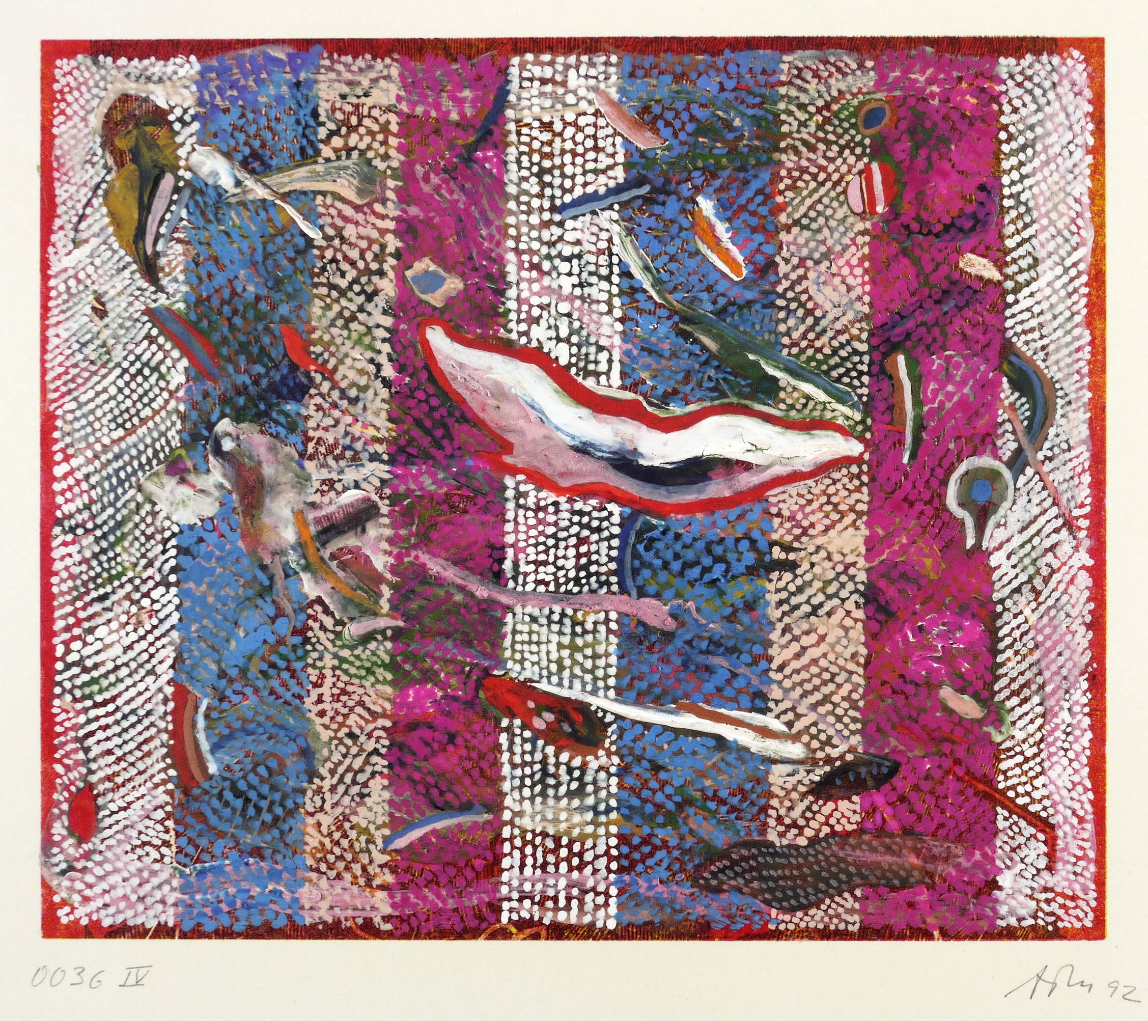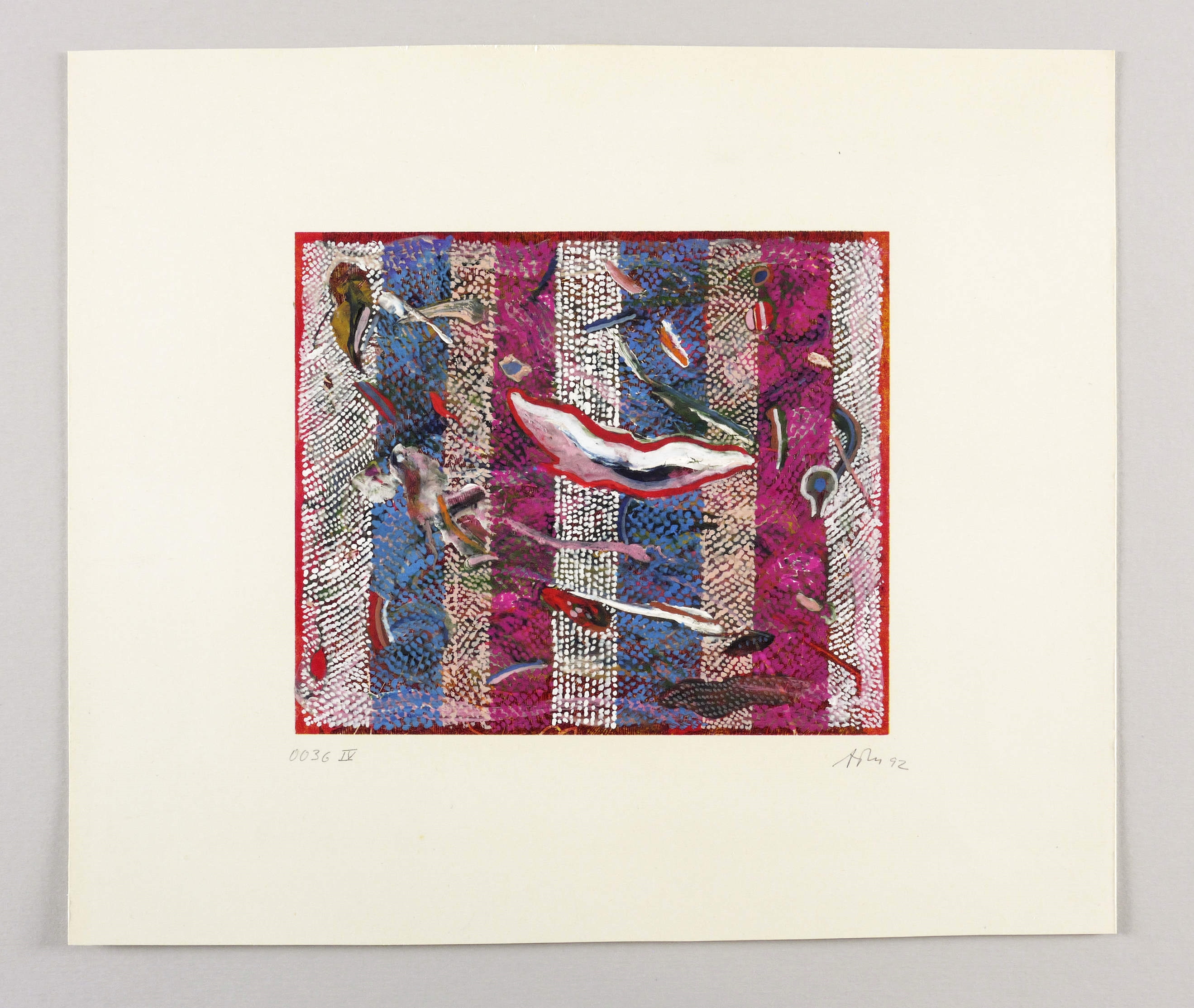 Rechts unten in Bleistift signiert und datiert: ″ATM 92″. Links Werk-Nr.: ″0036 IV″. Verso nochmals Werk-Nr., dazu Titel: ″ENTSTEHUNGSGESCHICHTEN″. – Unikat. – Rückseitig Montagespuren. Sonst ohne Mangel. Guter Zustand.