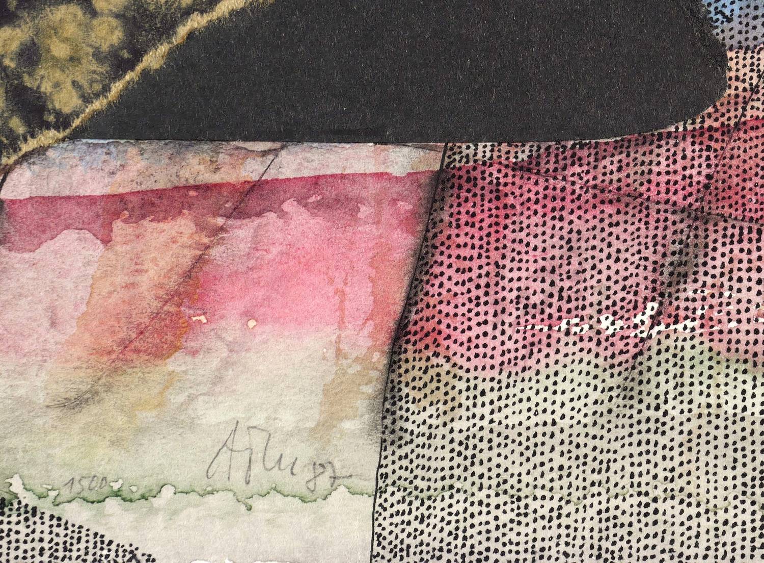 WVZ 1500. – Im unteren Rand der Darstellung in Bleistift signiert und datiert: ″ATM 87″. Links Werk-Nr.: ″1500″. Verso weiter bezeichnet mit Werk-Nr. und Titel: ″1500 / DAS WESEN DER DUNKELGRÜNEN JAHRESZEIT″. – Unikat. – Rückseitig Montagereste. Tadellos erhalten. Sehr guter Zustand.