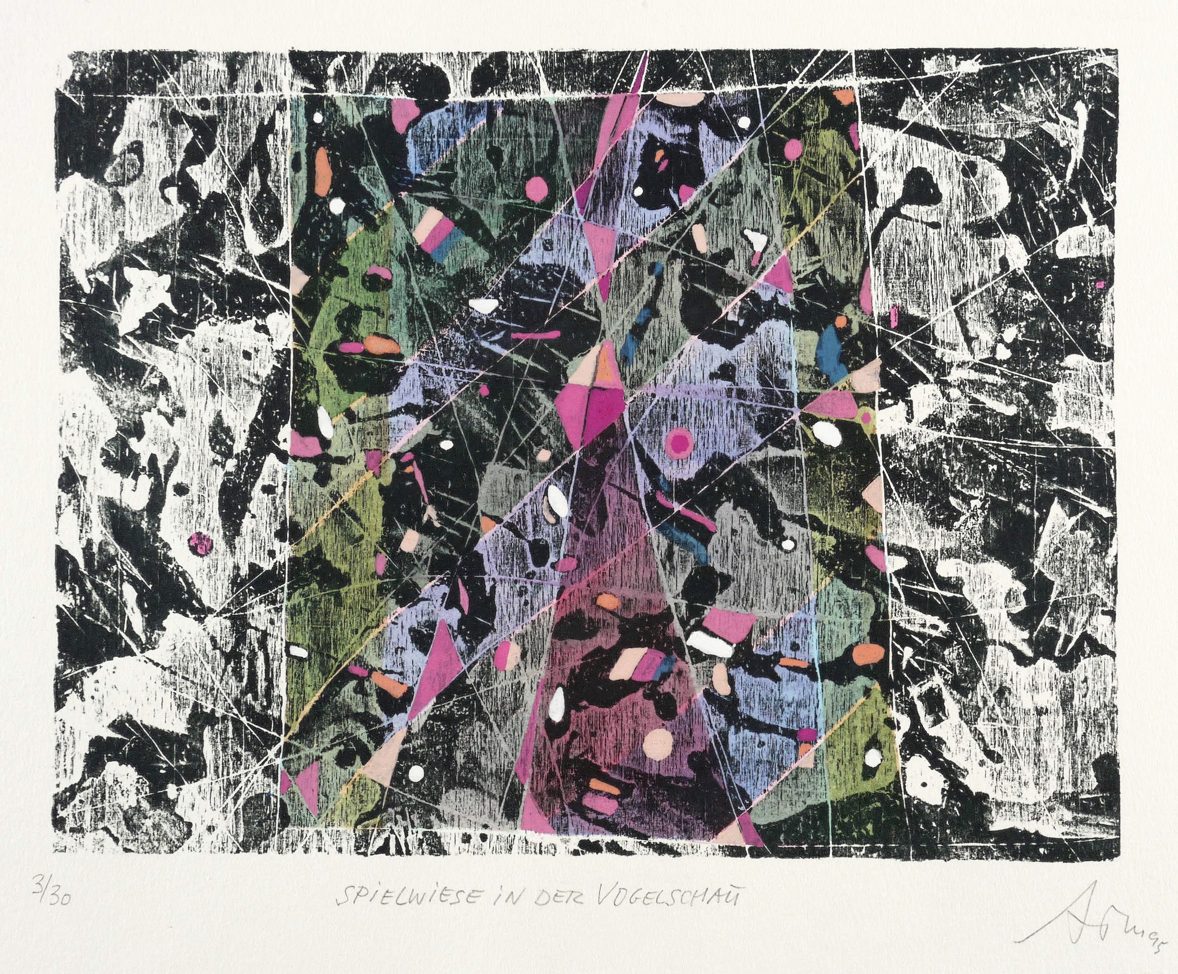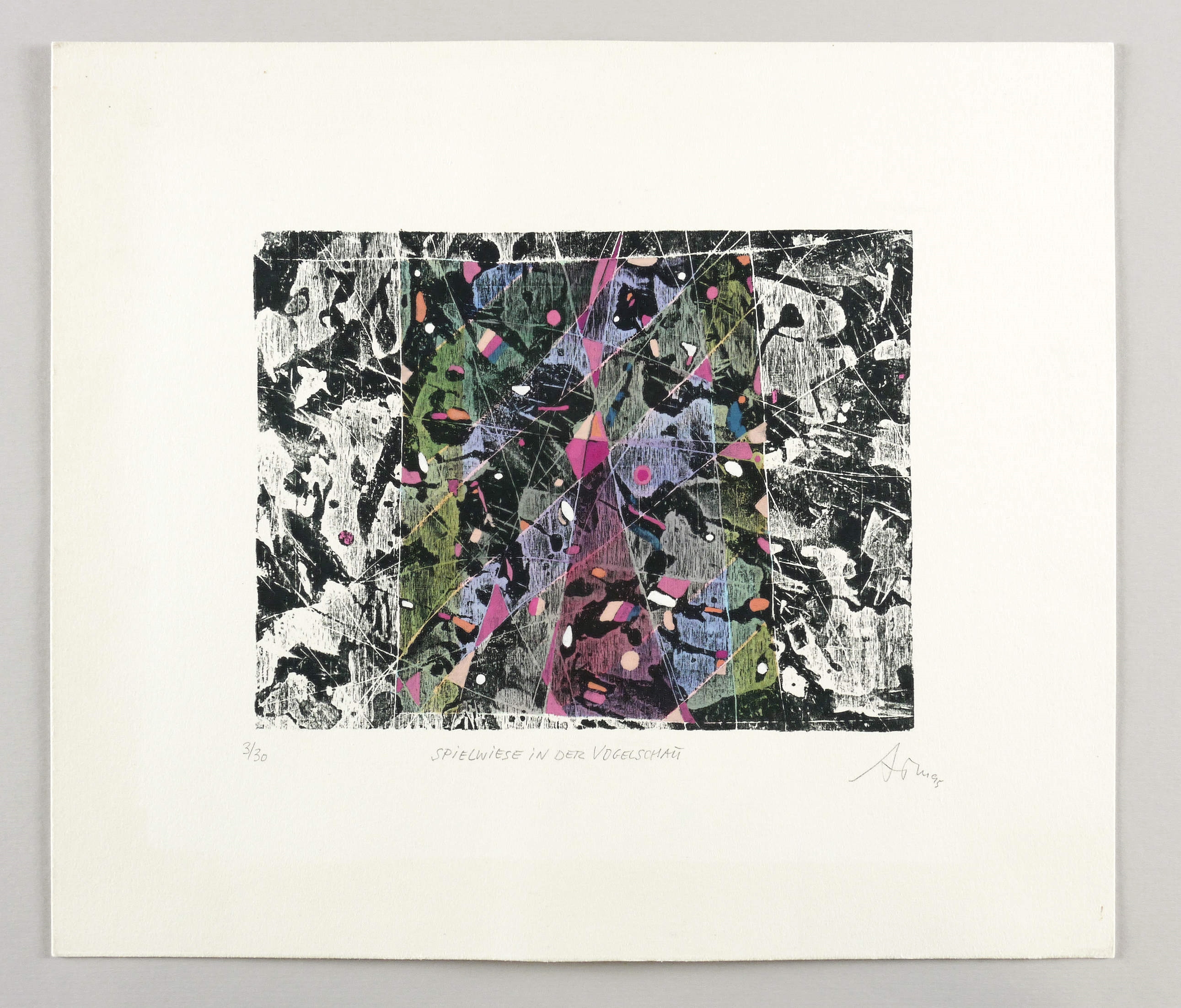 Mörstedt G 299. – Rechts unten in Bleistift signiert und datiert: ″ATM 95″. Links Auflagenbezeichnung: ″3/30″. Mittig Titel: ″SPIELWIESE IN DER VOGELSCHAU″. – Im Werkverzeichnis falsch als Radierung beschrieben (Vgl. WVZ Mörstedt G 299, S. 69). – Originalrandiges Exemplar. Ecke rechts unten minimal bestoßen. Farbfrisch und kontrastreich. Guter Zustand.