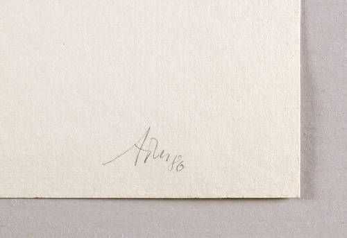 1986. Lithografie / Feder- & Pinsellithografie, in Schwarz, aquarelliert, auf hellgelbem Maschinenbütten. – Von Alfred Traugott Mörstedt. – Künstlerexemplar (e.a.). – 31,1 x 19,2 cm (Darstellung), 47 x 32 cm (Blatt).