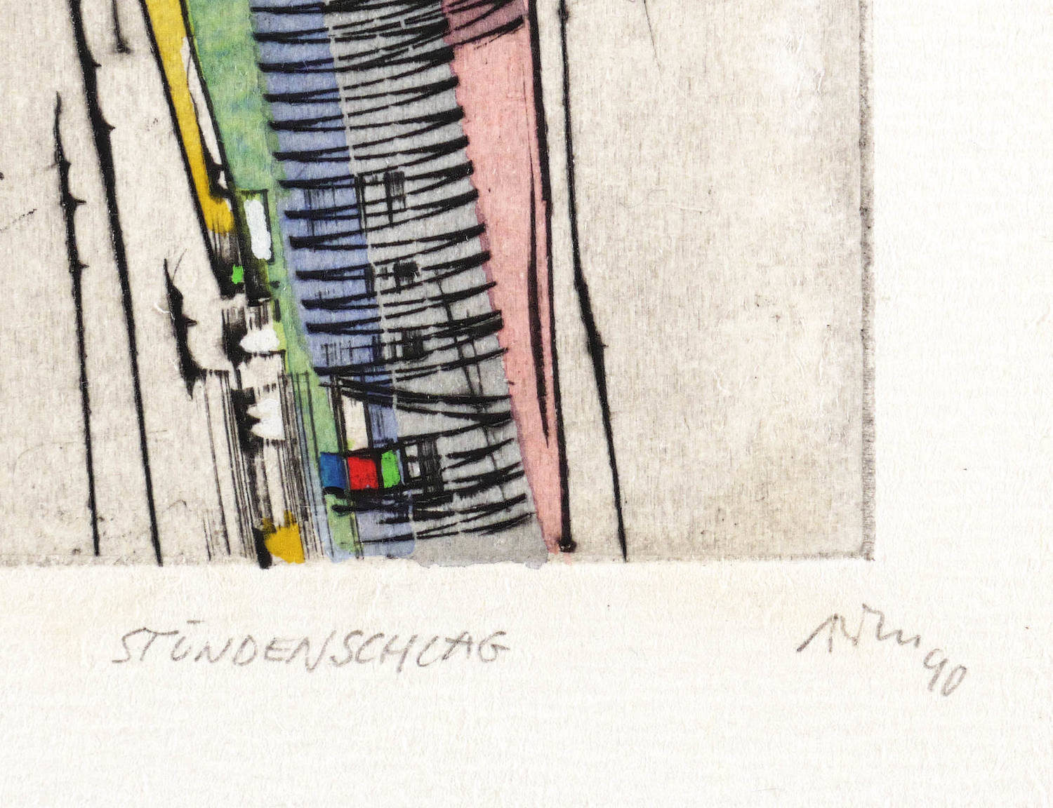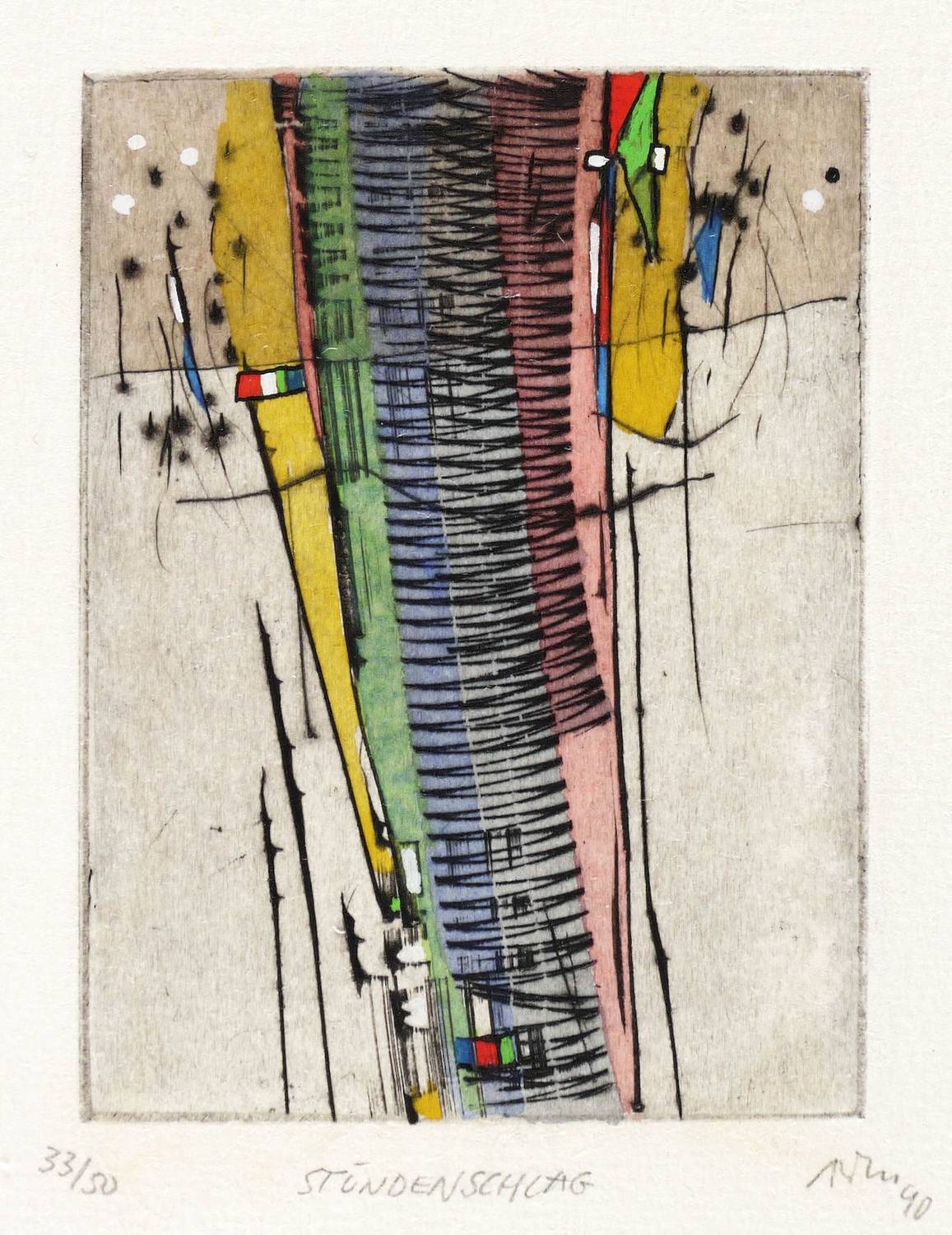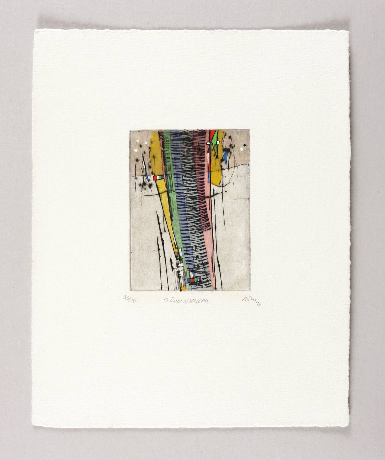Mörstedt G 243. – Rechts unten in Bleistift signiert und datiert: ″ATM 90″. Links Auflagenbezeichnung: ″33/50″. Mittig Titel: ″STUNDENSCHLAG″. – Unbeschnittenes Exemplar. Sehr guter Zustand.