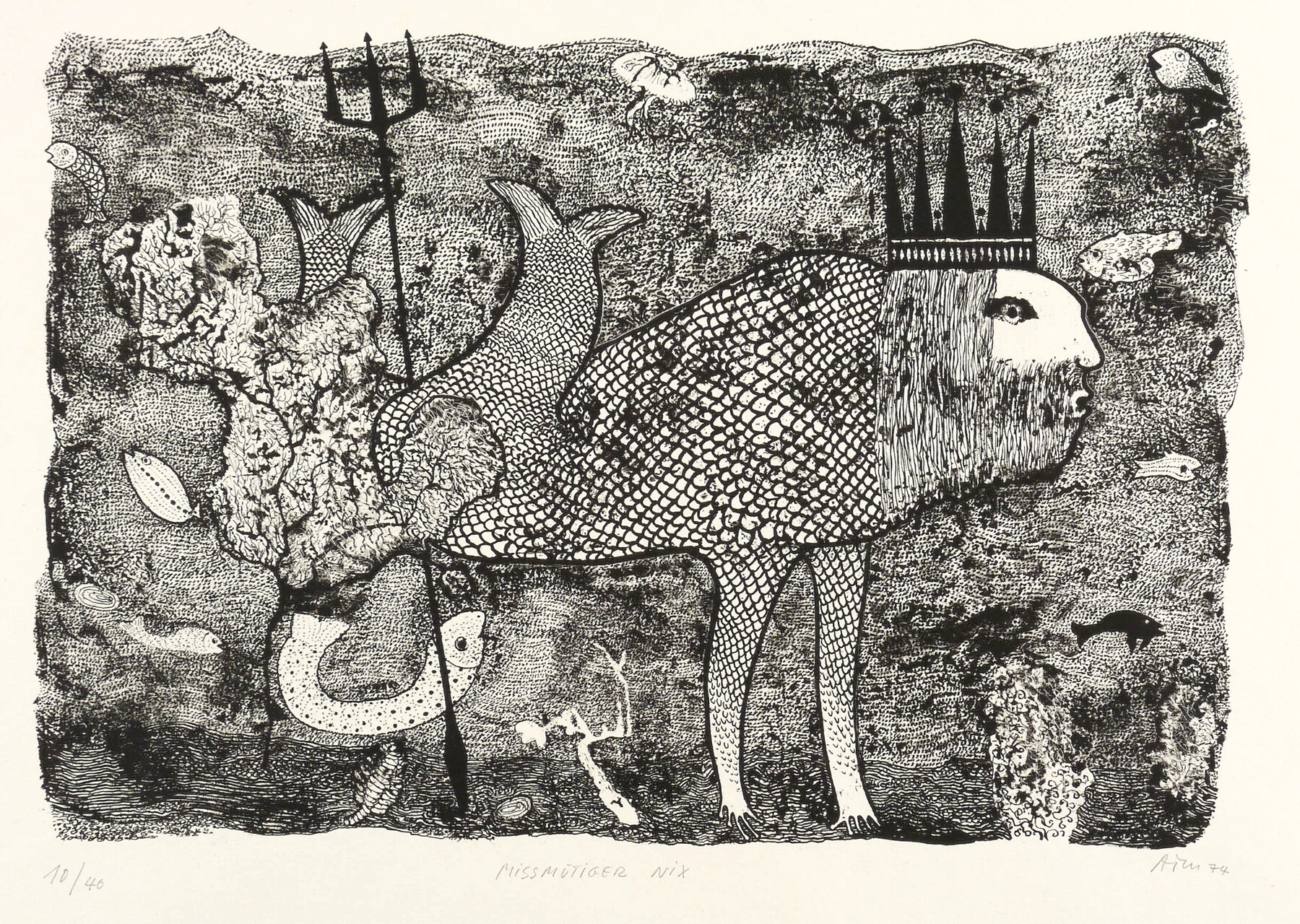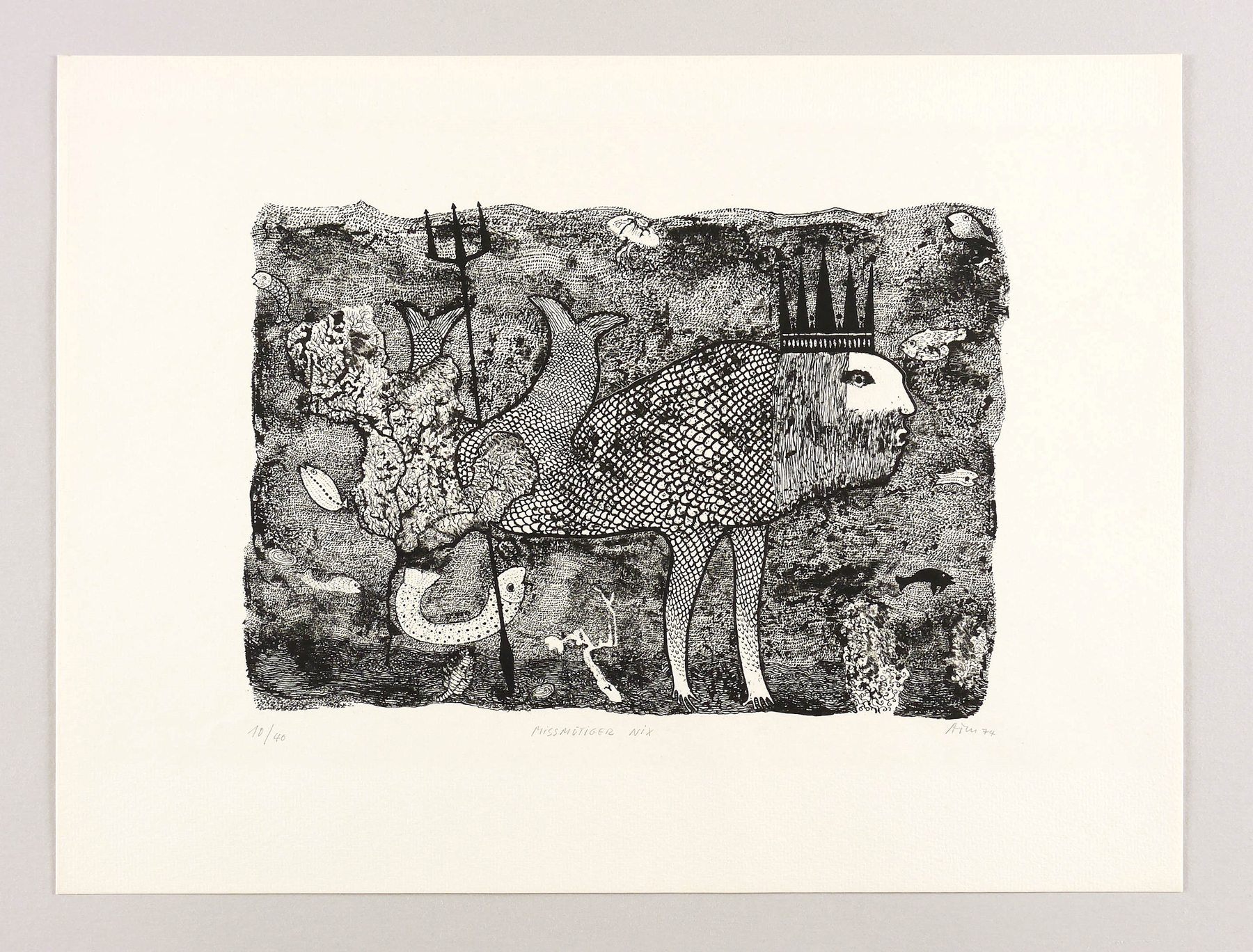 Mörstedt G 65. – Aus: Alfred Traugott Mörstedt, Mitgeschöpfe. 8 Lithographien um das Getier (Erfurt: Eigenverlag 1974). – Rechts unten in Bleistift mit Monogramm signiert und datiert. Links Auflagenbezeichnung. Mittig Titel. – Sehr gut erhalten.