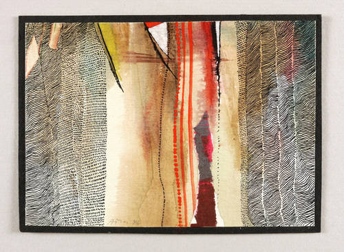 1986. Mischtechnik / Aquarell, Tusche & Papiercollage, auf hellgelbem Aquarellkarton. – Originale Künstlergrafik, von Alfred Traugott Mörstedt. – Unikat. – 10,5 x 14,7 cm (Darstellung / Blatt), 11,3 x 15,4 cm (Trägerkarton).