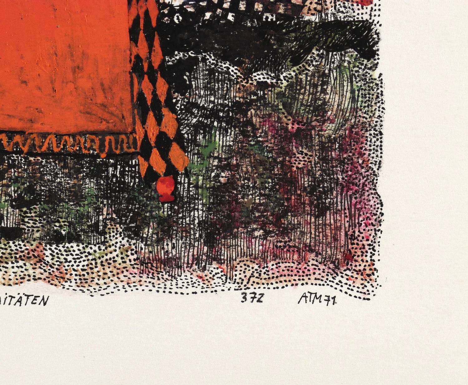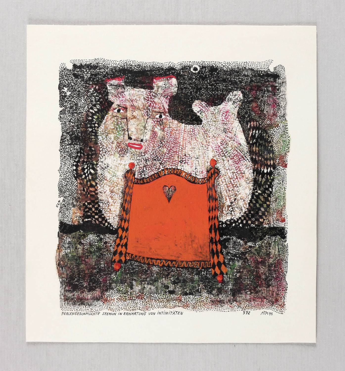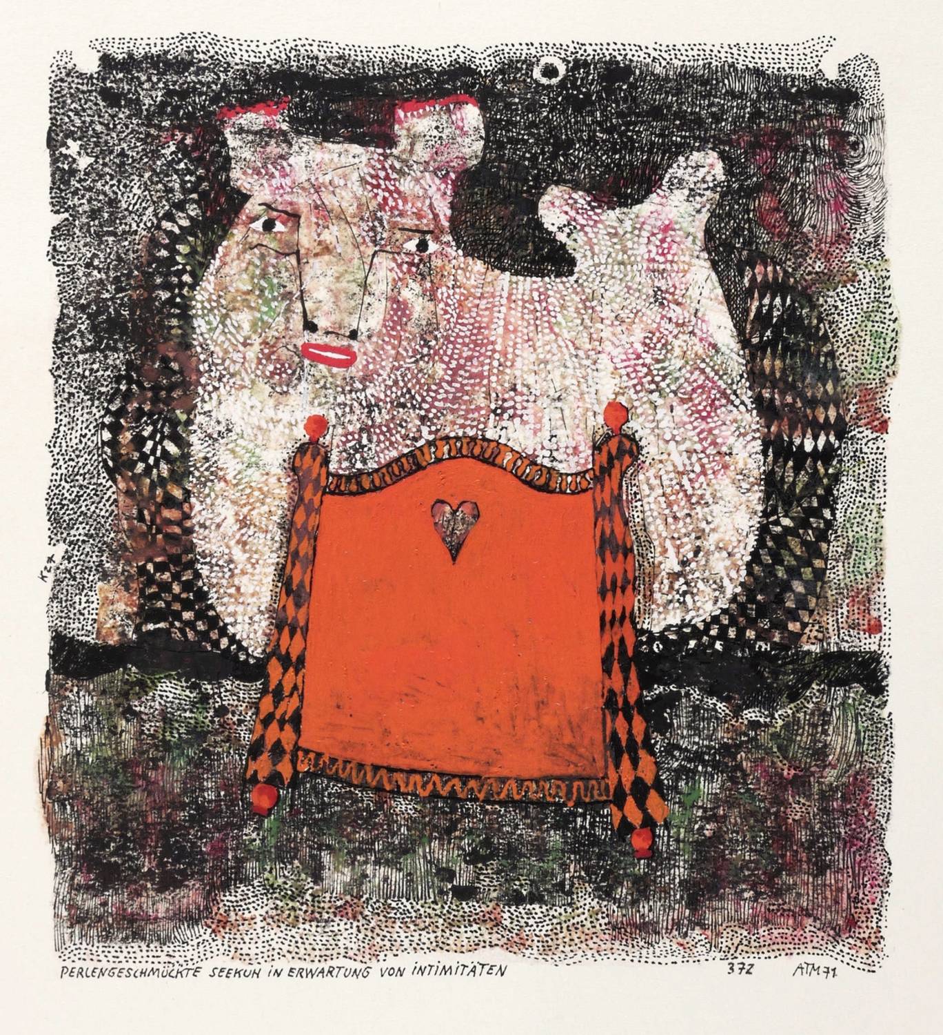 WVZ 372. – Rechts unten in schwarzer Feder monogrammiert und datiert: ″ATM 71″. Links bezeichnet: ″PERLENGESCHMÜCKTE SEEKUH IN ERWARTUNG VON INTIMITÄTEN″. – Sehr guter Zustand.