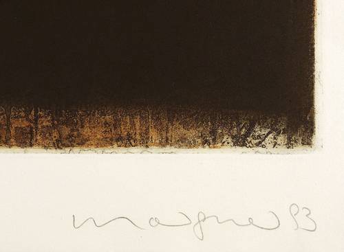 1993. Farbradierung / Aquatinta, in Schwarz und Braun, auf Hahnemühle-Bütten. – Originale Künstlergrafik, von Michael Morgner. – 64,3 x 48,6 cm (Darstellung / Platte), 72 x 54 cm (Blatt).