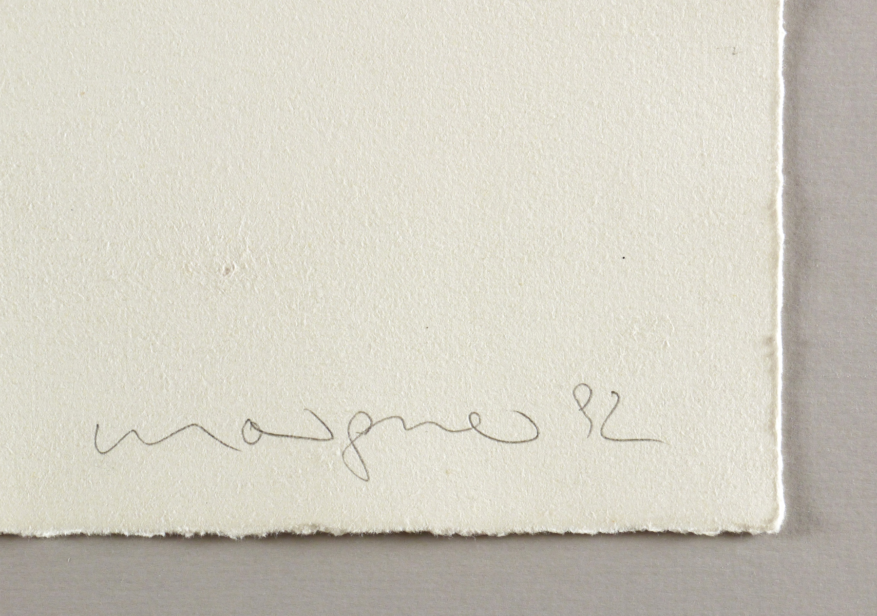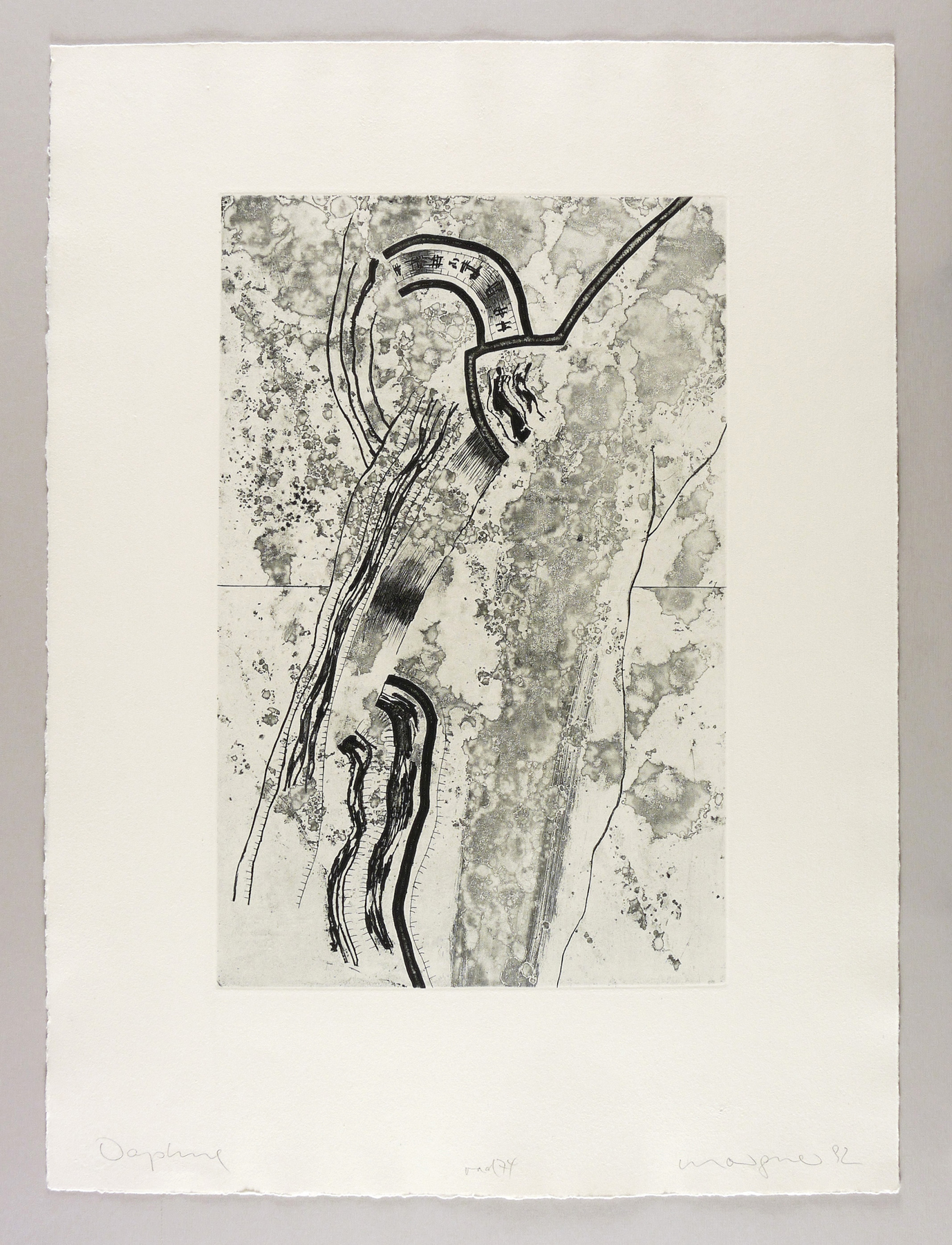 Werner-Juppe 4/75 II b. Griffelkunst 265 C6. – Rechts unten in Bleistift signiert und datiert: ″morgner 92″. Links Titel: ″Daphne″. Mittig bezeichnet: ″rad 74″. Verso Auswahl-Nr. der Griffelkunst. – Unter Verwendung der schon 1974 radierten und inzwischen korrodierten Platte druckte Morgner 1991/92 nach nochmaligem Ätzen eine neue Auflage, hier für die Griffelkunst- Vereinigung Hamburg-Langenhorn. – Kleine beriebene Partie im unteren Rand rechts. Sonst tadelloses Exemplar. Mäßig guter bis guter Zustand.