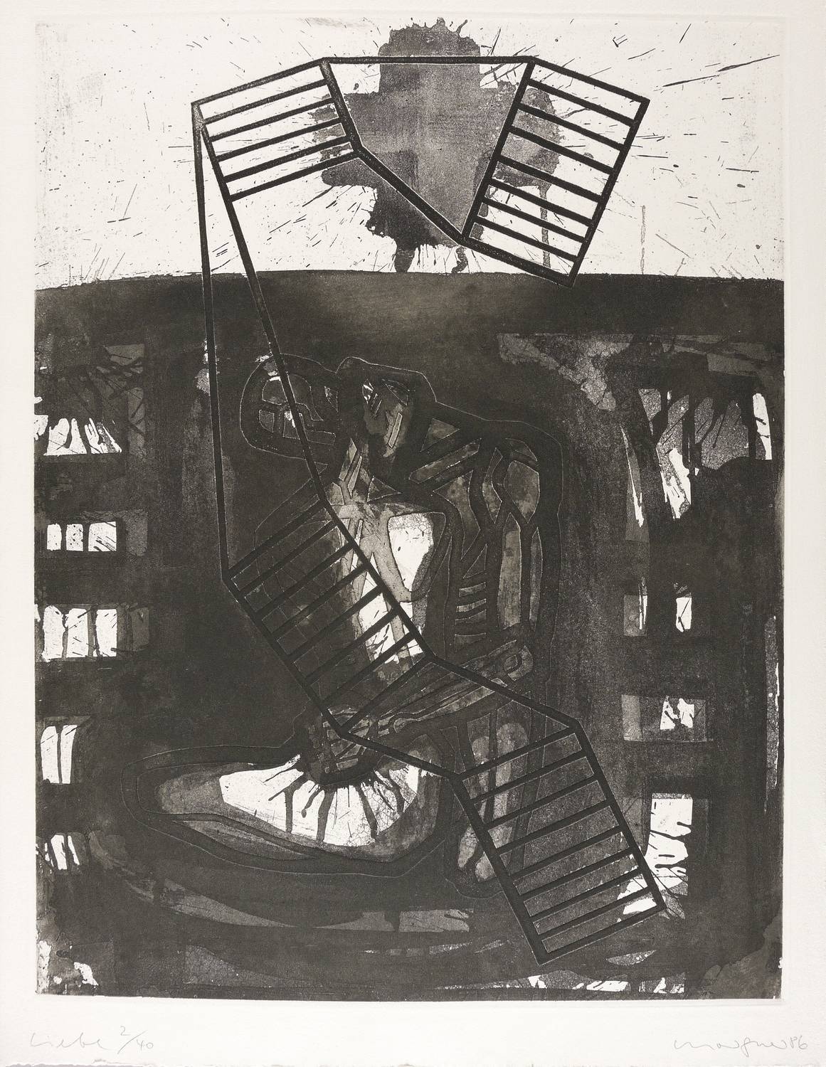 1986. Radierung / Aquatinta, Reservage & Prägedruck, in Schwarz, auf schwerem hellchamois Hahnemühle. – Originale Künstlergrafik, von Michael Morgner. – Auflage Exemplar Nr. 2/40. – 63,9 x 48,6 cm (Darstellung / Platte), 71 x 55 cm (Blatt).