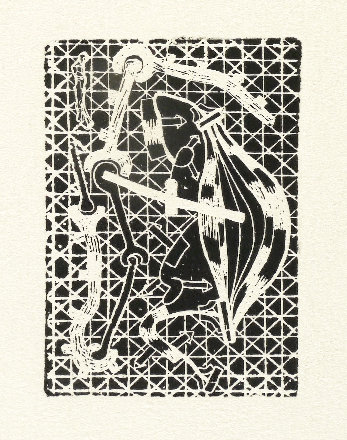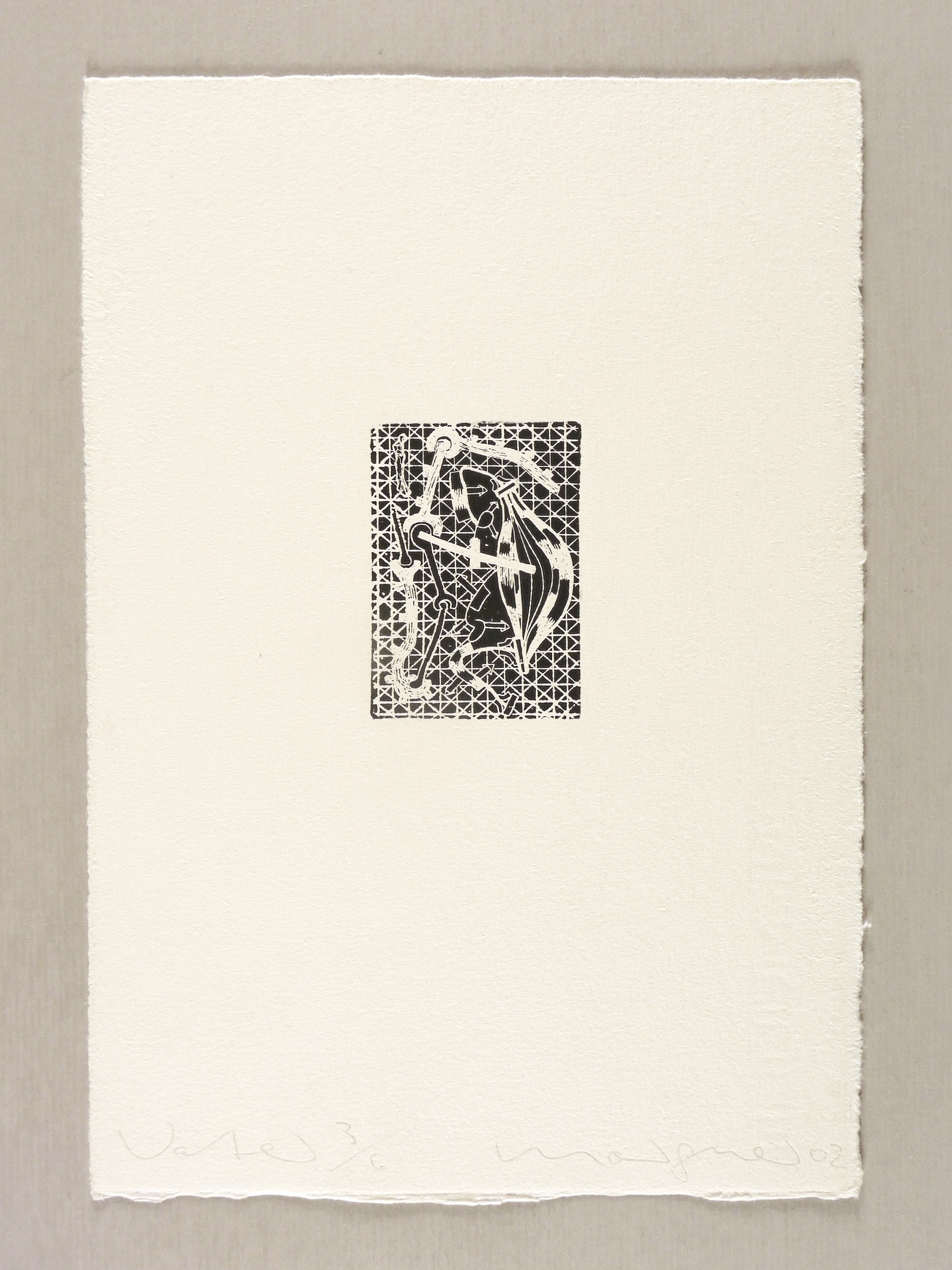 2002. Radierung / Strichätzung, im Hochdruck, in Schwarz, auf schwerem hellchamois Hahnemühle. – Originale Künstlergrafik, von Michael Morgner. – Auflage Exemplar Nr. 3/6. – 6,9 x 5,0 cm (Darstellung / Druckbild), 27 x 19 cm (Blatt).