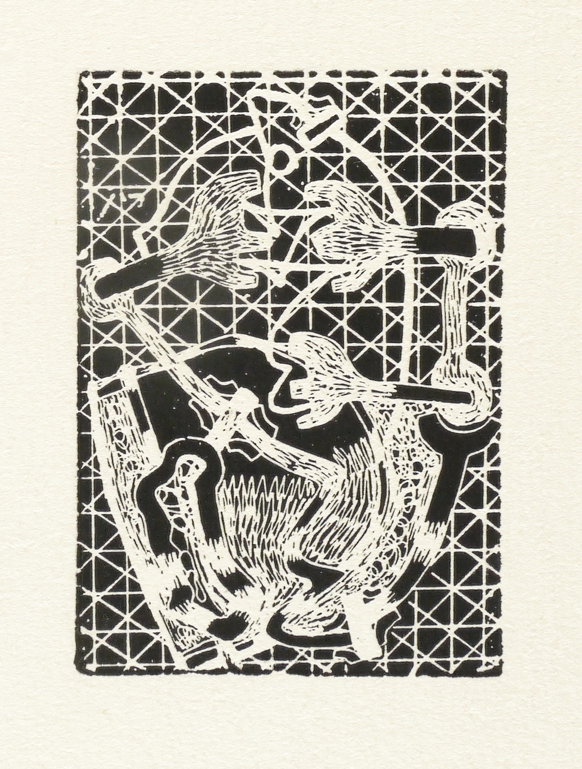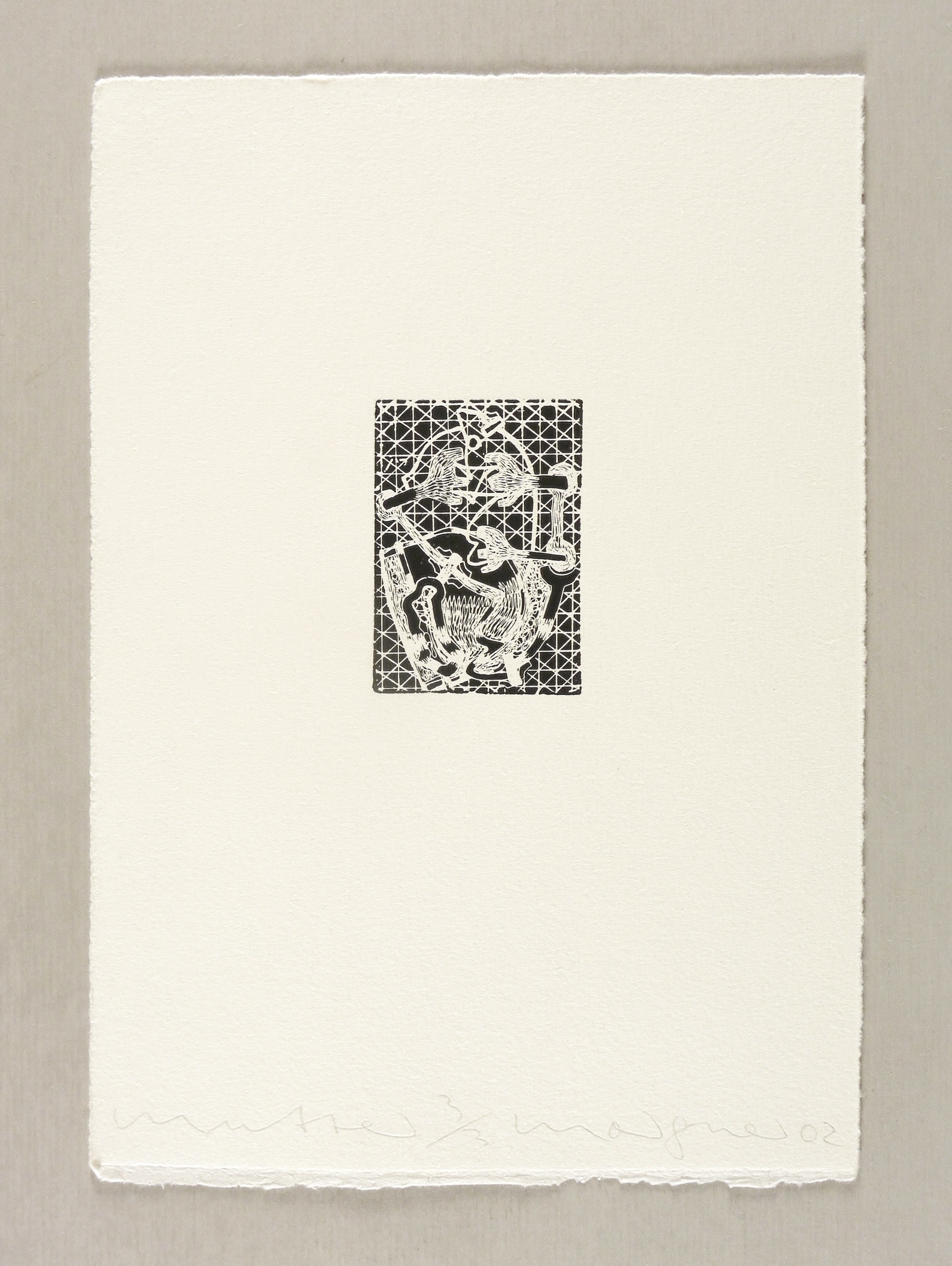 2002. Radierung / Strichätzung, im Hochdruck, in Schwarz, auf schwerem hellchamois Hahnemühle. – Originale Künstlergrafik, von Michael Morgner. – Auflage Exemplar Nr. 3/3. – 7,0 x 5,0 cm (Darstellung / Druckbild), 27 x 19 cm (Blatt).