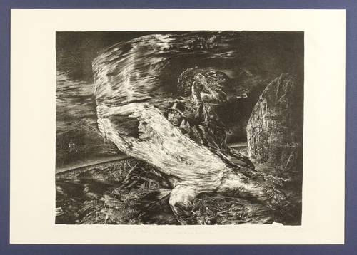 Rolf Münzner (1942 Geringswolde, lebt und arbeitet in Geithain bei Leipzig). Deutscher Zeichner und Grafiker. 1956-60 Lehre und Arbeit als Maschinenschlosser in Leisnig. 1960-62 besucht er Abendkurse an der Hochschule für Grafik und Buchkunst in Leipzig (HGB). 1962-67 Studium der Grafik und Illustration an der HGB u.a. bei Werner Tübke. 1969-72 Aspirantur. 1973-92 Lehrauftrag für Aktzeichnen und Illustration an der HGB. Seit 1990 Leiter der Werkstatt für Lithografie. Seit 1992 Professor. Seine skurrilen Figuren und bewegungsreichen Phantasiewelten werden in der seltenen Technik der Asphaltschabmanier im Steindruck umgesetzt. Detailreichtum und gesteigerte Virtuosität charakterisieren sein Werk ebenso wie eine Vorliebe für literarische Themen, denen er jeweils kongeniale Schöpfungen an die Seite stellt.