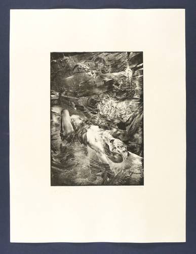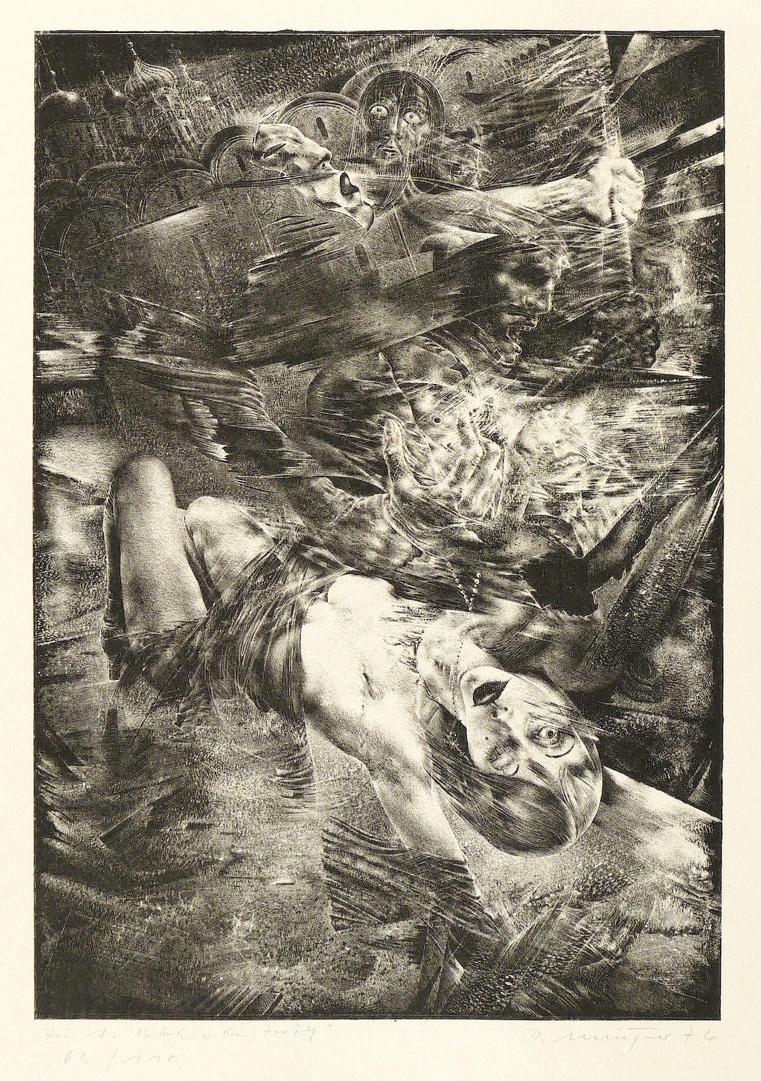 Rolf Münzner (1942 Geringswolde, lebt und arbeitet in Geithain bei Leipzig). Deutscher Zeichner und Grafiker. 1956-60 Lehre und Arbeit als Maschinenschlosser in Leisnig. 1960-62 besucht er Abendkurse an der Hochschule für Grafik und Buchkunst in Leipzig (HGB). 1962-67 Studium der Grafik und Illustration an der HGB u.a. bei Werner Tübke. 1969-72 Aspirantur. 1973-92 Lehrauftrag für Aktzeichnen und Illustration an der HGB. Seit 1990 Leiter der Werkstatt für Lithografie. Seit 1992 Professor. Seine skurrilen Figuren und bewegungsreichen Phantasiewelten werden in der seltenen Technik der Asphaltschabmanier im Steindruck umgesetzt. Detailreichtum und gesteigerte Virtuosität charakterisieren sein Werk ebenso wie eine Vorliebe für literarische Themen, denen er jeweils kongeniale Schöpfungen an die Seite stellt.
