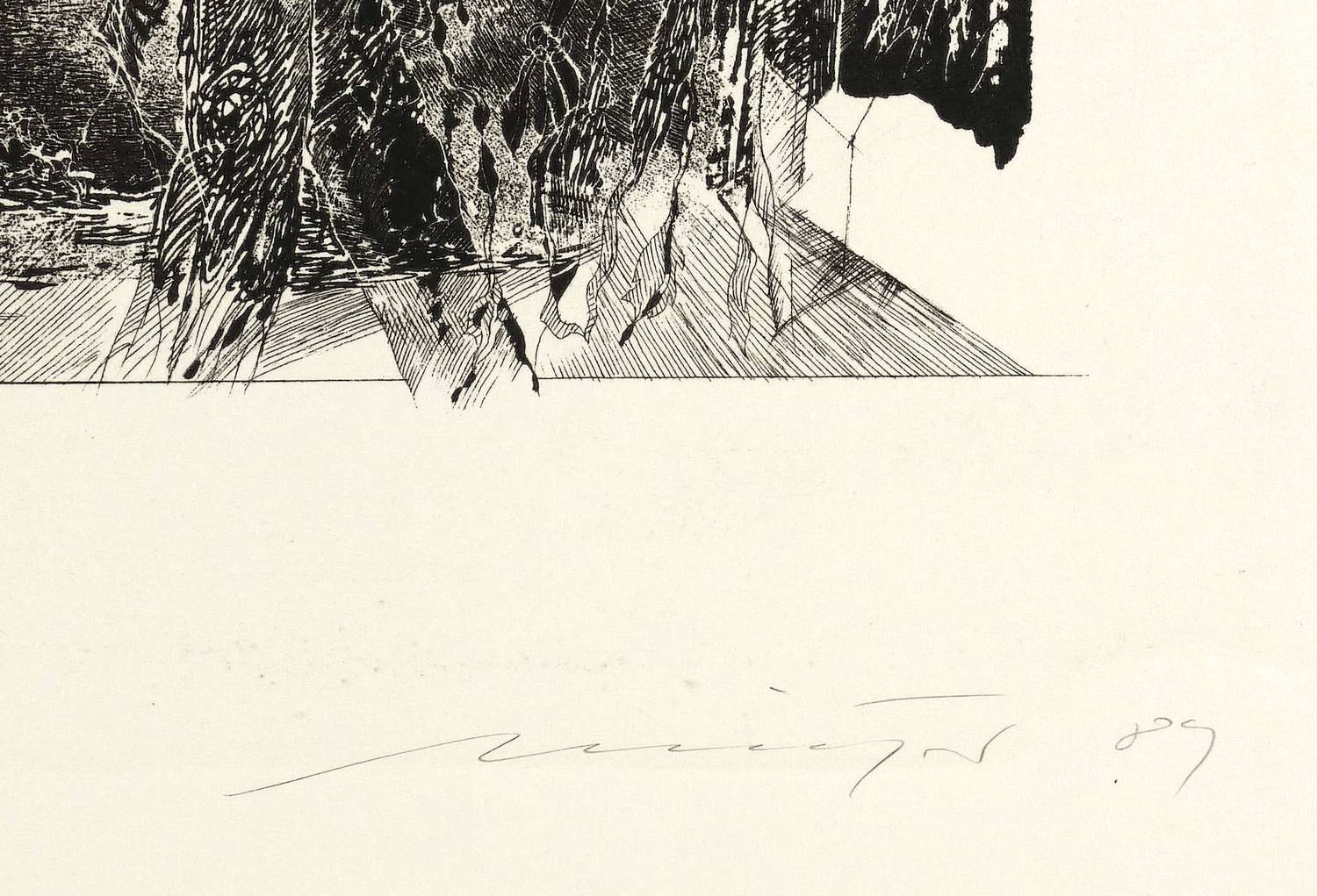 1989. Lithografie / Schablithografie, in Schwarz, auf glattem hellgelbem Karton. – Von Rolf Münzner. – Druckerexemplar. – 30,7 x 21,2 cm (Darstellung), 50 x 35 cm (Blatt).