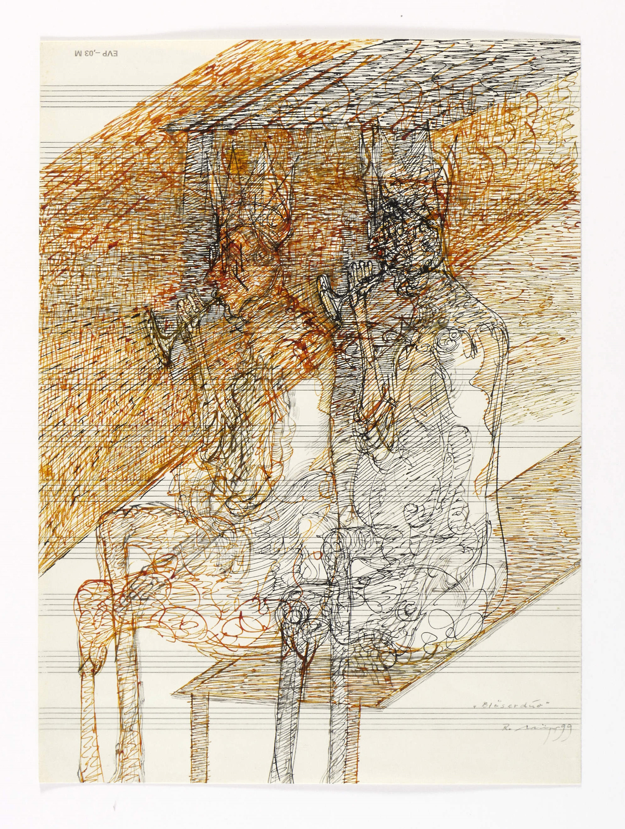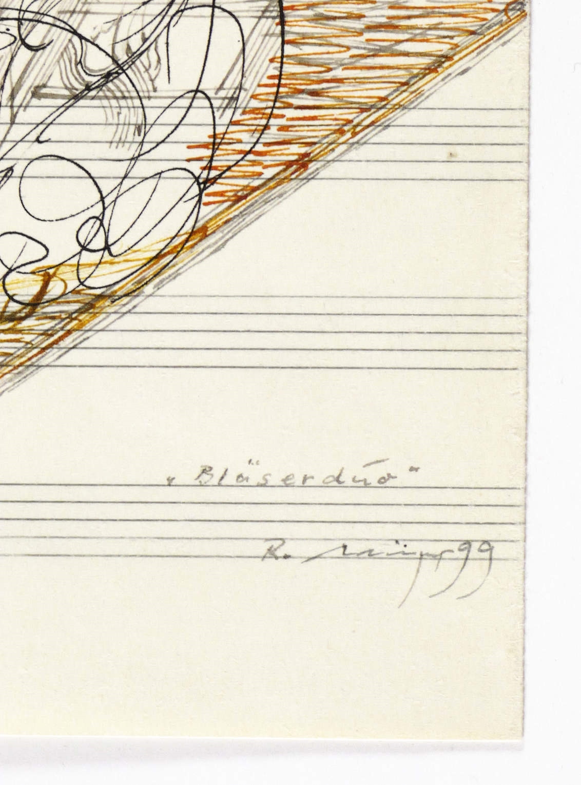 1999. Zeichnung / Federzeichnung, in schwarzer & brauner Tusche, auf Notenblatt. – Originale Künstlergrafik, von Rolf Münzner. – Unikat. – 29,0 x 21,0 cm (Darstellung / Blatt), 60 x 50 cm (Trägerblatt).